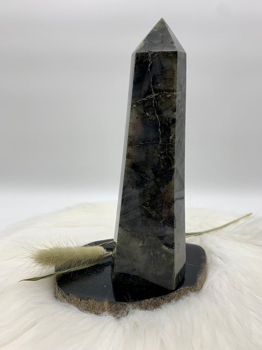 AusverkauftLabradorit Turm - grün/blau/orangener Flash