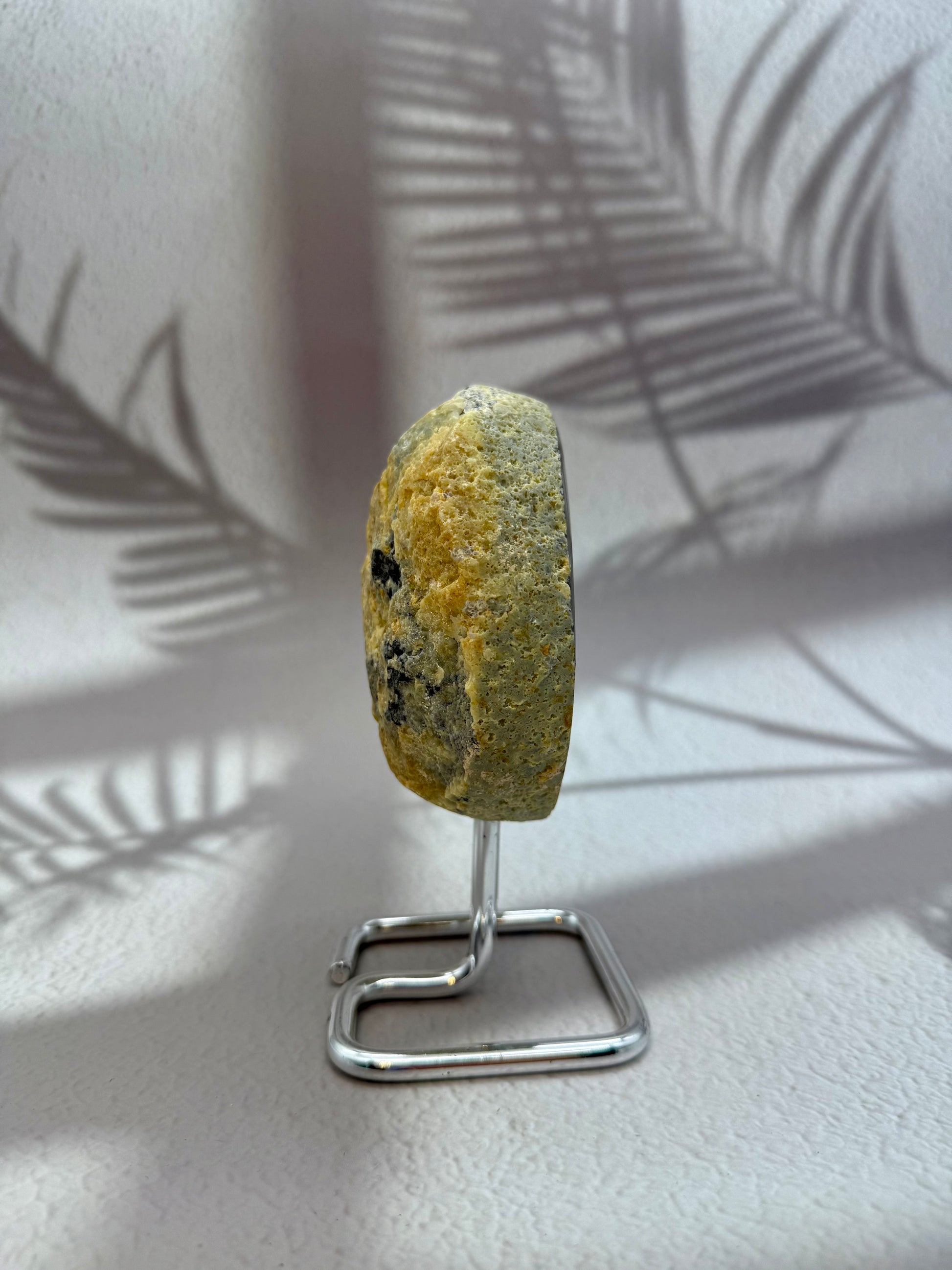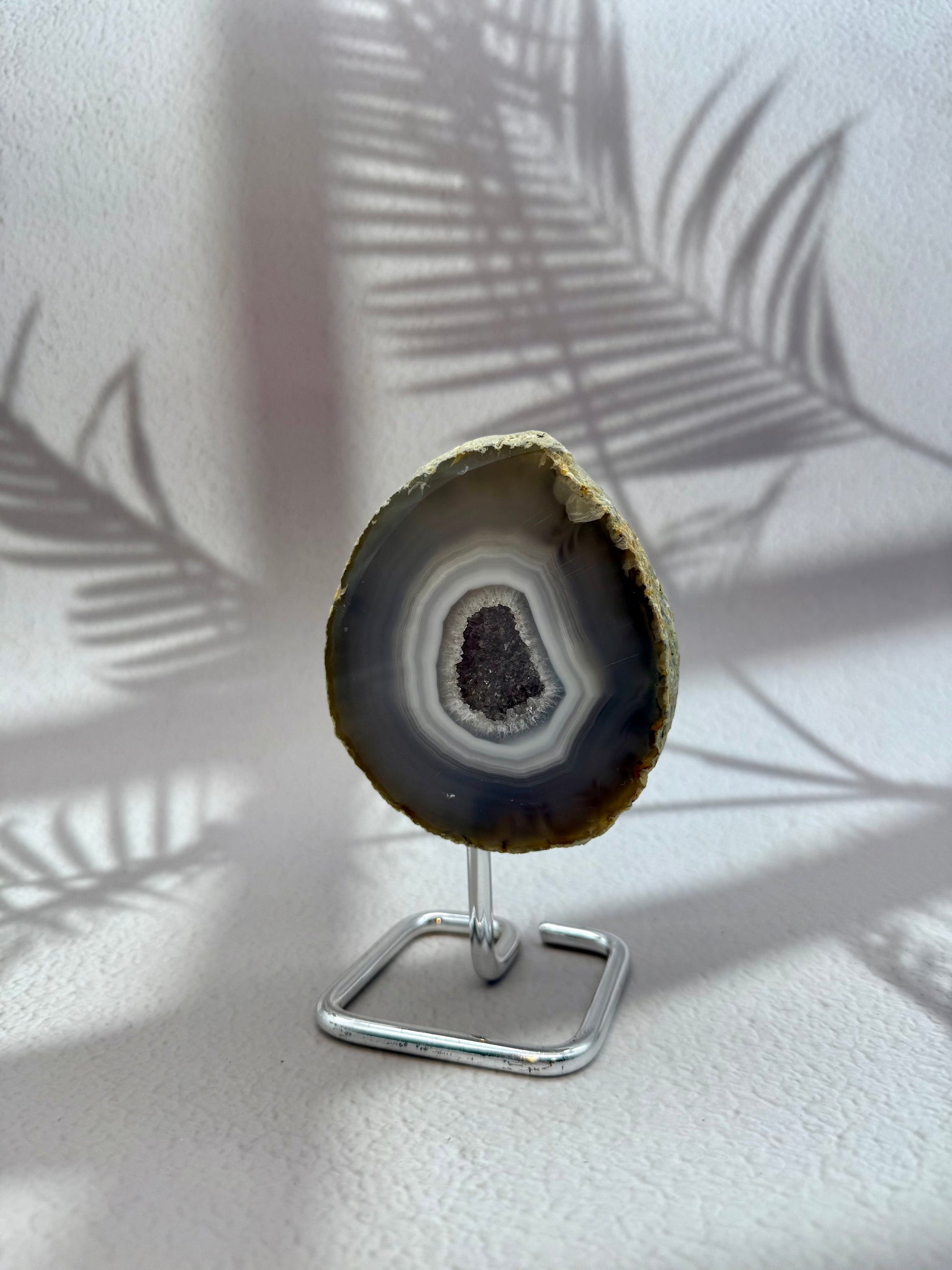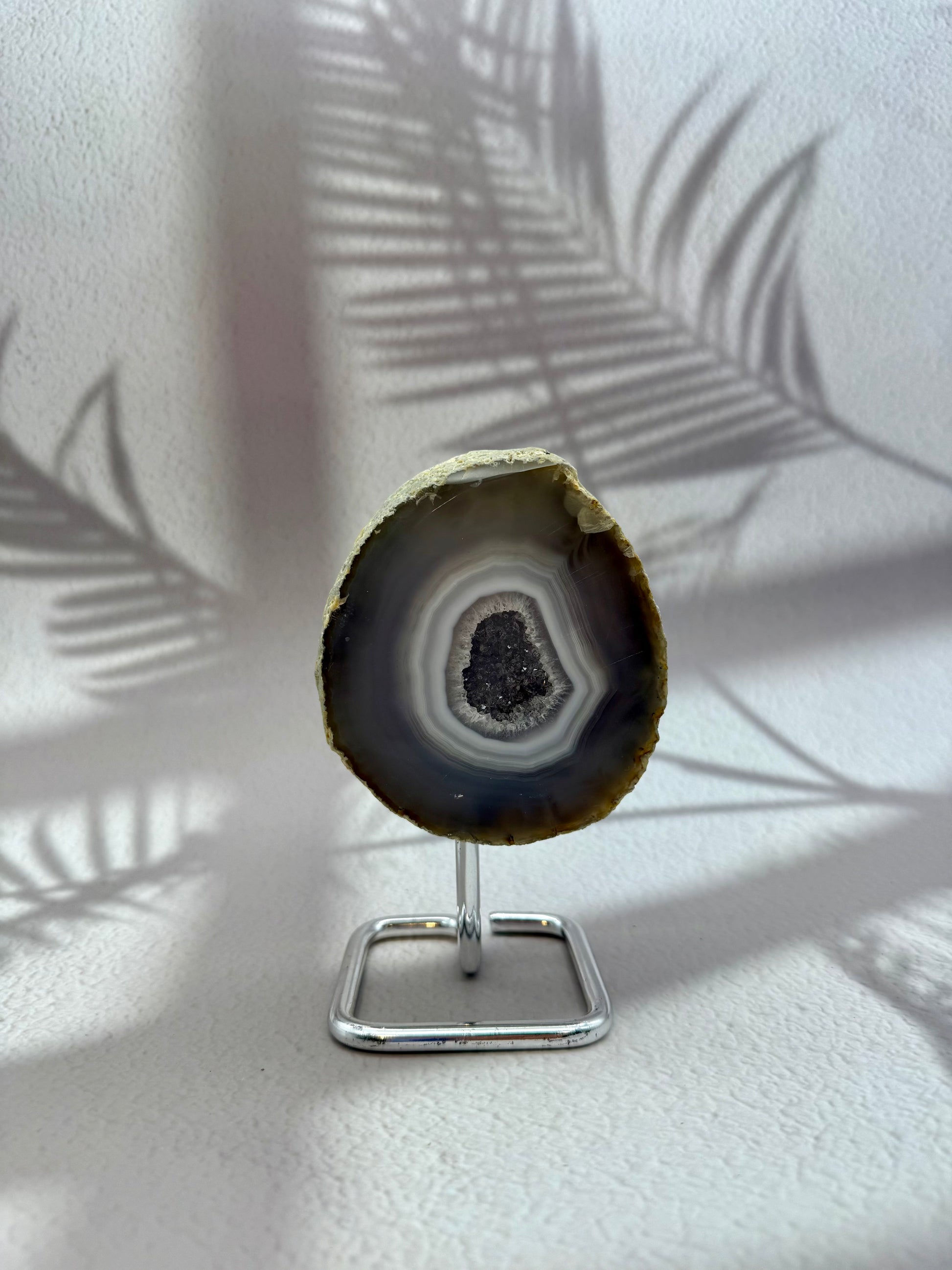 Dieser edle Achat auf einem stabilen Metallständer vereint die kraftvolle Ausstrahlung von Achat mit der faszinierenden Tiefe einer offenen Druse. Während die glatte Oberfläche Ruhe und Stabilität ausstrahlt, funkeln die Kristalle im Inneren geheimnisvoll im Licht – ein harmonisches Zusammenspiel, das diesen Stein zu einem echten Highlight macht. Auf dem Ständer präsentiert, wird er zu einem eleganten Dekostück und zugleich zu einem wirkungsvollen Energiespender.
