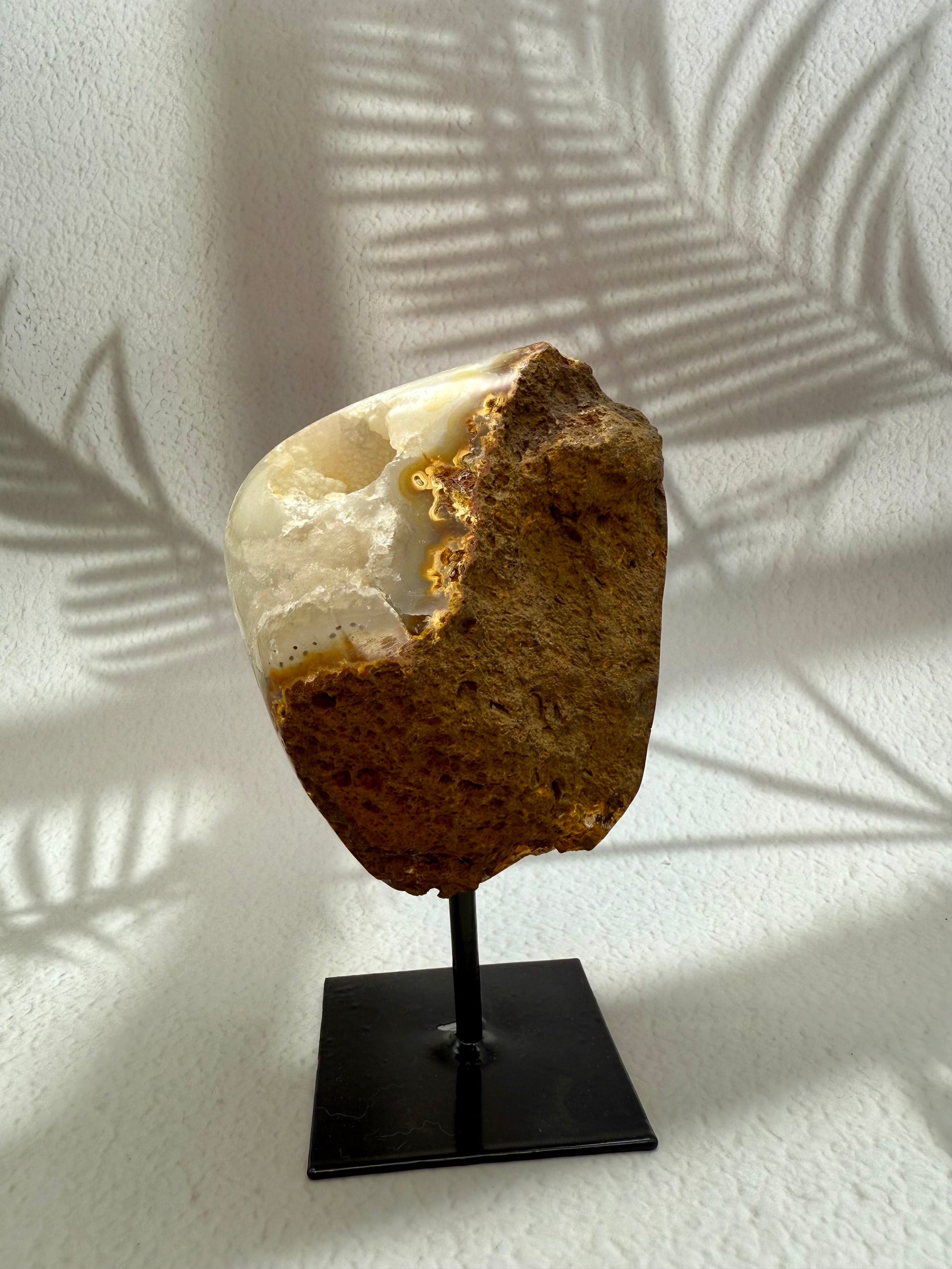 Dieser außergewöhnliche Glitzerachat auf einem edlen Metallständer vereint natürliche Erdung mit faszinierendem Glanz. Die funkelnden Kristallflächen schimmern im Licht und ziehen alle Blicke auf sich. Durch die stilvolle Präsentation auf dem Ständer wird der Achat nicht nur zu einem dekorativen Highlight, sondern auch zu einem wirkungsvollen Energiespender in deinem Zuhause oder Arbeitsraum.