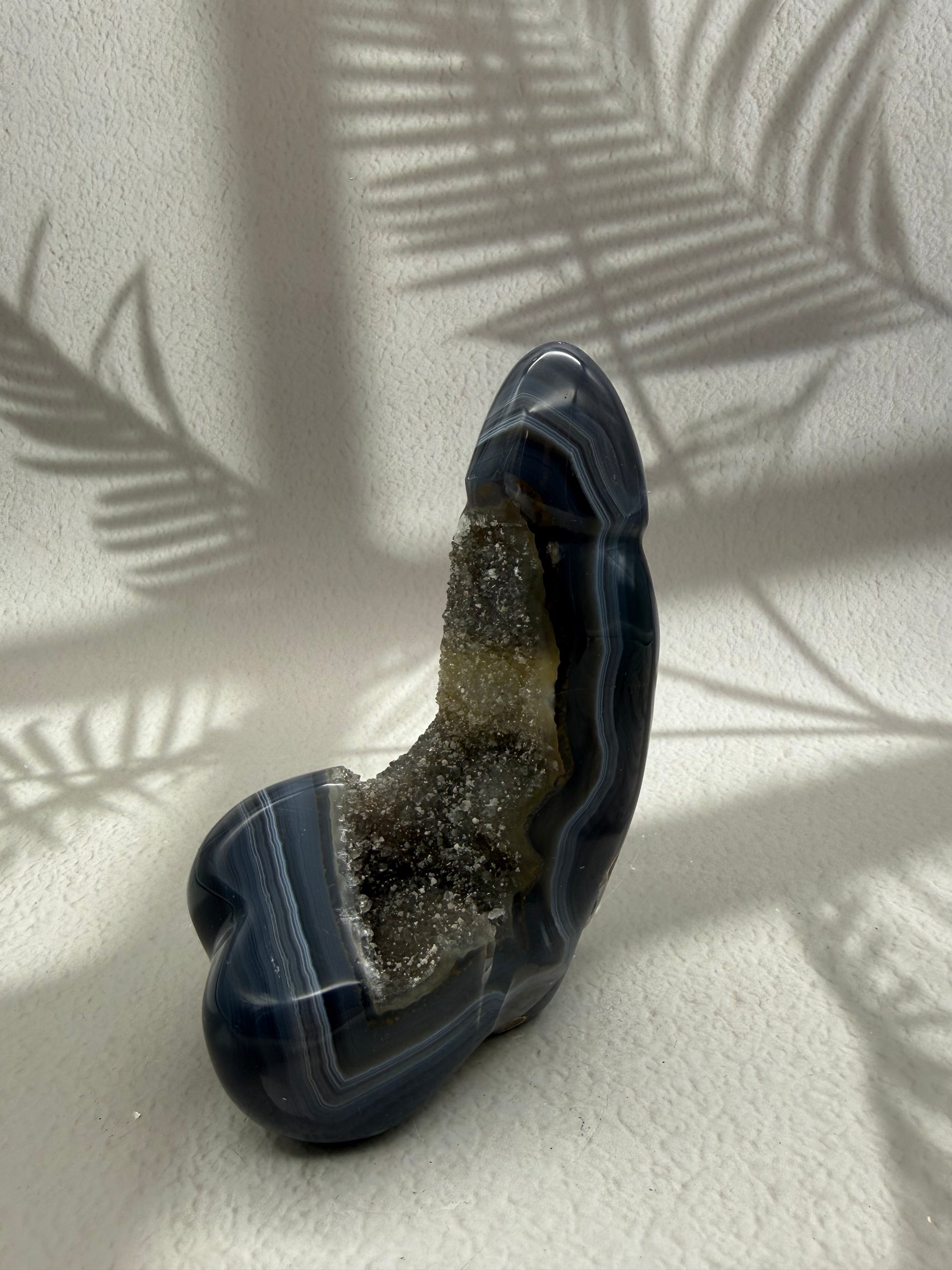 Diese wunderschöne Achat Druse besticht durch ihre natürliche Drusenstruktur und die harmonische Farbgebung. Die funkelnden Kristallspitzen im Inneren erzeugen eine lebendige Tiefenwirkung und setzen einen strahlenden Kontrast zur glatten Außenfläche.