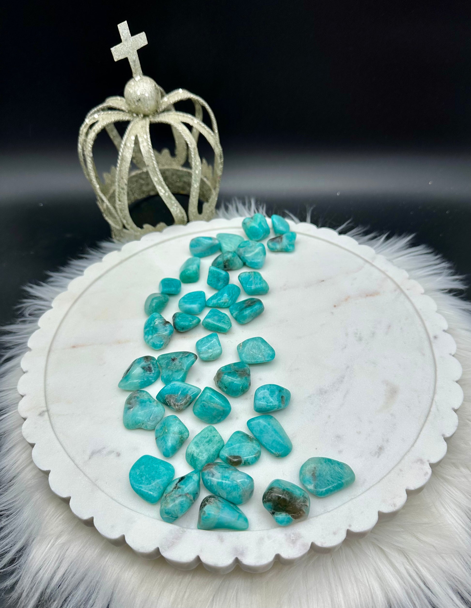 Du erhältst einen von uns ausgewählten Amazonit-Trommelstein, mit einzigartiger Farbgebung, jedes Stück ist ein Unikat.