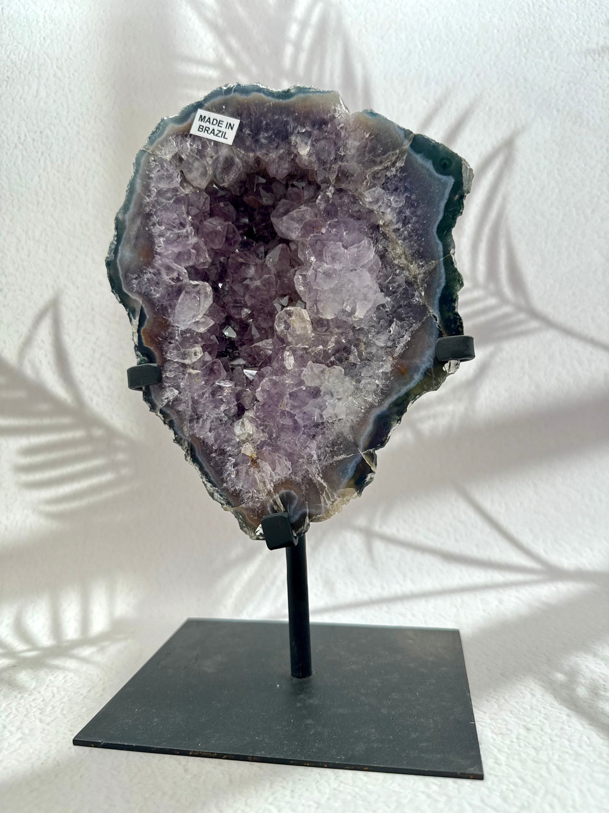 Dieser prachtvolle Amethyst auf einem stilvollen Metallständer vereint natürliche Schönheit mit einer tiefen spirituellen Ausstrahlung. Die intensiven violetten Kristalle funkeln im Licht und ziehen sofort alle Blicke auf sich. Durch die edle Präsentation auf dem Ständer wird der Amethyst zu einem dekorativen Highlight und gleichzeitig zu einem kraftvollen Energiezentrum in deinem Raum.
