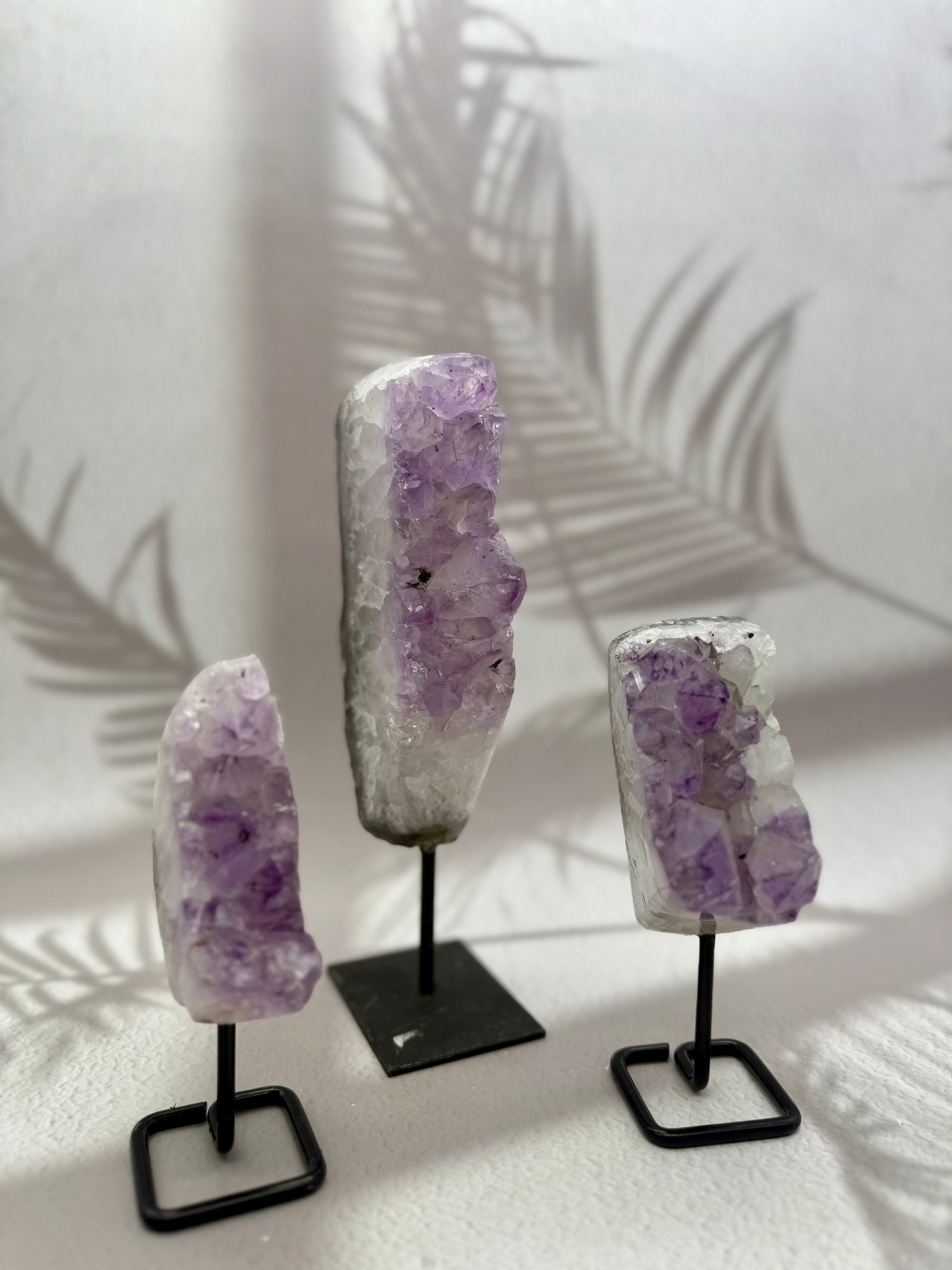 Amethyst-Drusen auf Ständer – 3er Set (Groß, Mittel, Klein) – Eleganz & kraftvolle Energie