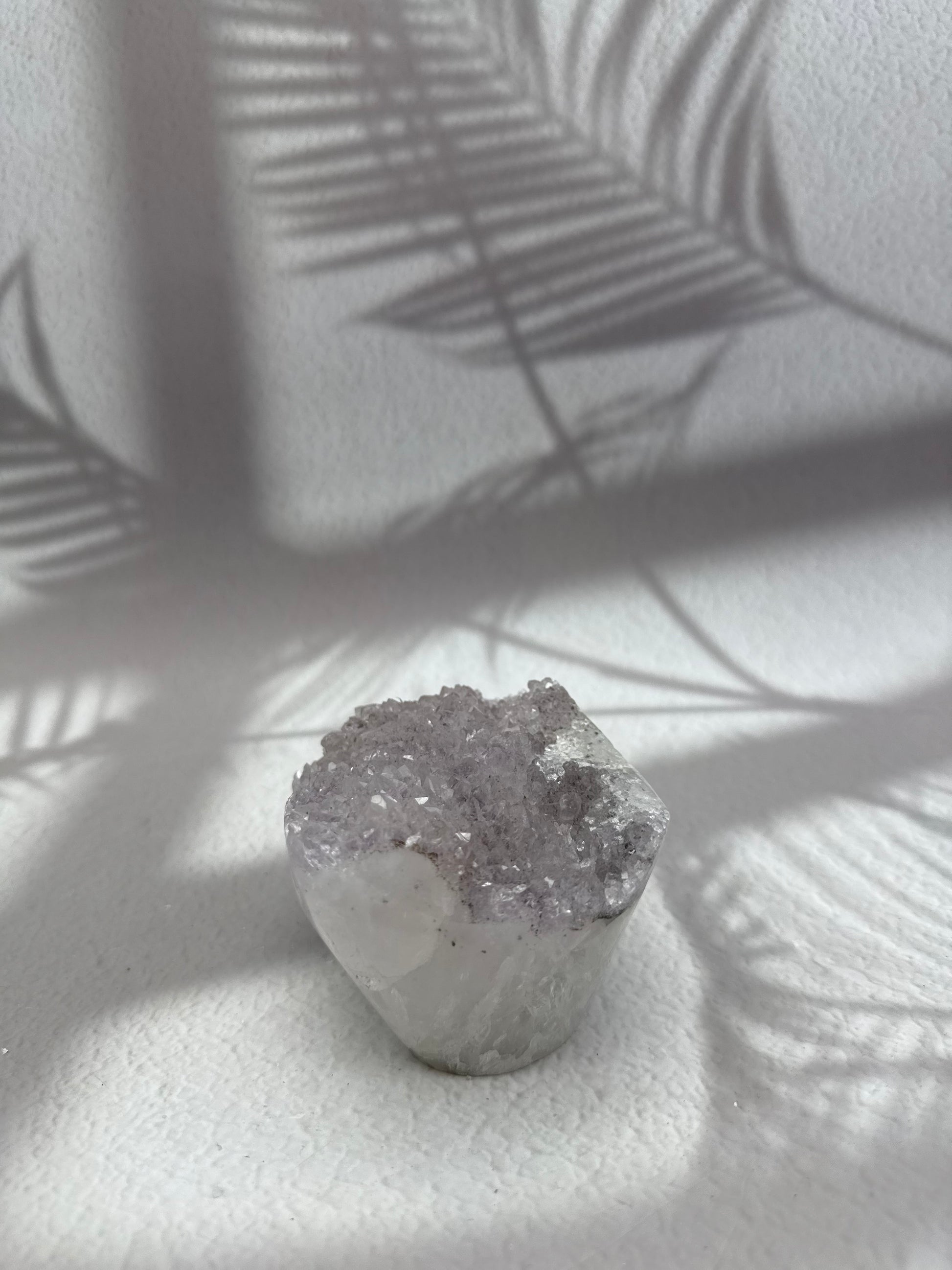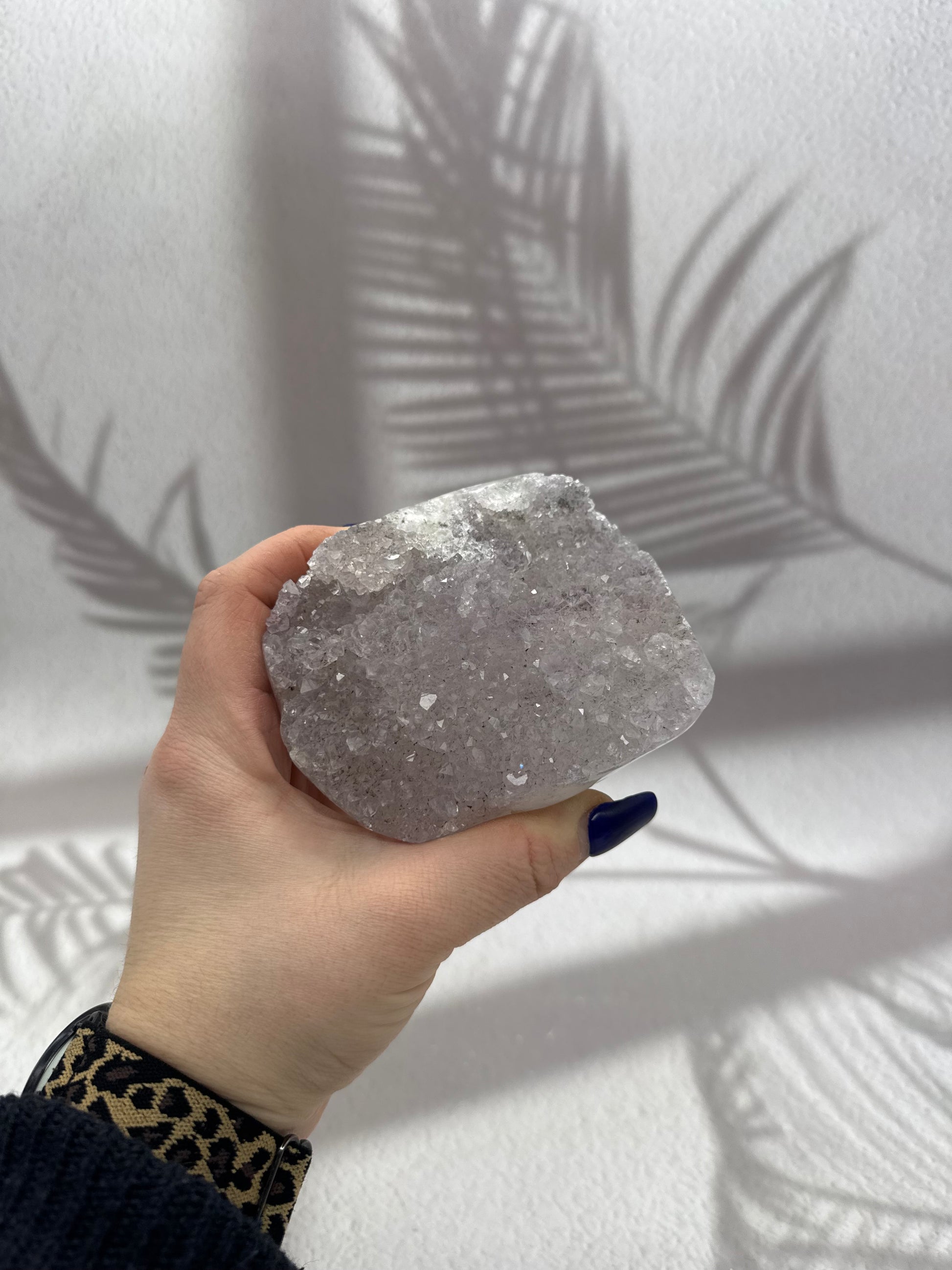 Diese beeindruckende Amethyst-Drusen-Freiform zieht mit ihrer tiefvioletten Kristallspitze und der natürlichen, glitzernden Drusenstruktur sofort alle Blicke auf sich. Die organische Freiform betont die natürliche Schönheit des Steins und macht ihn zu einem kraftvollen Blickfang für Wohnraum, Meditationsplatz oder Praxisbereich.