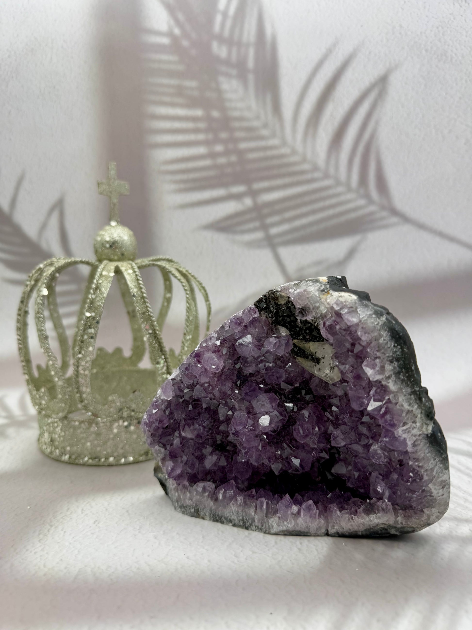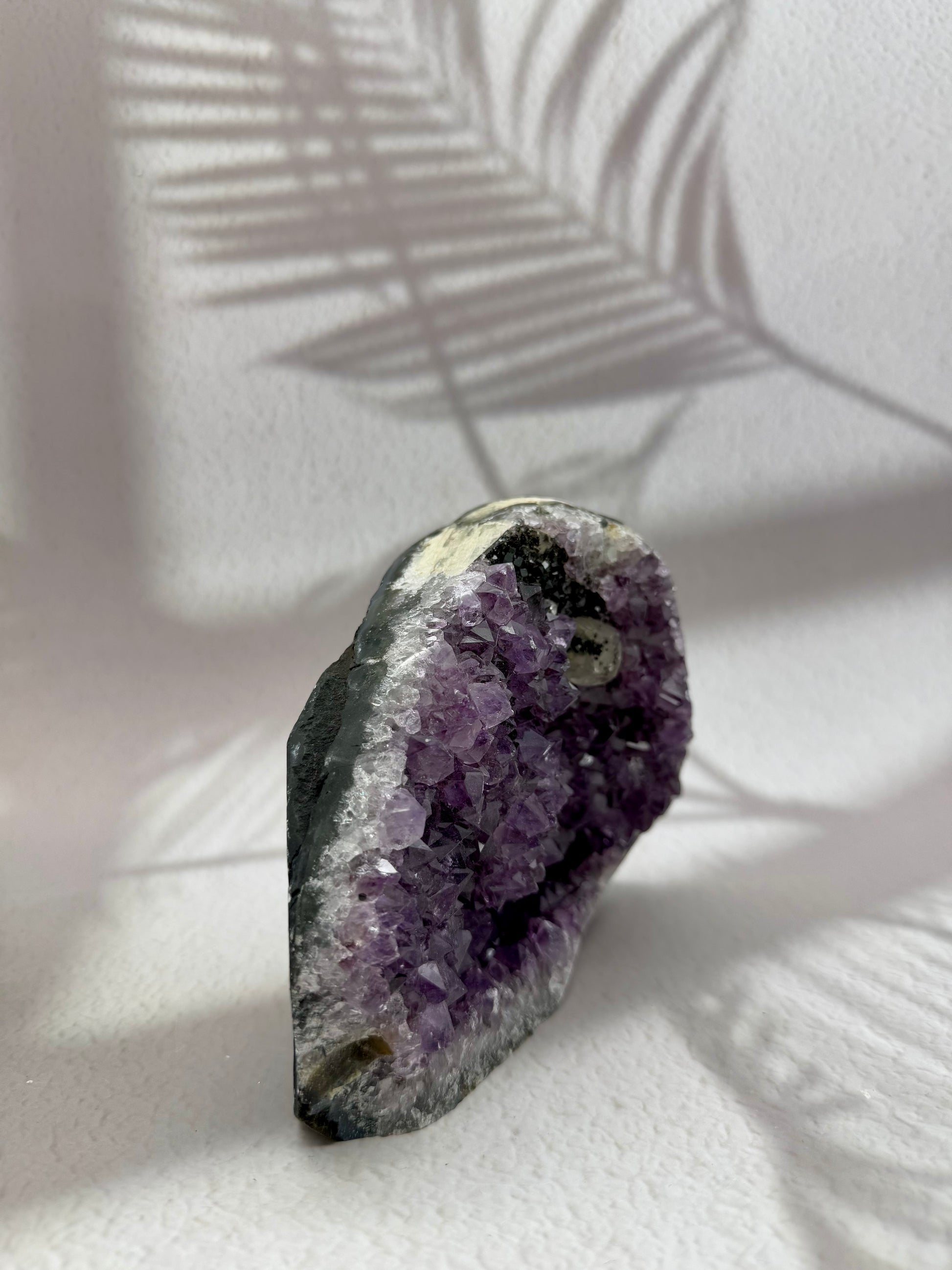 Diese besondere, naturbelassene Druse aus Amethyst fasziniert durch ihre intensive violette Farbe und die einzigartige Kombination mehrerer Mineralien. In der oberen linken Ecke befindet sich eine natürlich gewachsene Quarzspitze, die das Farbspiel wunderschön ergänzt. Zusätzlich ist Hämatit an die Druse herangewachsen – ein faszinierendes Detail der Natur, das ihre Entstehungsgeschichte sichtbar macht und ihre Energie noch kraftvoller wirken lässt.