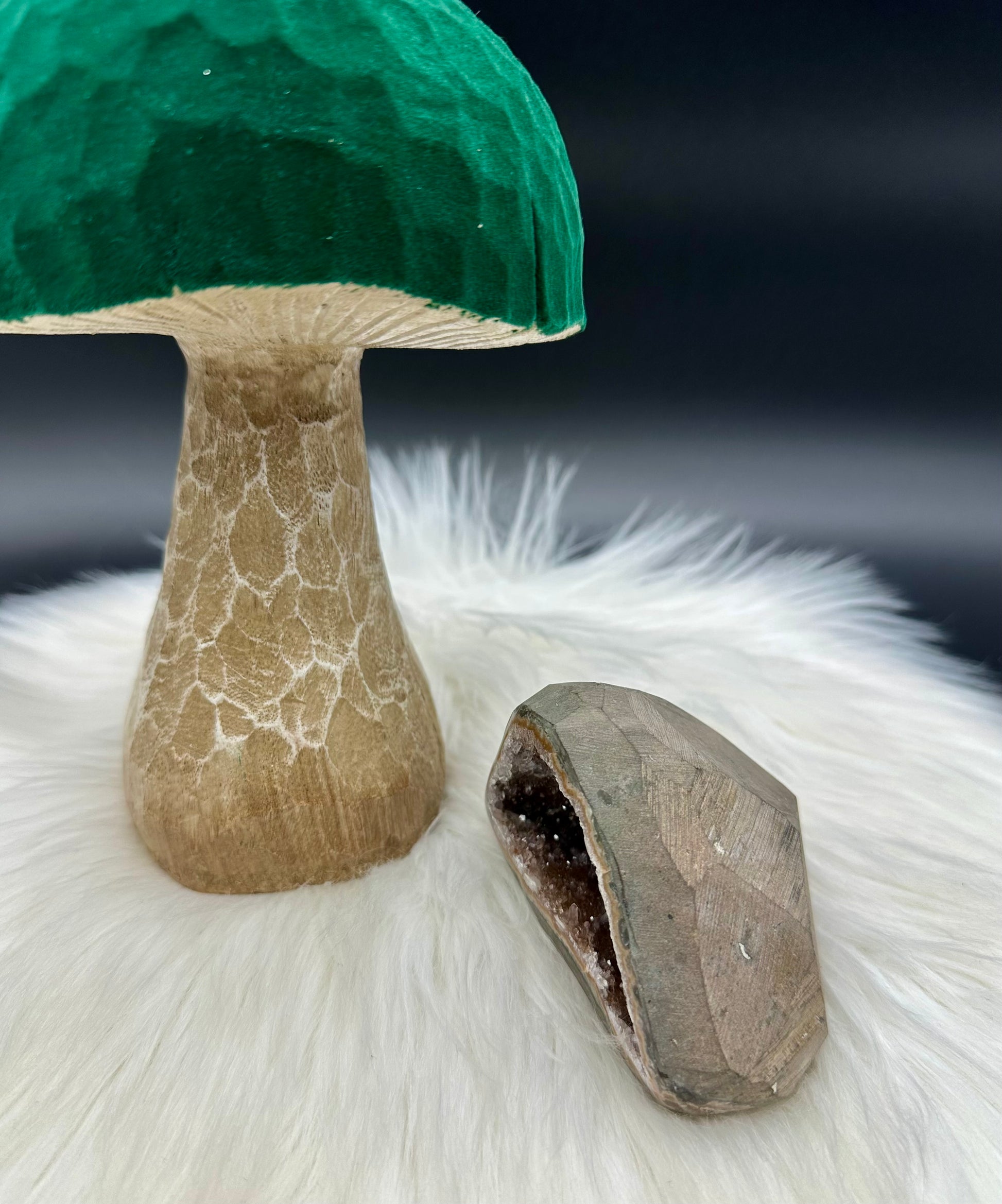 Eine Amethyst-Höhle mit rötlichen Drusen ist ein einzigartiges und faszinierendes Naturprodukt, das die beruhigende Energie von Amethyst mit einem Hauch von Wärme und Leidenschaft durch seine rötlichen Kristalle kombiniert. Diese Höhlen bestehen aus Amethyst-Kristallen, die in einer geodeartigen Struktur wachsen. Die Drusen in der Höhle verstärken die energetische Wirkung des Steins, indem sie die heilende Energie gleichmäßig abgeben.