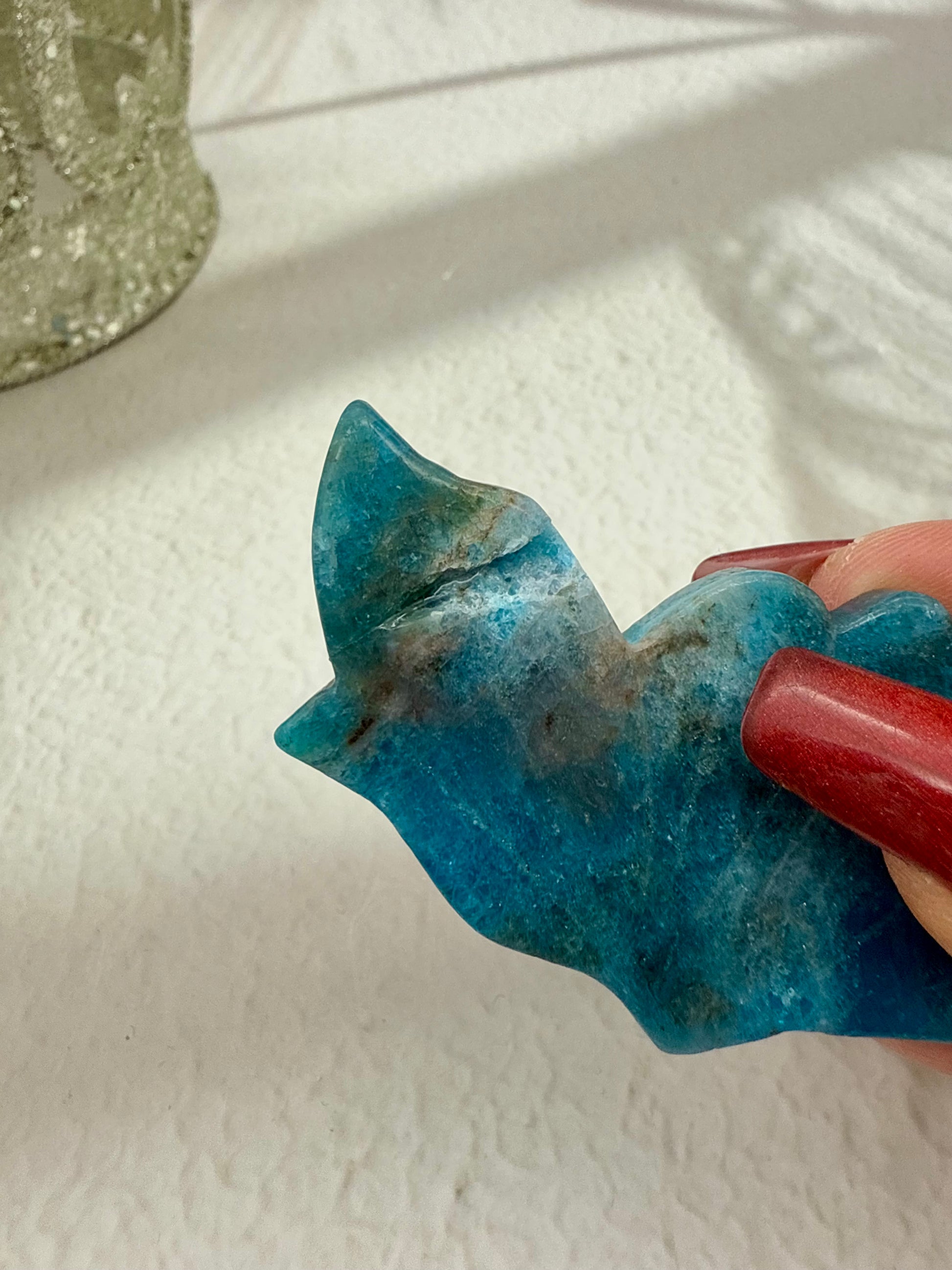 Ein zarter Schmetterling aus Apatit, dessen Flügel in wunderbaren Blau- und Türkistönen schimmern..lebendig, sanft und voller Ausdruckskraft.