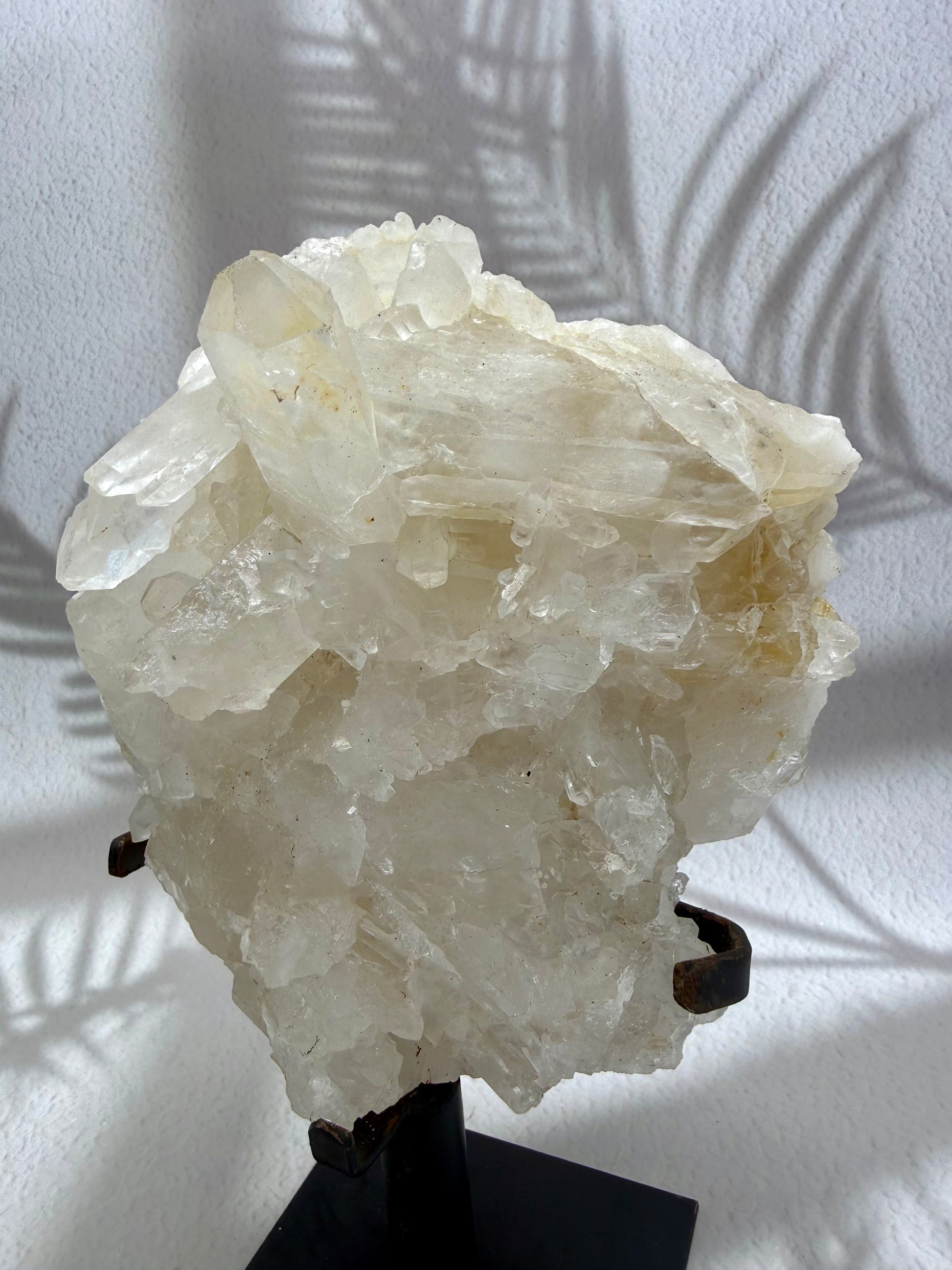 Diese Bergkristalldruse besticht durch ihre harmonische Mischung aus kleinen und großen Kristallspitzen, die funkelnd und lebendig wirken. Dezente Eisen-Einschlüsse verleihen der Druse einen natürlichen, erdigen Akzent und unterstreichen ihre authentische Schönheit. Auf einem stabilen Metallständer präsentiert, wird sie zu einem eleganten Blickfang in jedem Raum.