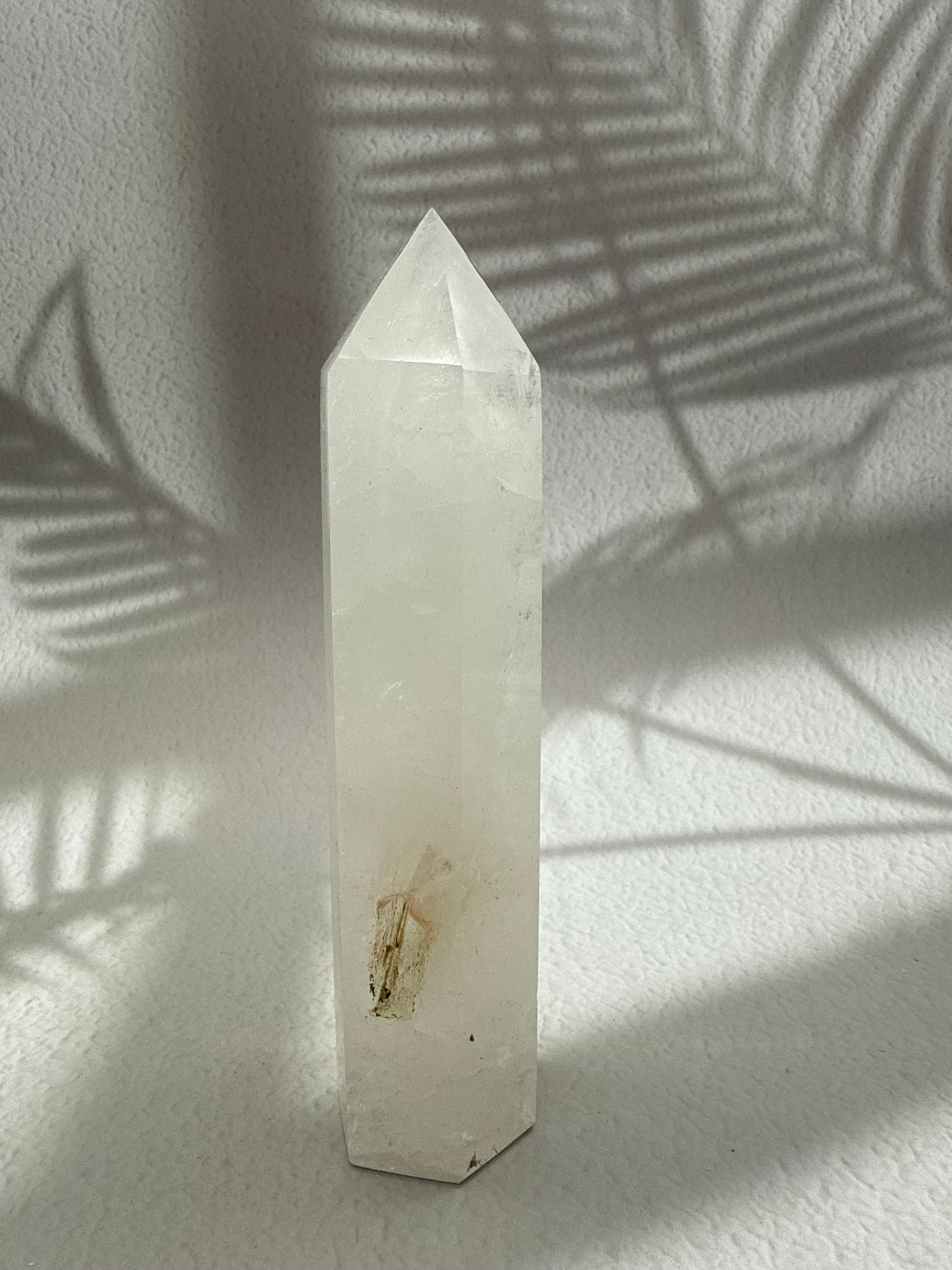 Bergkristall-Turm mit Eiseneinschlüssen & Hämatit – Klarheit & erdende Kraft