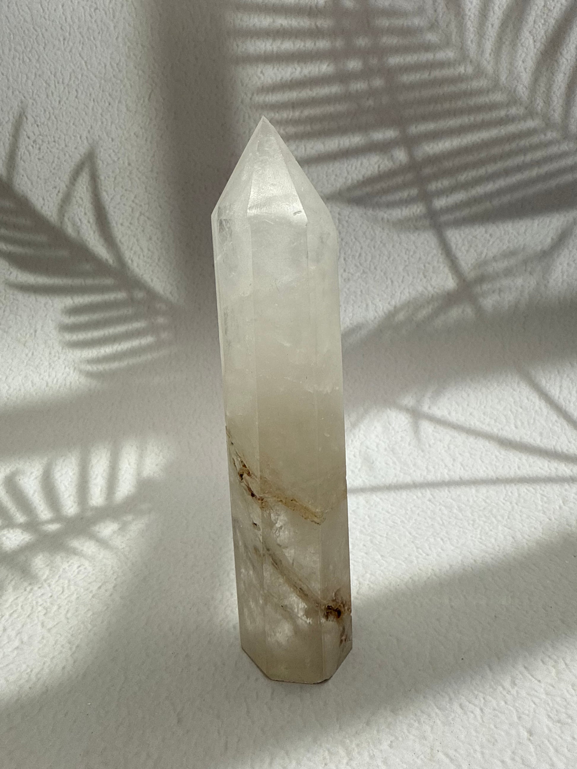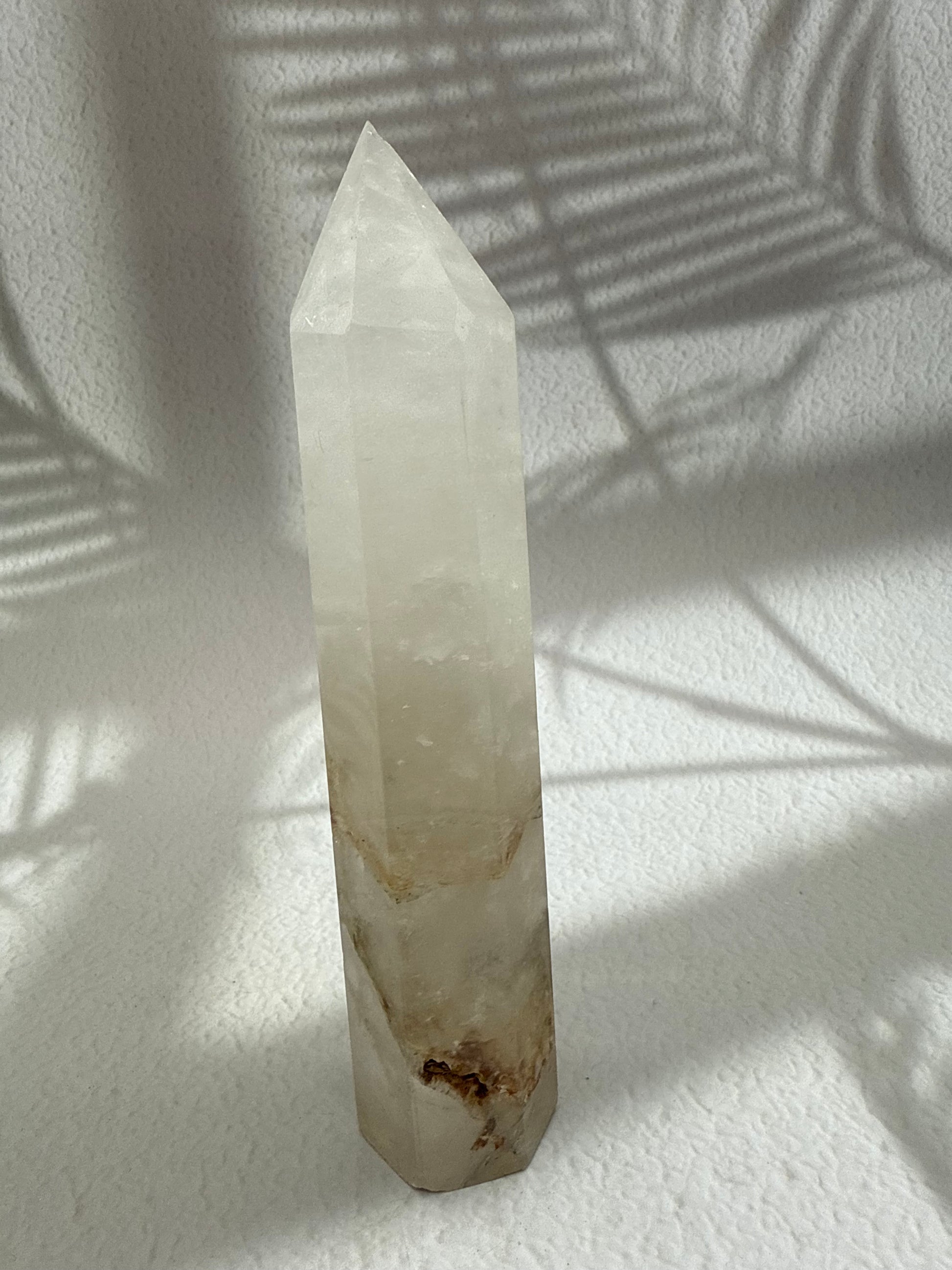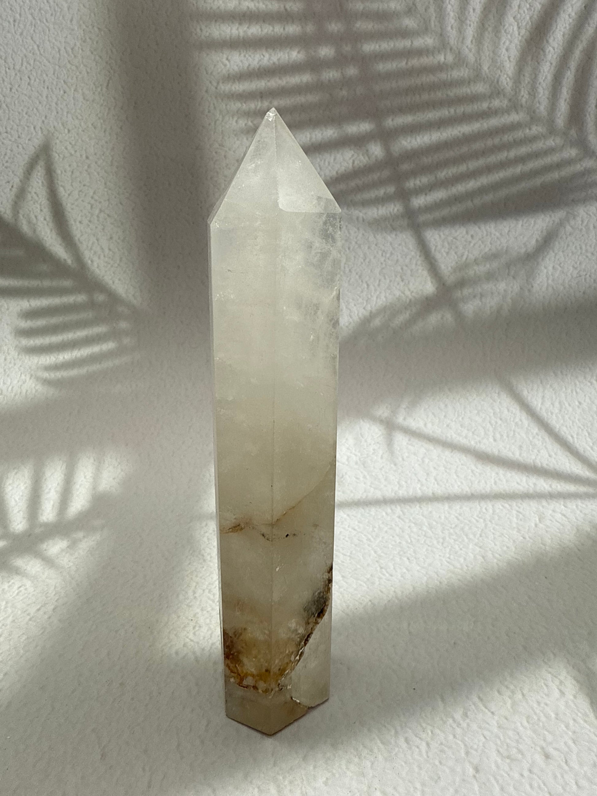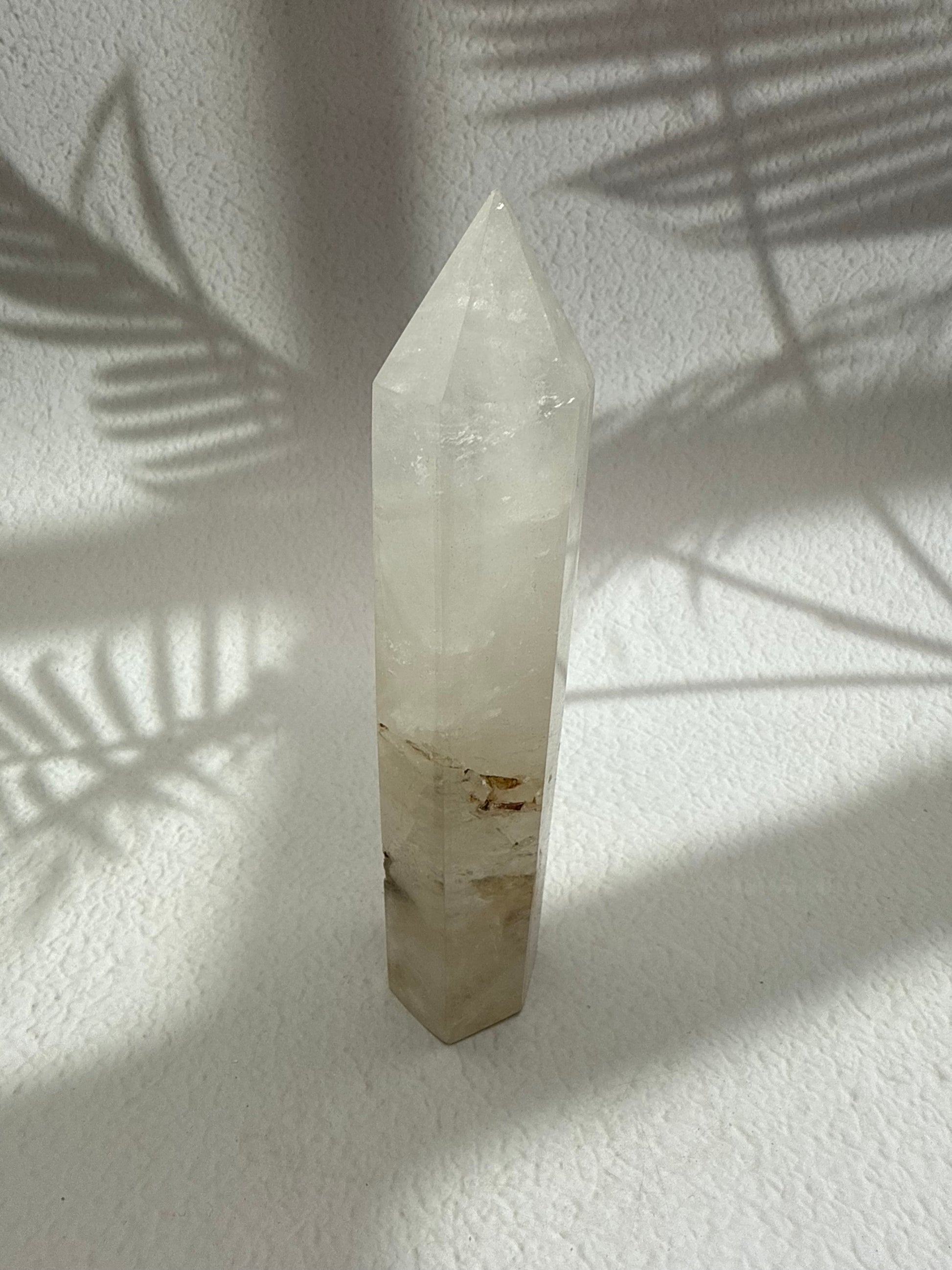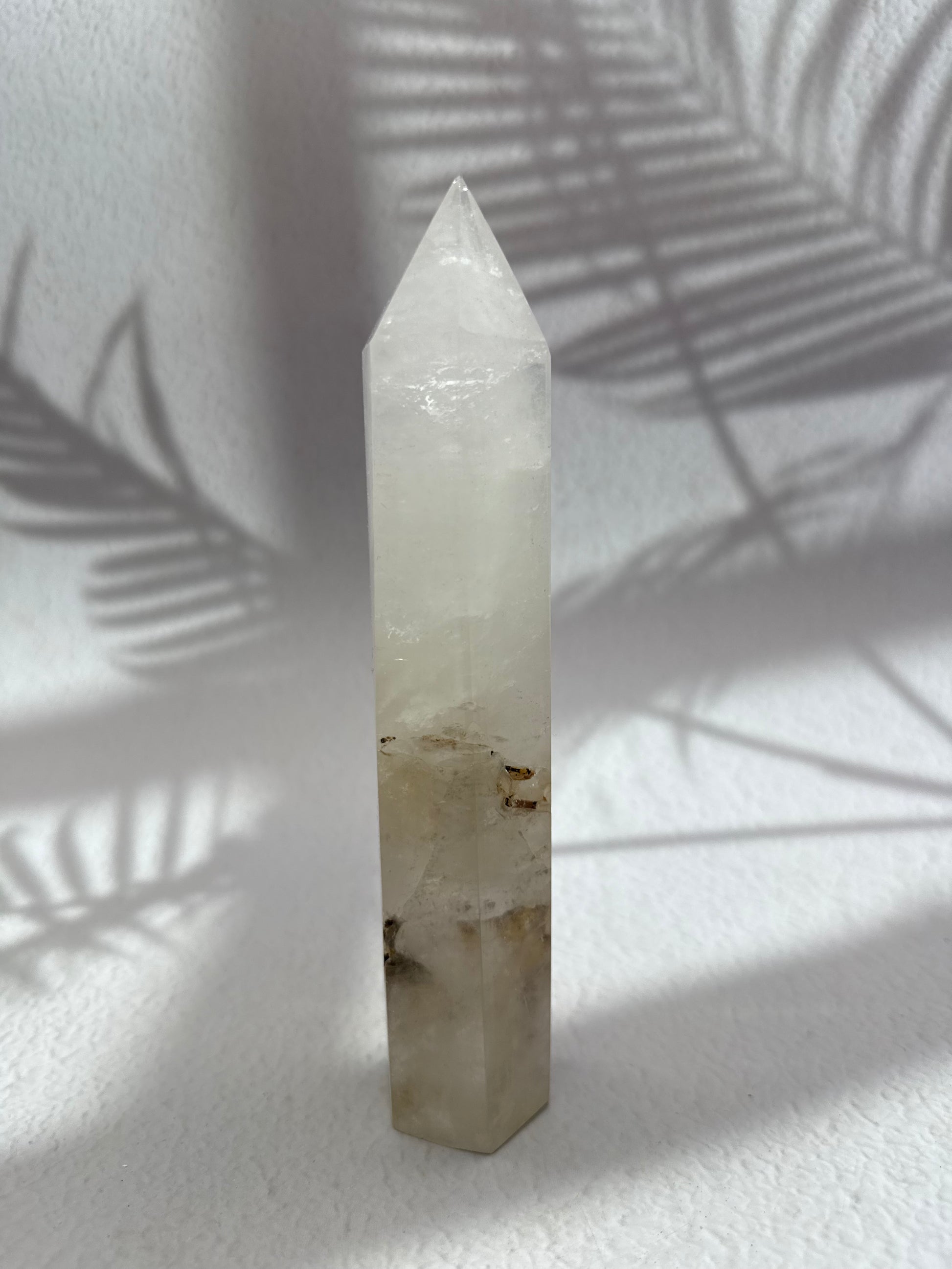 Bergkristall-Turm mit Eiseneinschlüssen & Hämatit – Klarheit & erdende Kraft