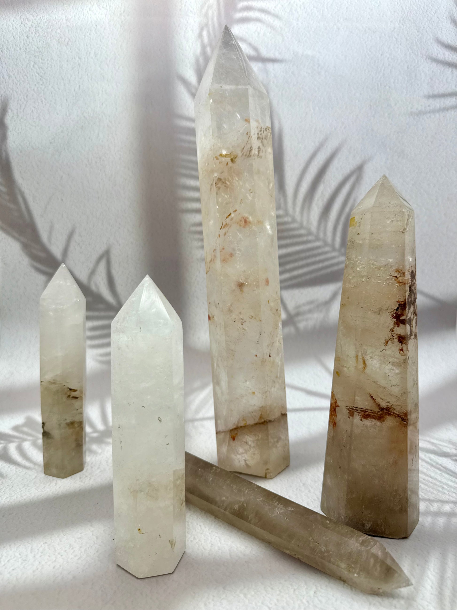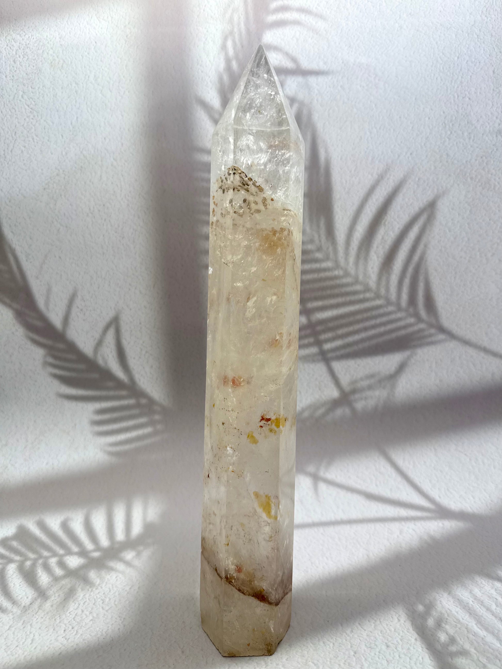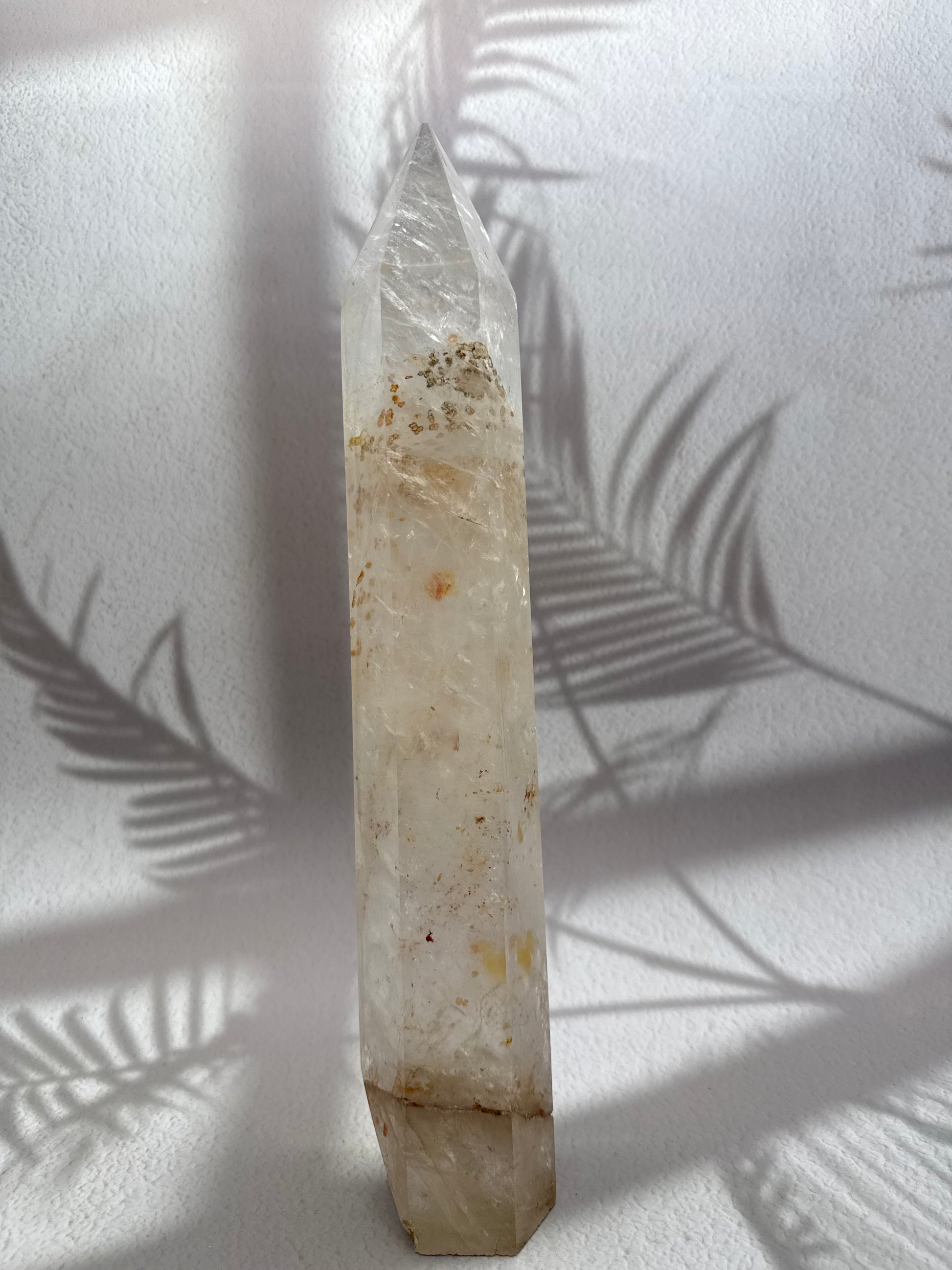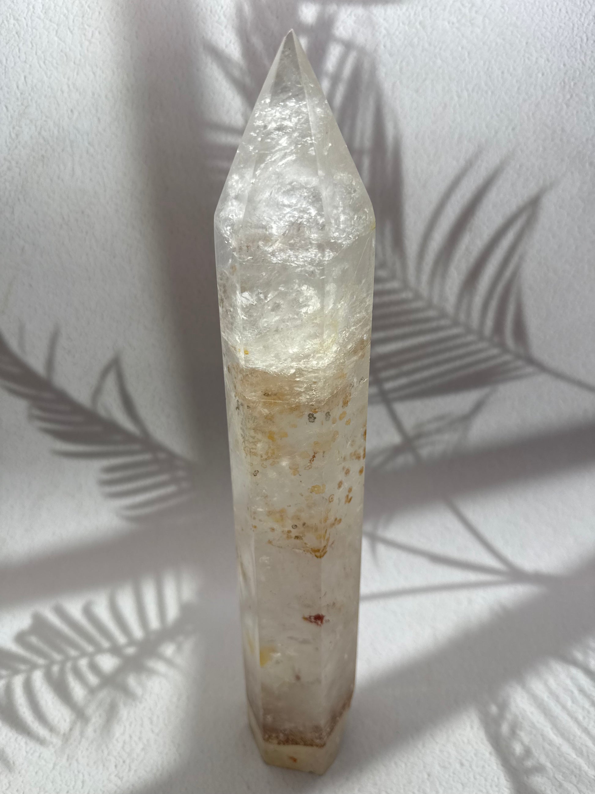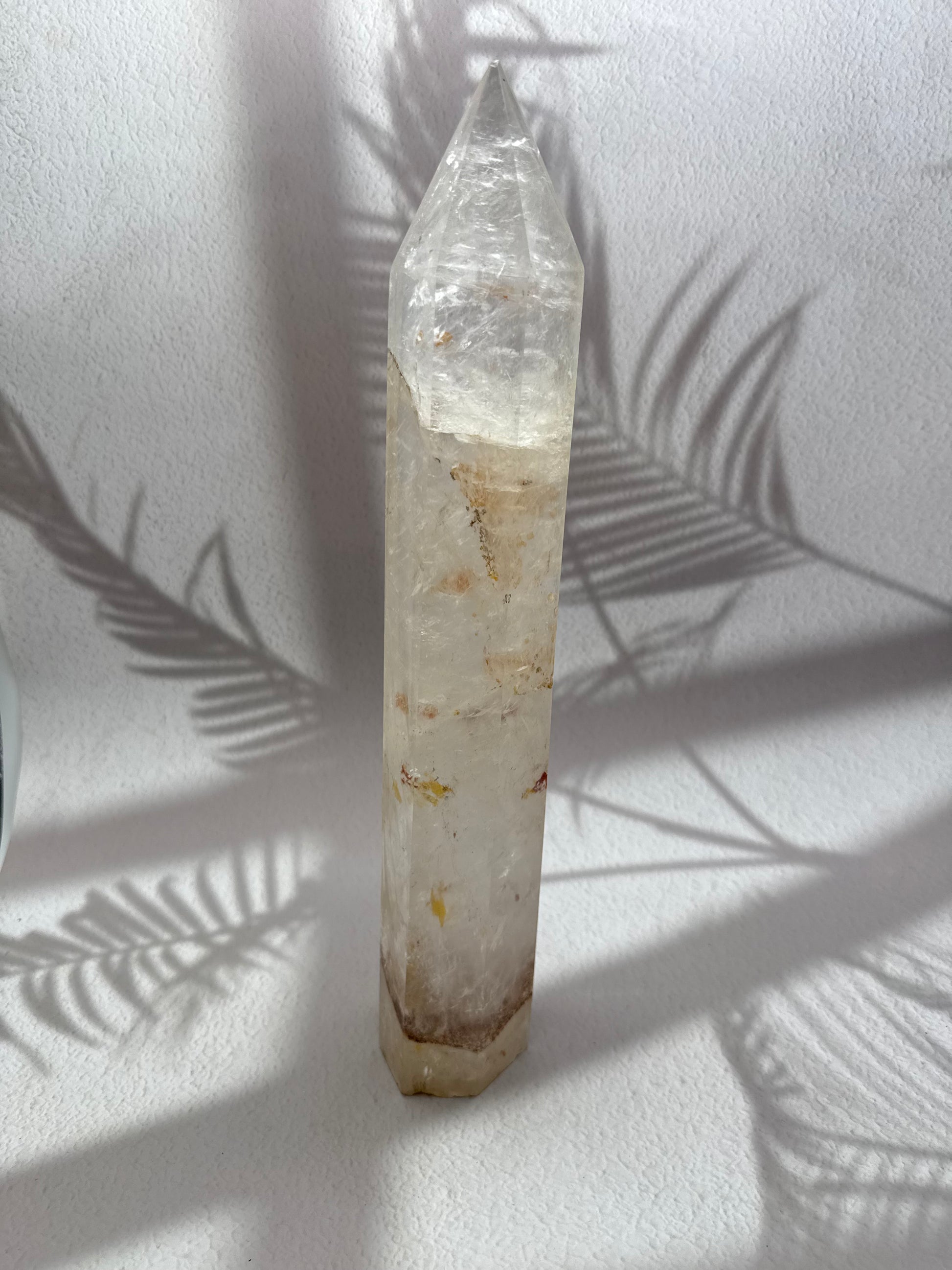 Bergkristall-Turm mit Eiseneinschlüssen & Hämatit – Klarheit & erdende Kraft