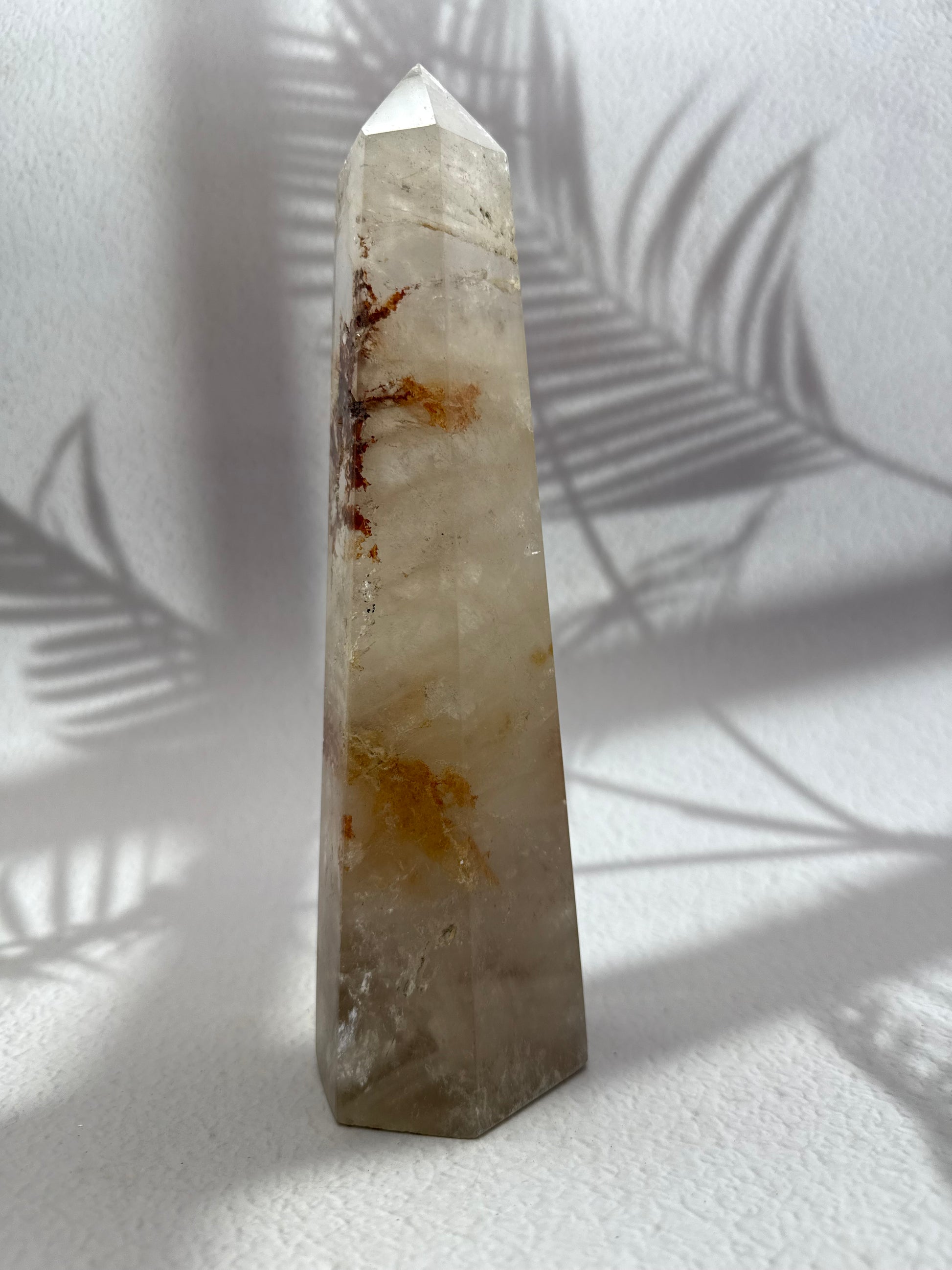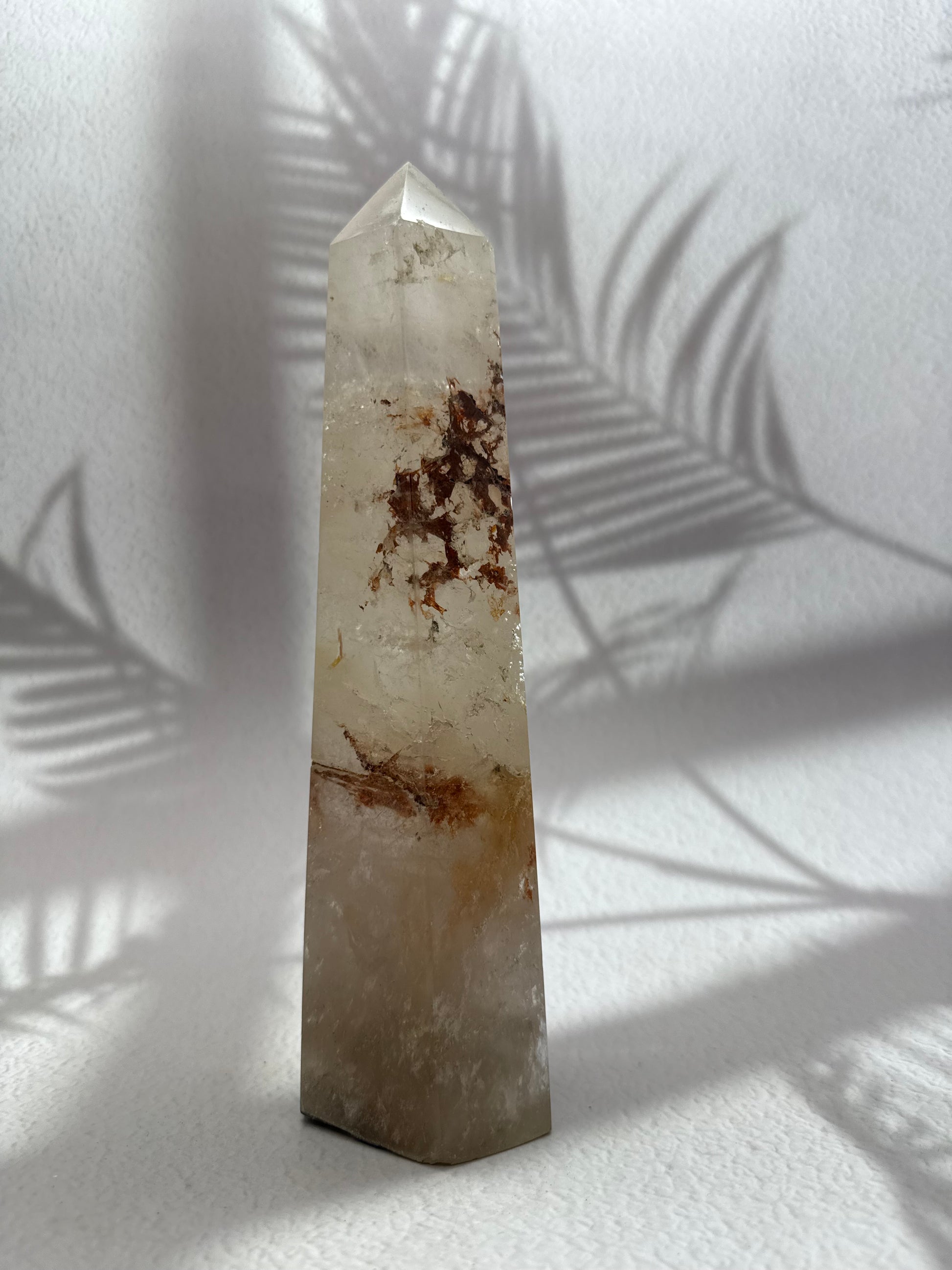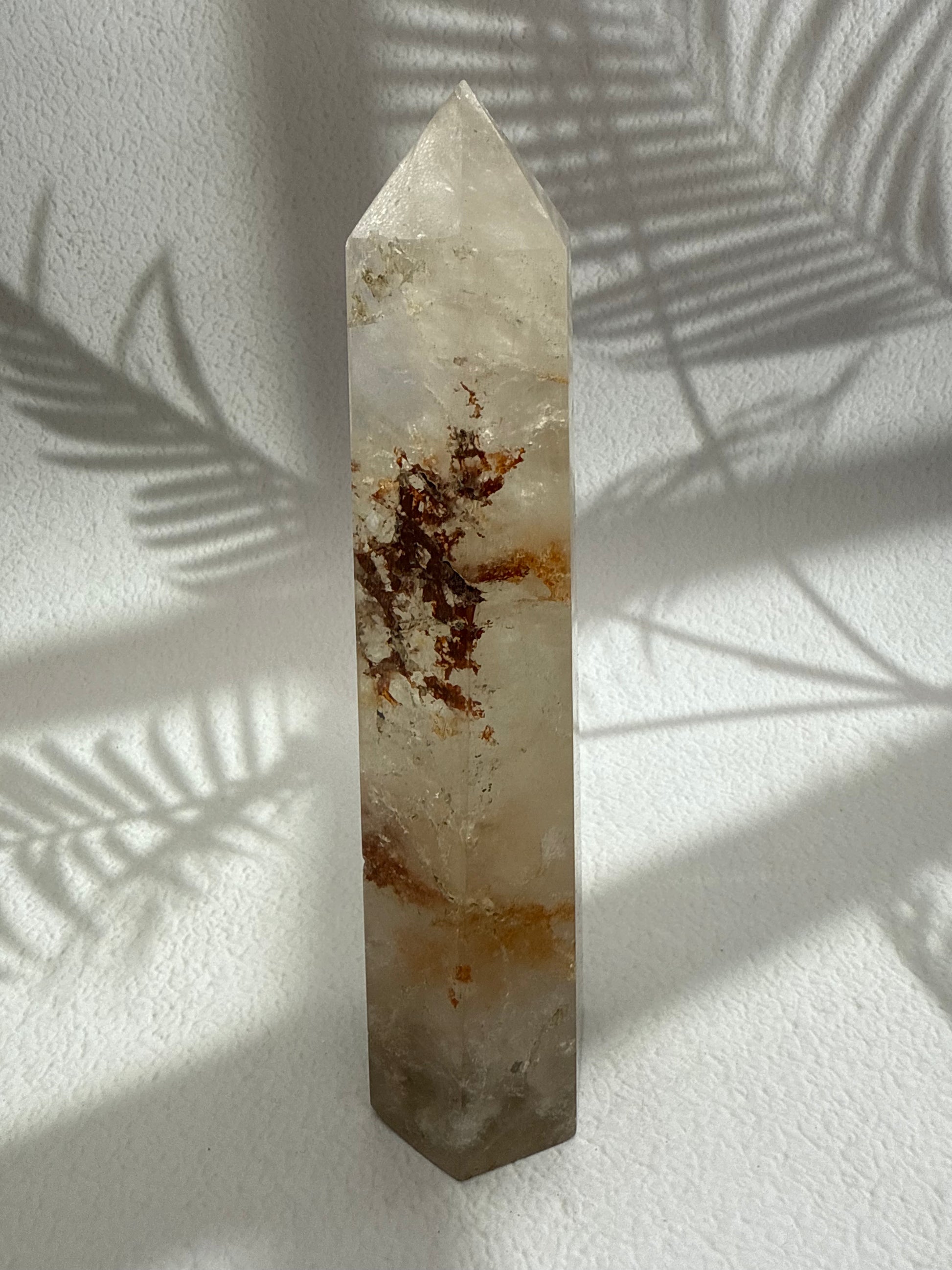 Bergkristall-Turm mit Eiseneinschlüssen & Hämatit – Klarheit & erdende Kraft