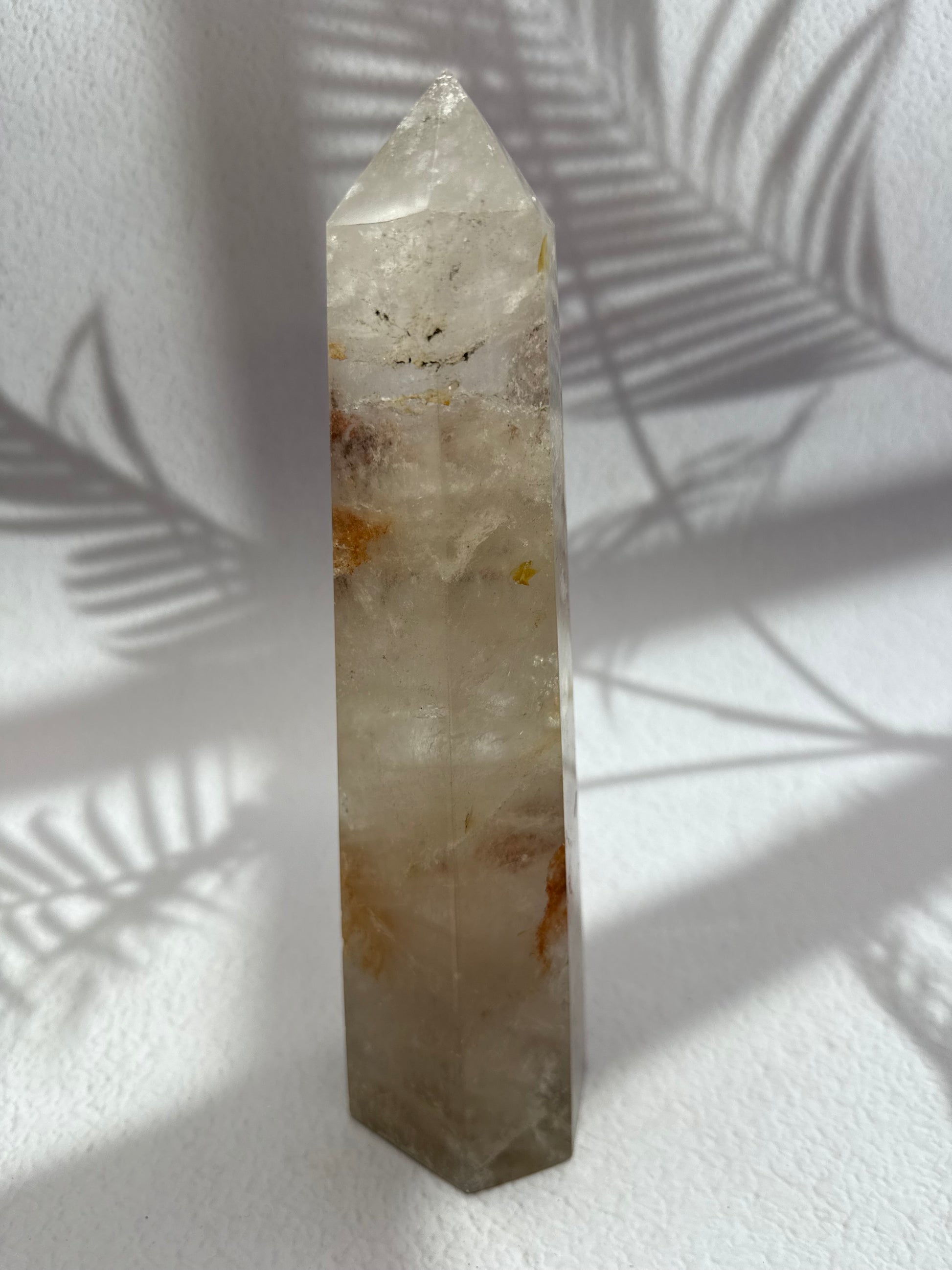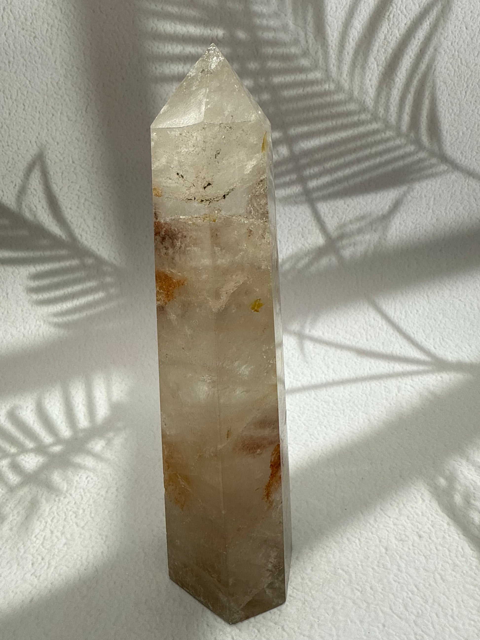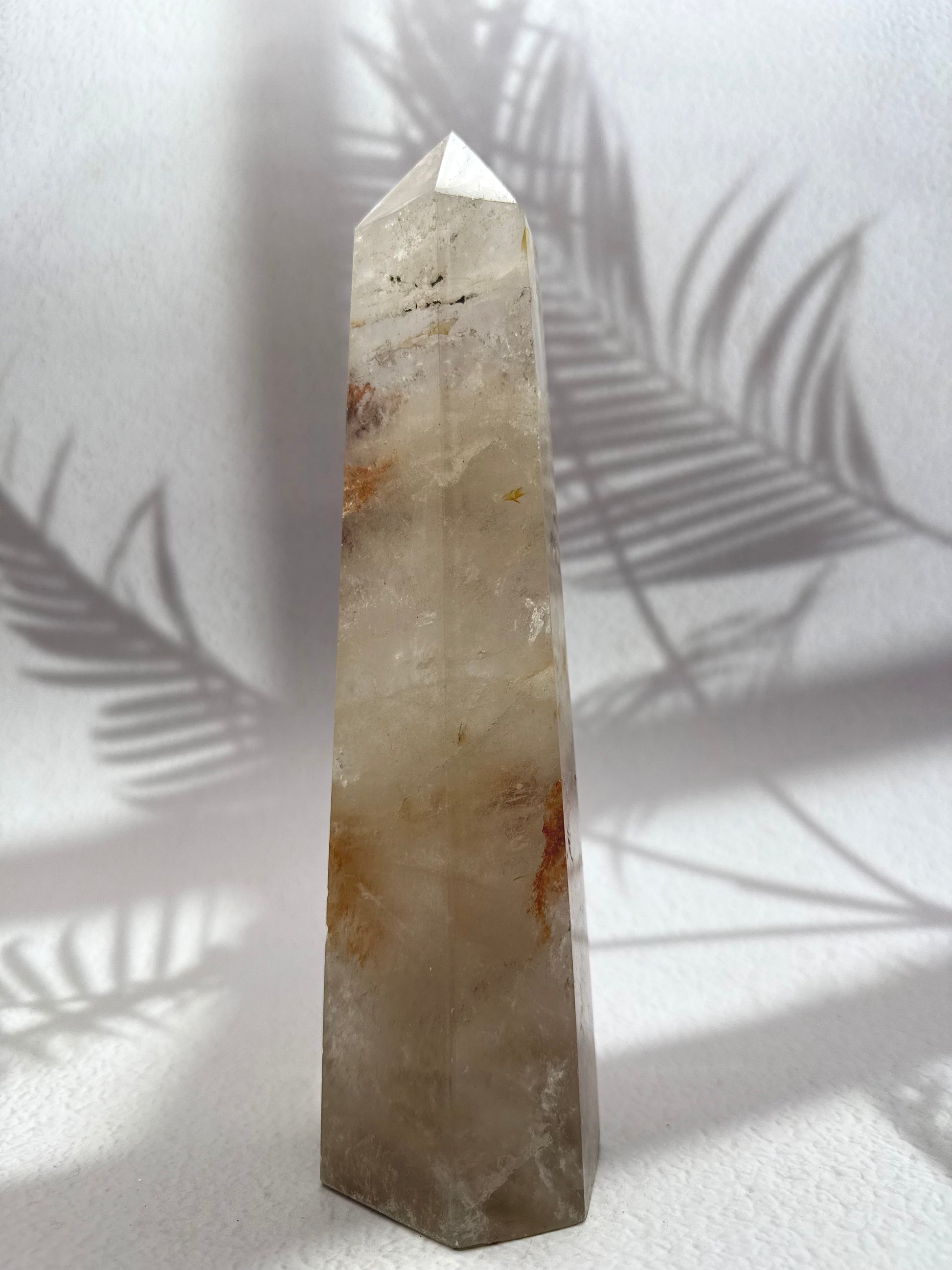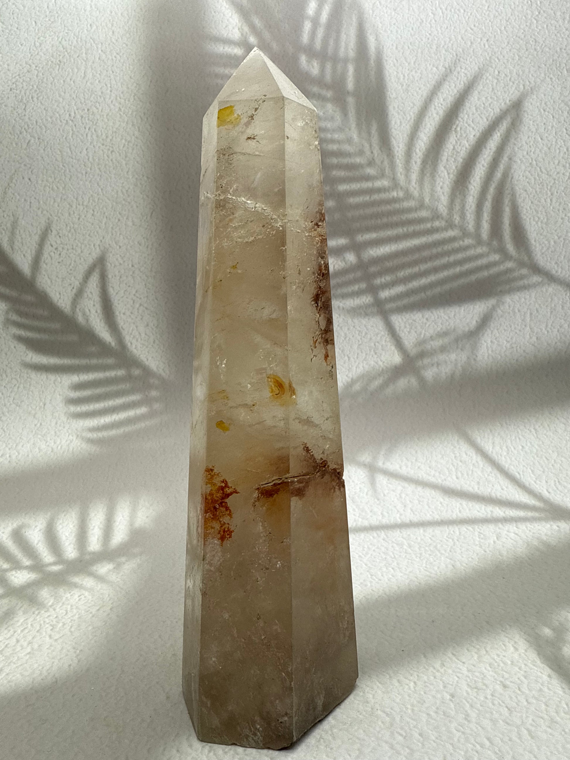 Bergkristall-Turm mit Eiseneinschlüssen & Hämatit – Klarheit & erdende Kraft