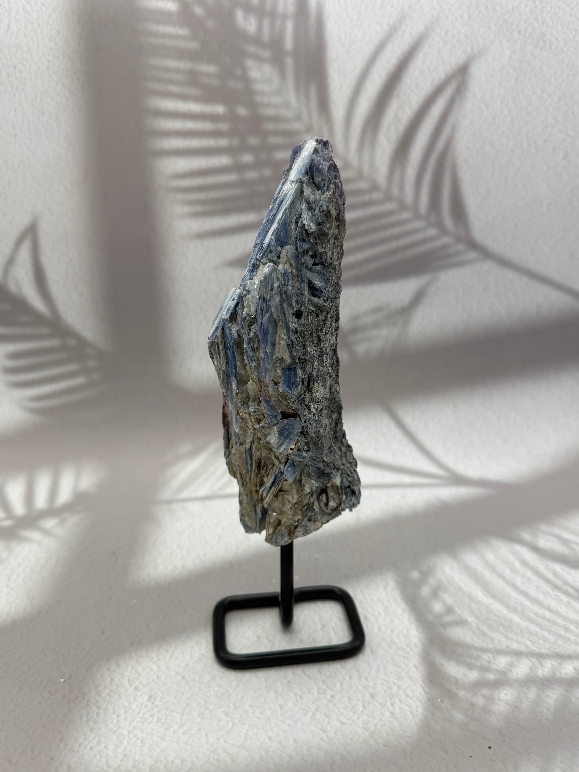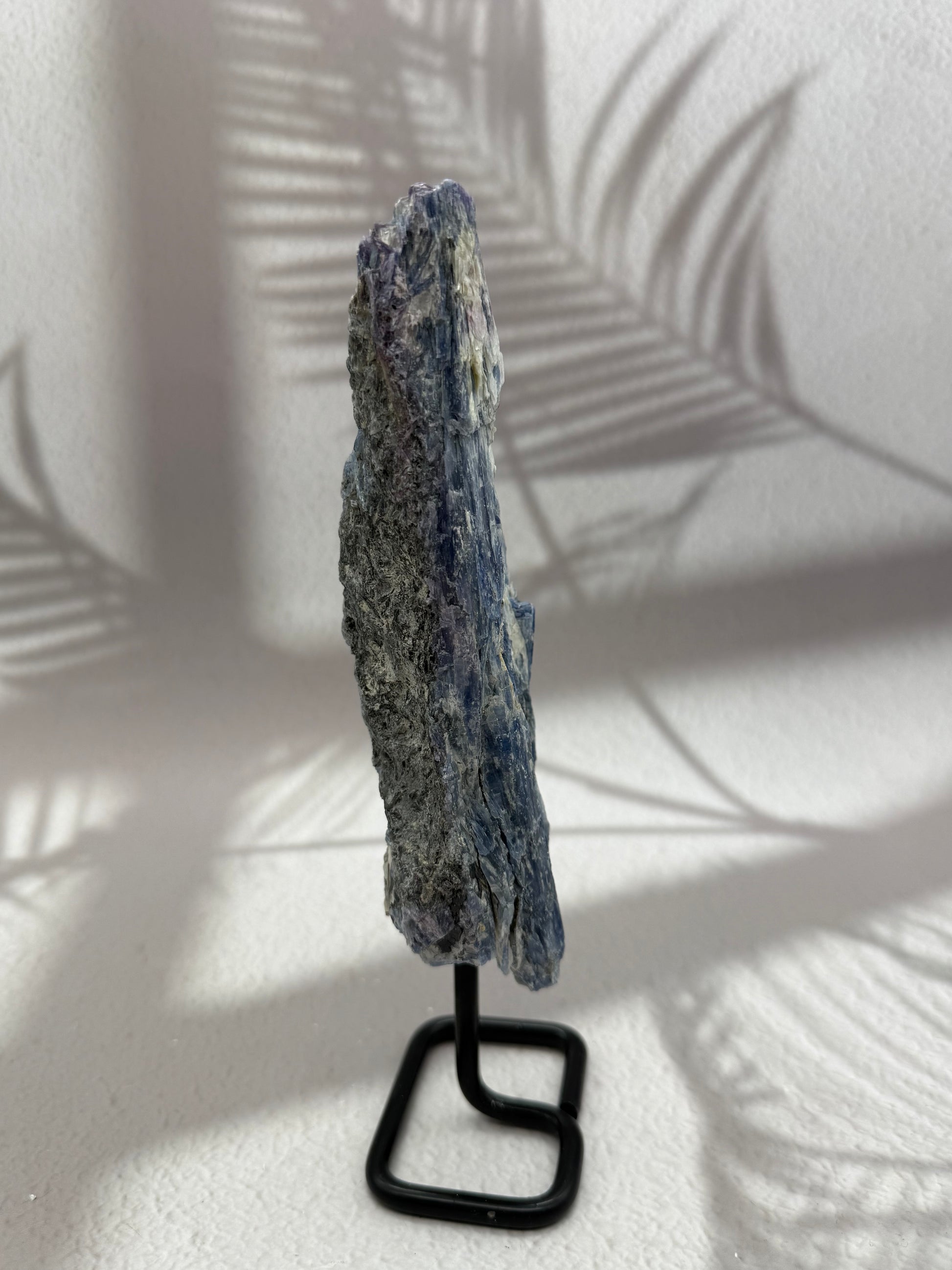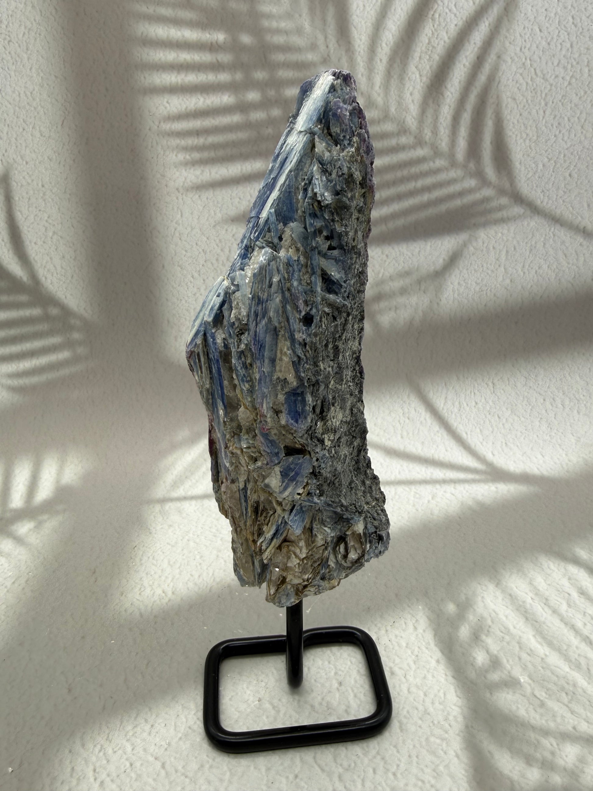 Blauer Kyanit Rohstück auf Ständer – Mit Quarzdrusen & goldenem Glimmer (Mica) | Premiumqualität | B-Ware (siehe letztes Bild)