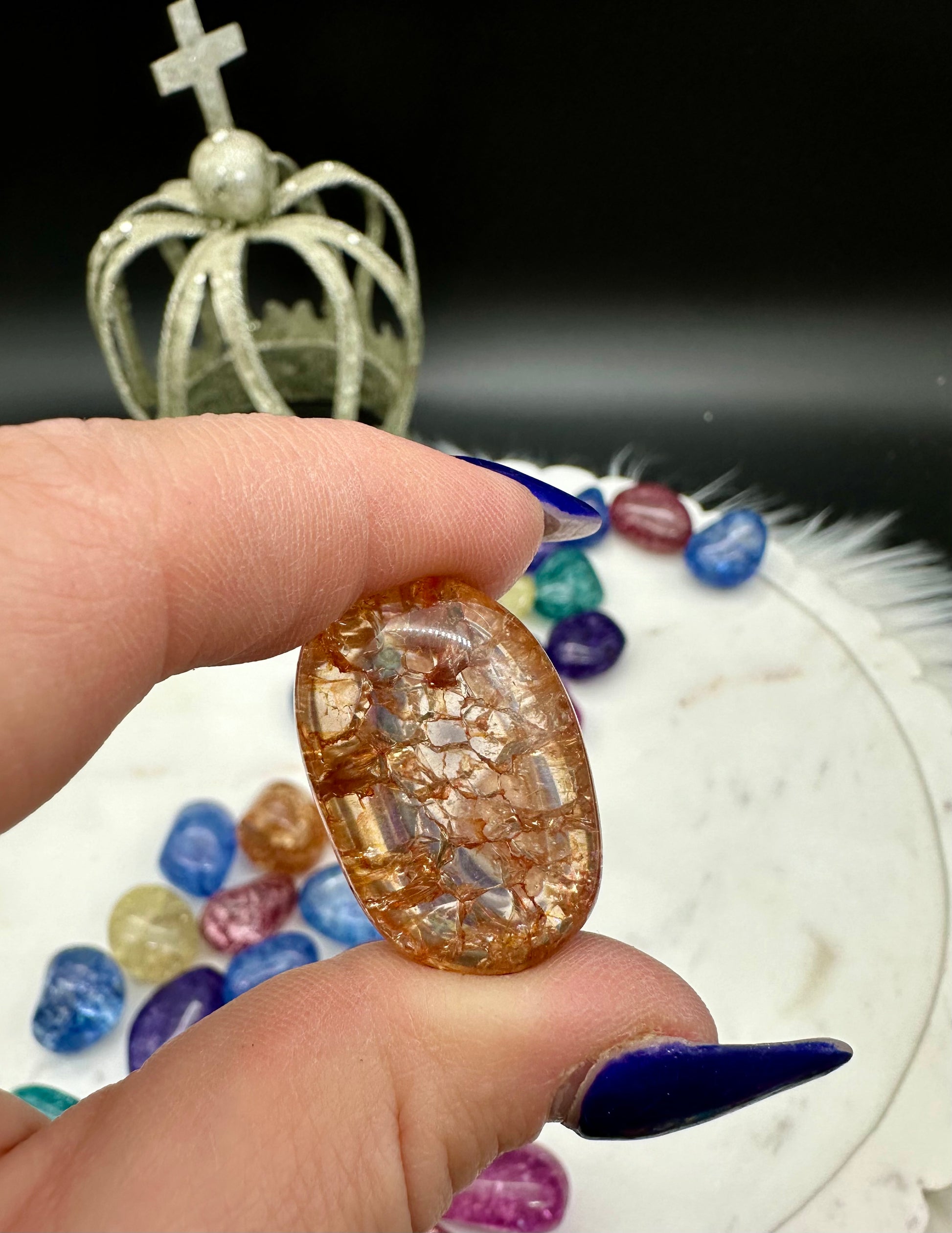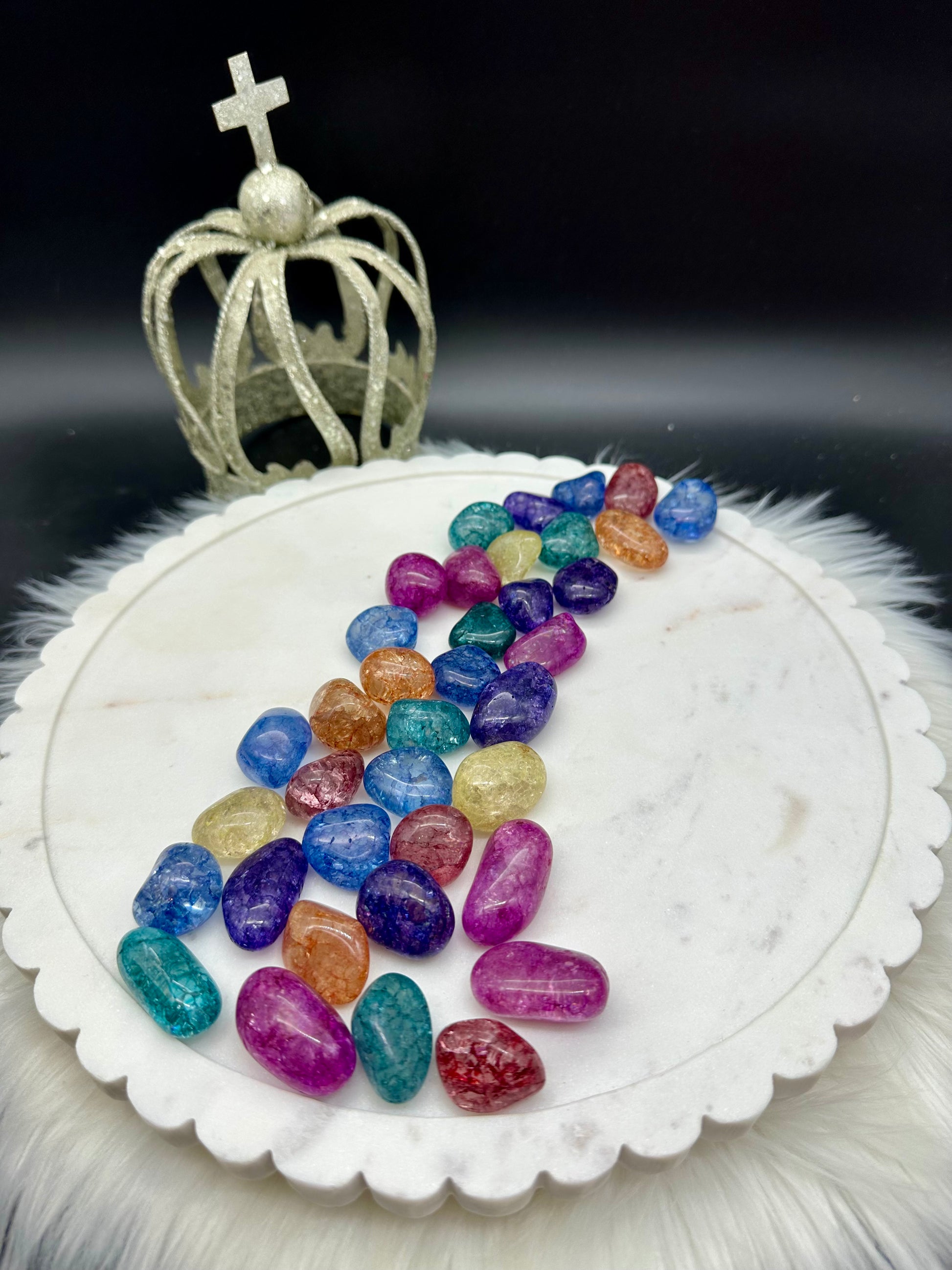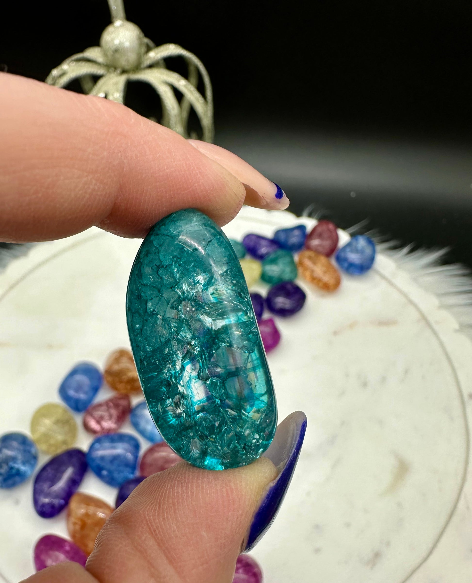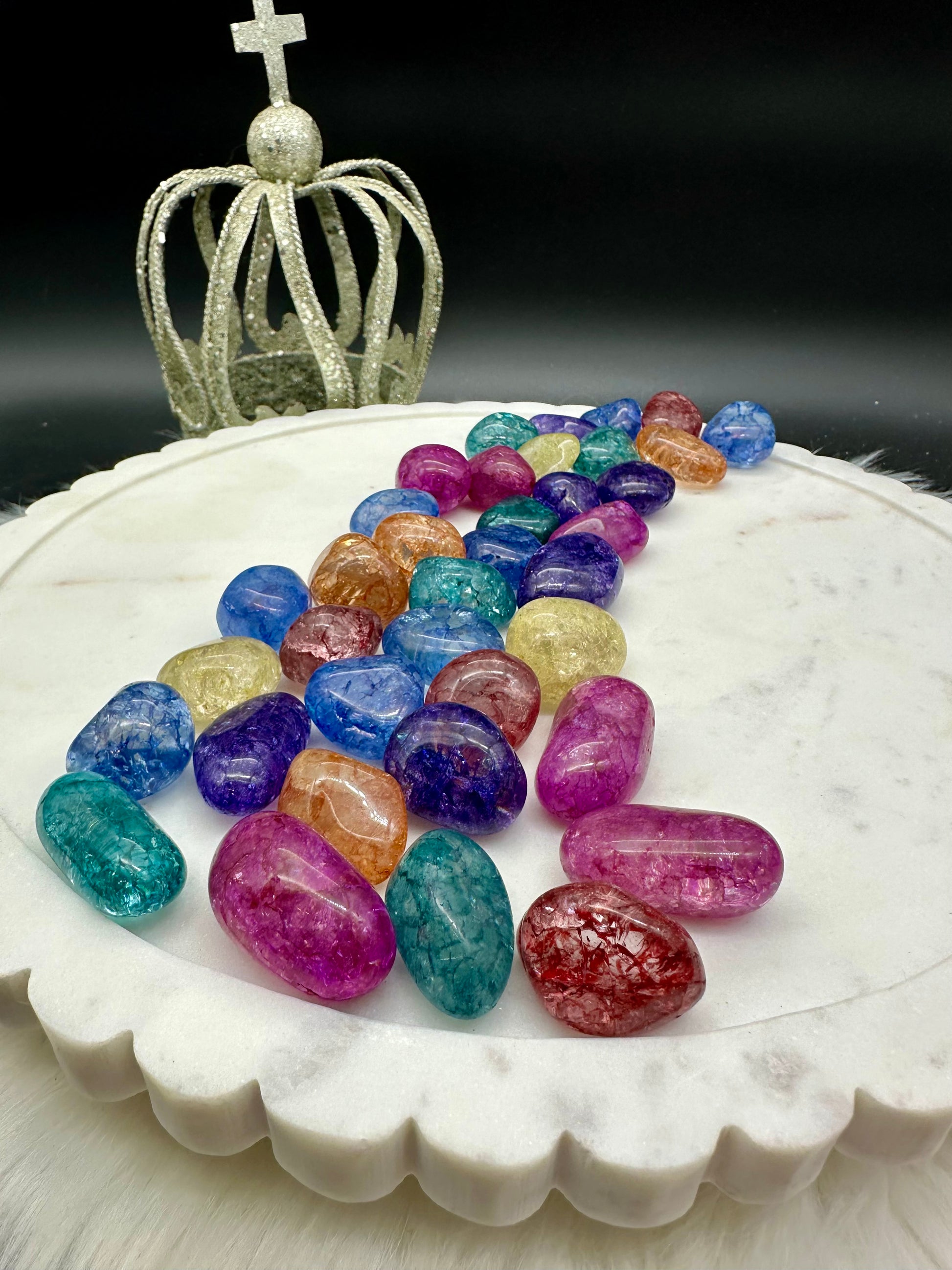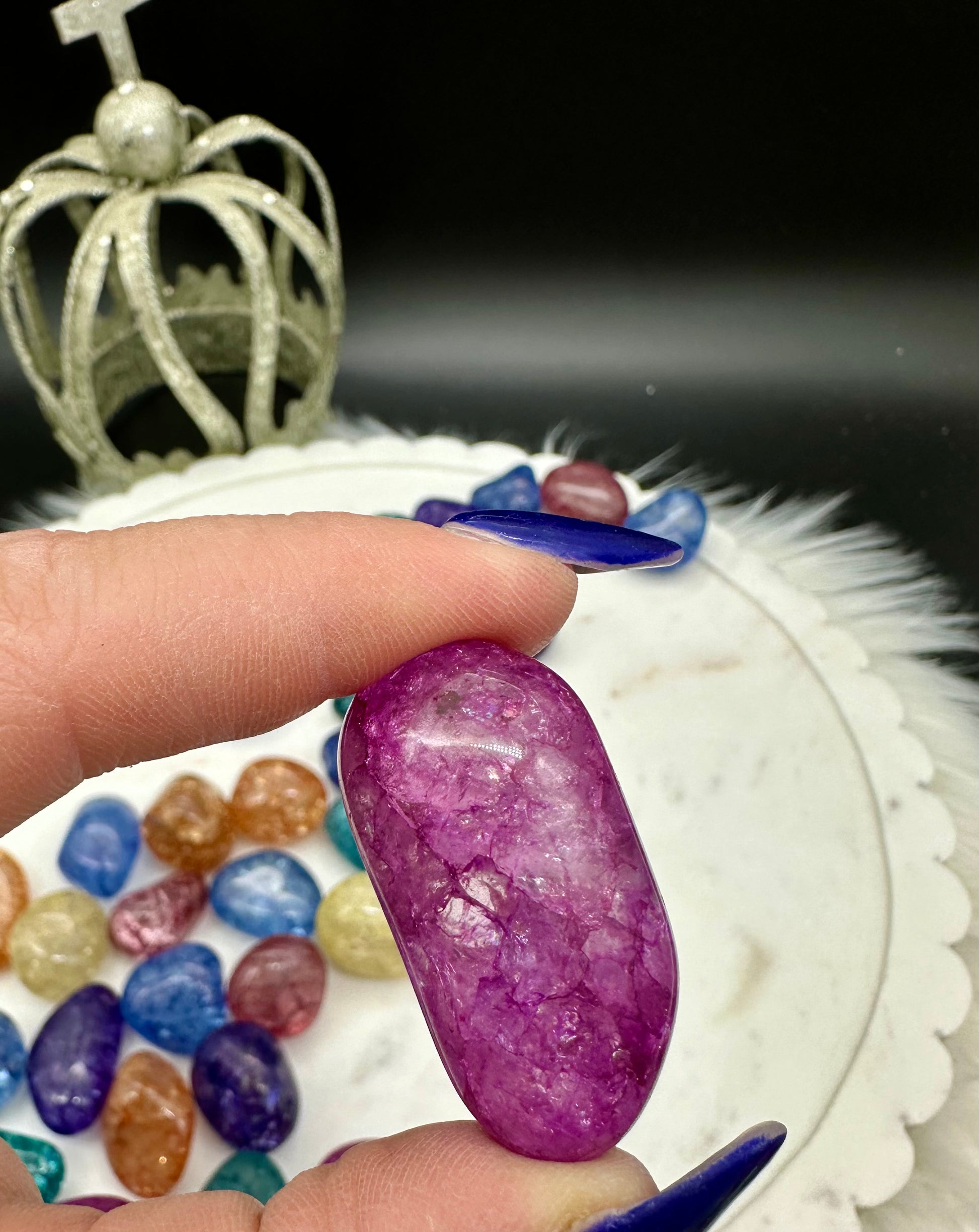 Dieser besondere Trommelstein besteht aus echtem Bergkristall, der durch ein kontrolliertes Erhitzen und Abschrecken bewusst „gecrasht“ wurde, dabei entstehen faszinierende innere Risse, die das Licht auf einzigartige Weise brechen. Anschließend wird der Stein in leuchtenden Farben gefärbt, wodurch er wie ein kleiner, funkelnder Schatz wirkt.