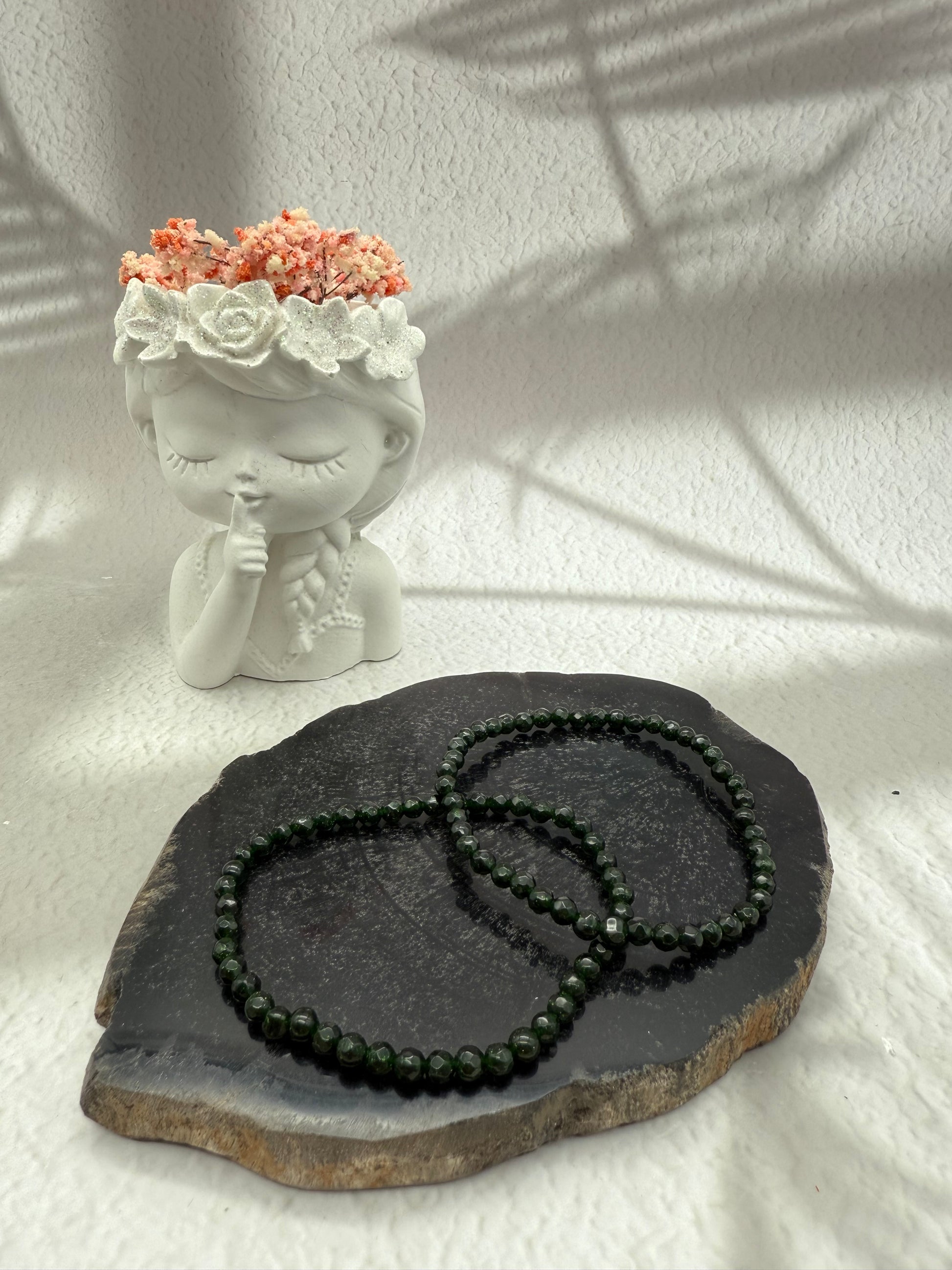 Grünfluss-Armband – Facettierte 4 mm Perlen auf Gummi