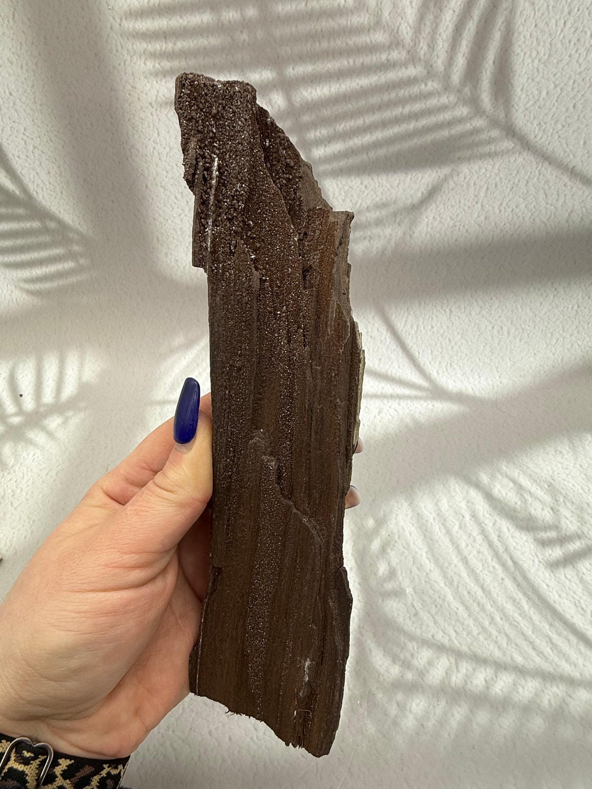 Dieses außergewöhnliche versteinertes Holz, liebevoll „Feenholz“ genannt, zieht mit seinem funkelnden Schimmer und der natürlichen Maserung sofort alle Blicke auf sich. Die einzigartige Struktur und der glitzernde Effekt machen jedes Stück zu einem faszinierenden Unikat – perfekt als dekorativer Blickfang für Wohnraum, Schreibtisch oder als besonderes Sammlerstück.