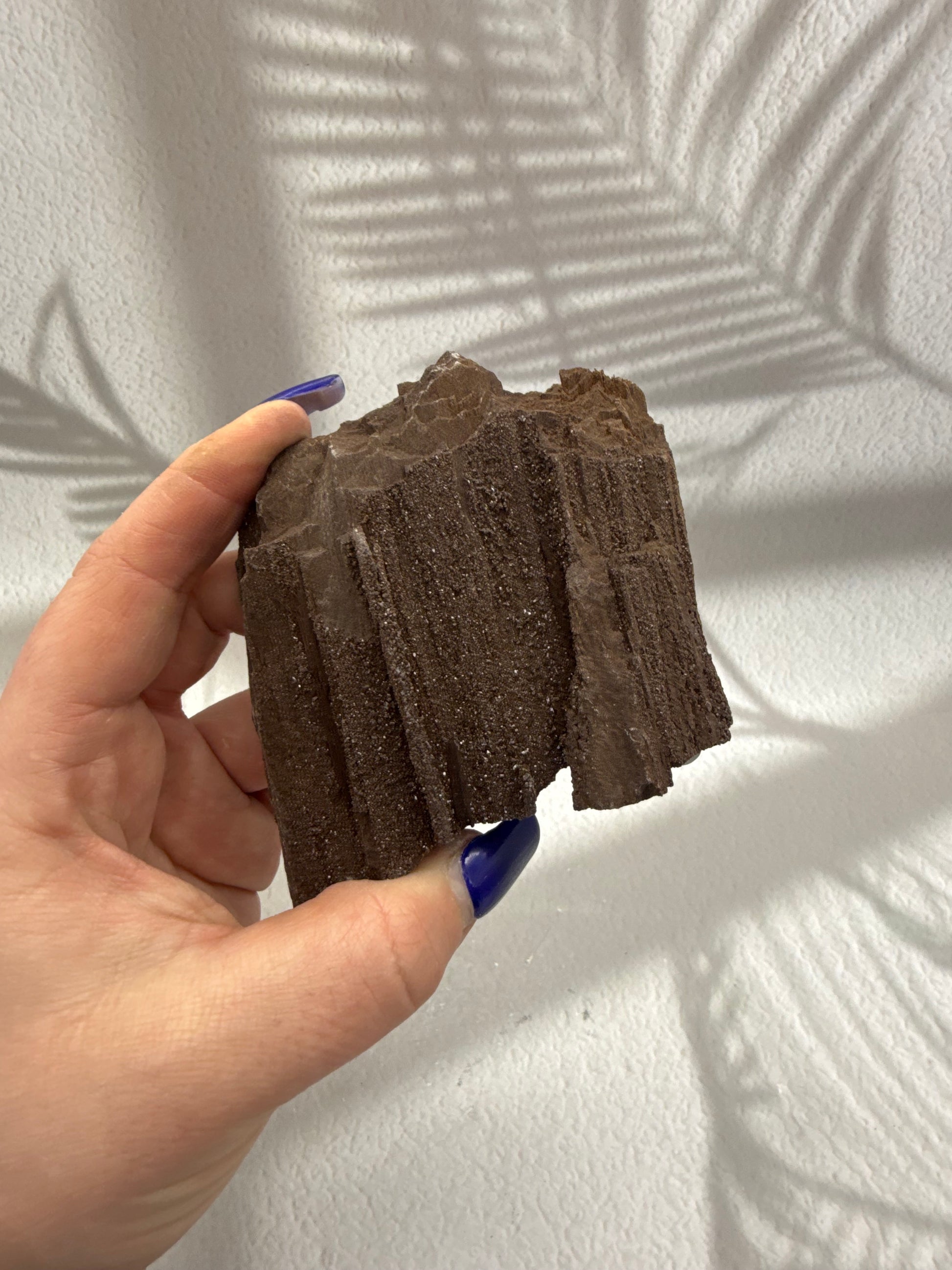 Dieses außergewöhnliche versteinertes Holz, liebevoll „Feenholz“ genannt, zieht mit seinem funkelnden Schimmer und der natürlichen Maserung sofort alle Blicke auf sich. Die einzigartige Struktur und der glitzernde Effekt machen jedes Stück zu einem faszinierenden Unikat – perfekt als dekorativer Blickfang für Wohnraum, Schreibtisch oder als besonderes Sammlerstück.