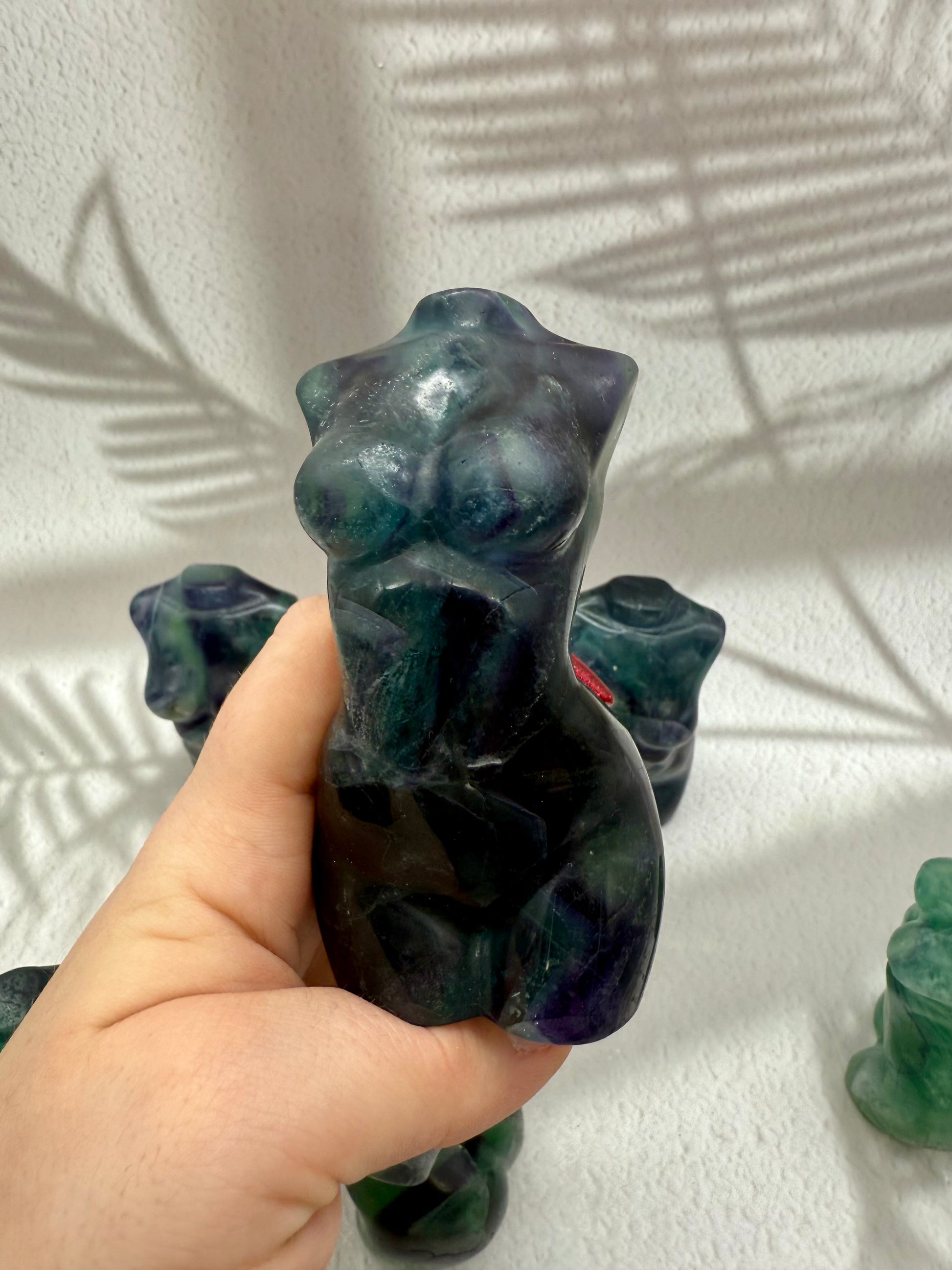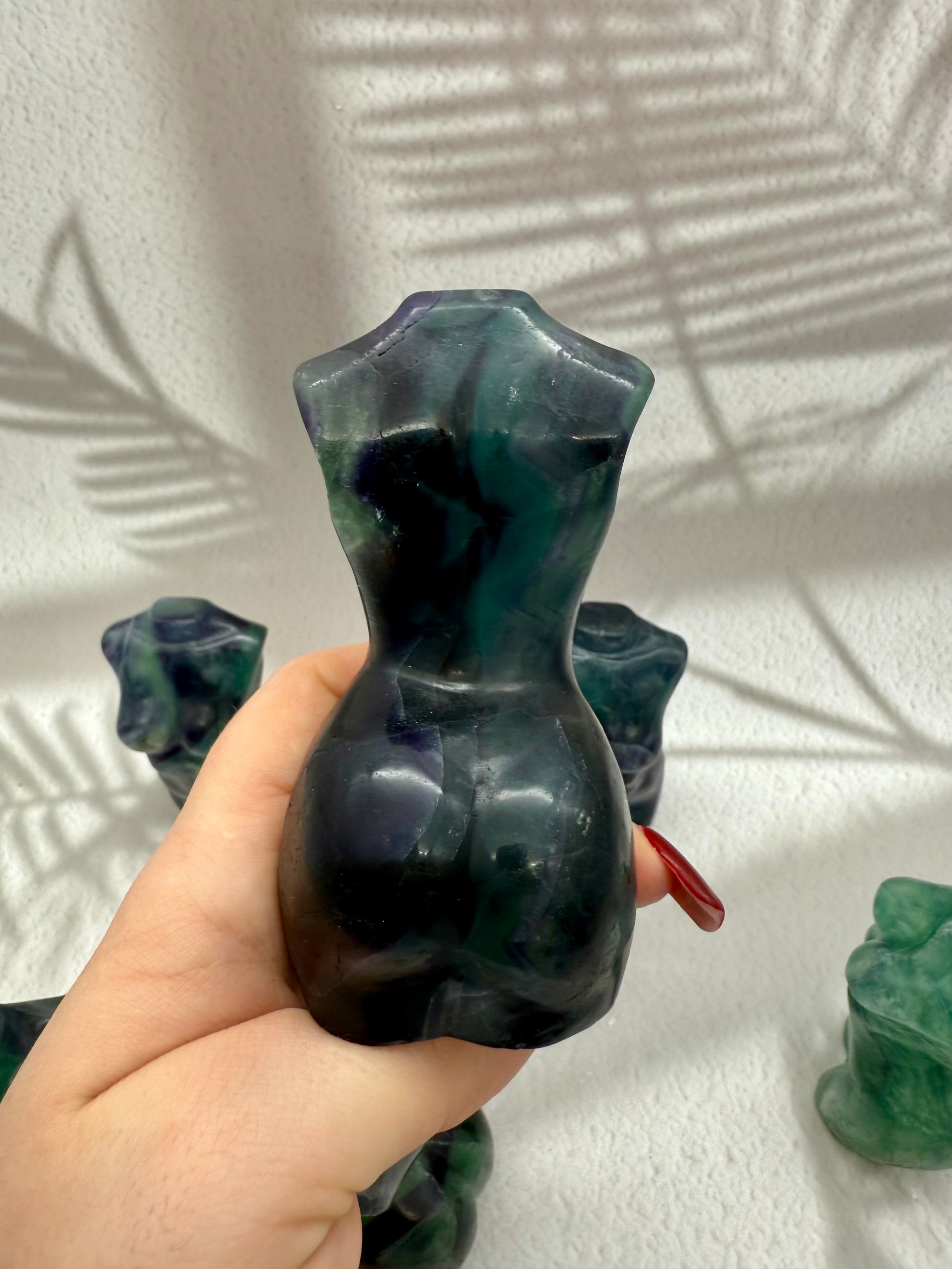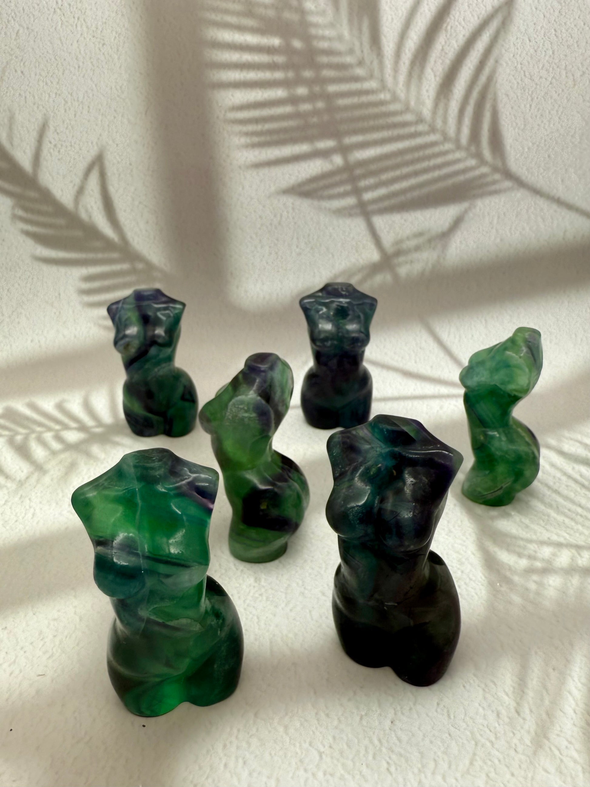 Diese elegant gearbeiteten Frauenkörper aus Fluorit vereinen die natürliche Farbvielfalt des Edelsteins mit der kraftvollen Symbolik des weiblichen Körpers. Die sanften Verläufe in Grün-, Blau- und Violetttönen verleihen jedem Stück eine einzigartige Tiefe, während die glatte, harmonische Form die Schönheit und Stärke des Femininen hervorhebt. Als dekoratives Highlight strahlt die Figur sowohl Ästhetik als auch Ruhe aus.
