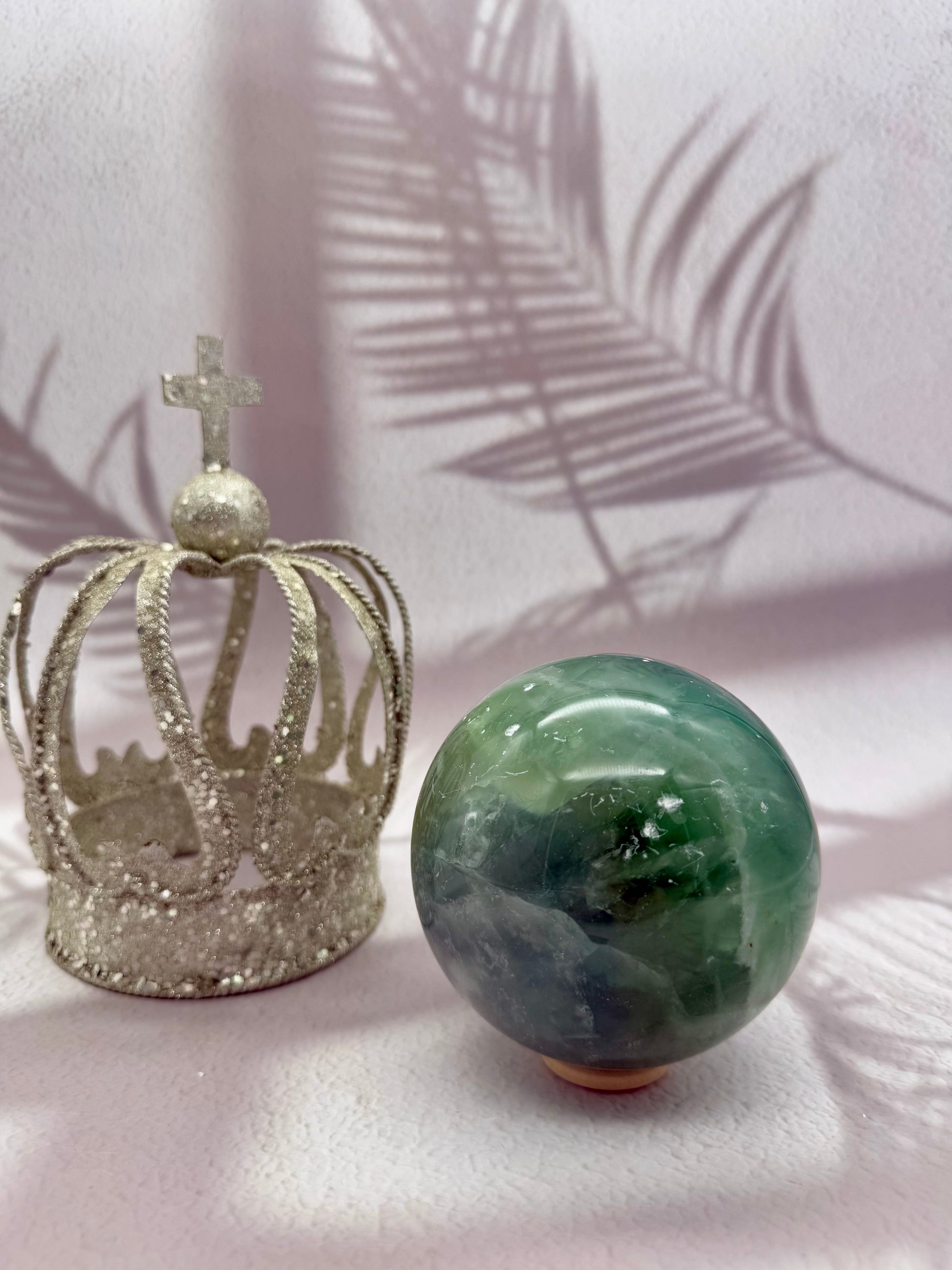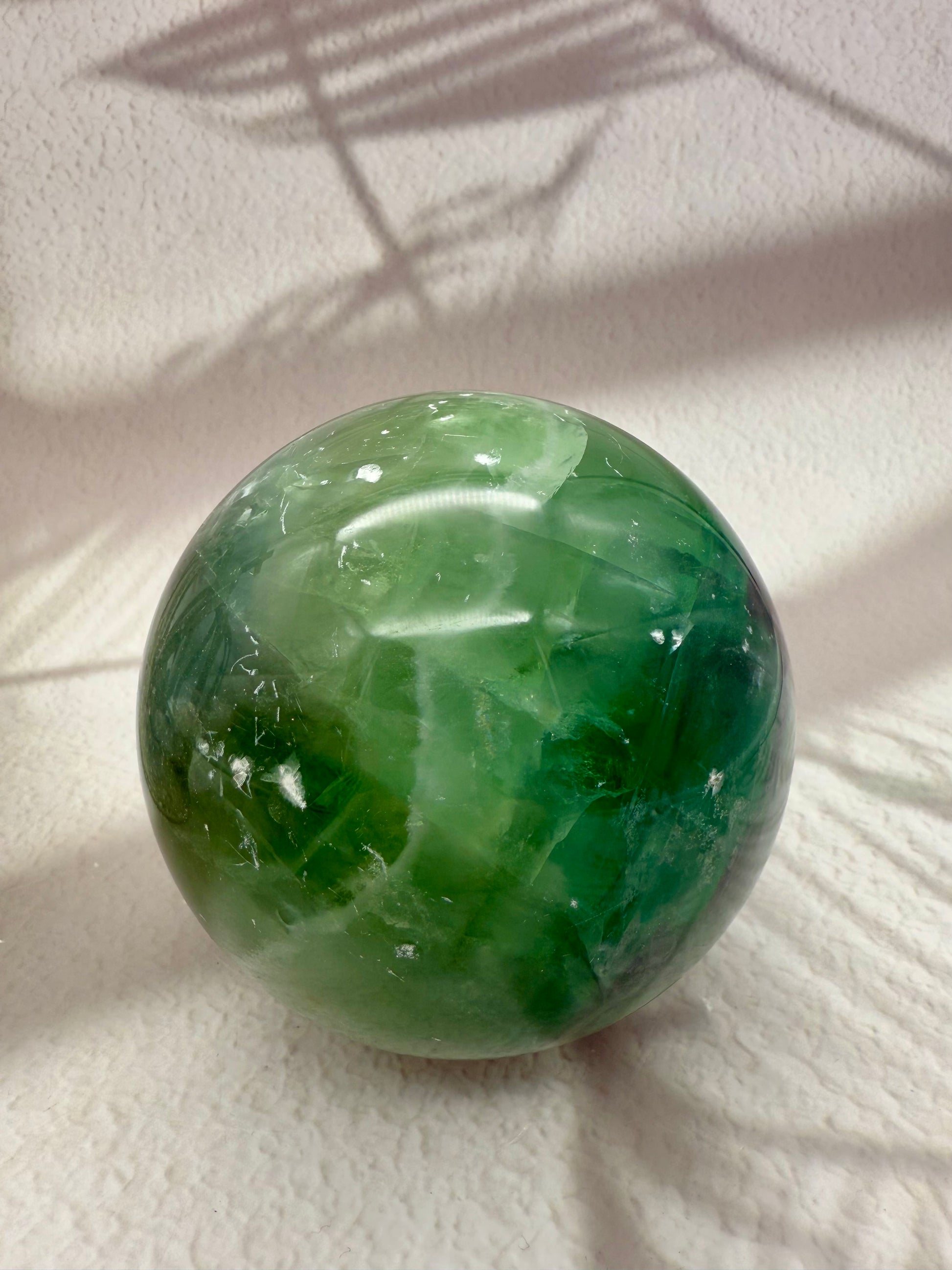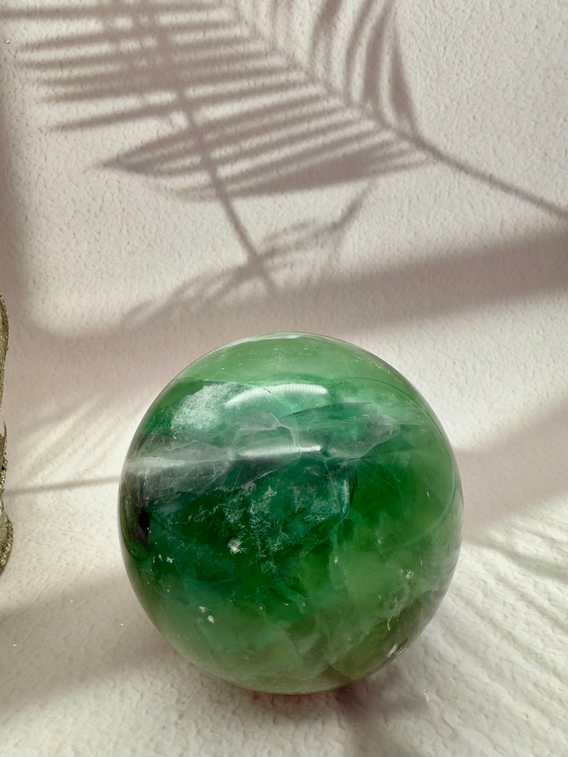 Diese große, naturbelassene und hochwertig polierte Kugel aus Fluorit begeistert durch ein faszinierendes Farbspiel in satten Grüntönen, tiefem Violett und beruhigendem Blau, ein harmonisches Zusammenspiel, das sowohl optisch als auch energetisch pure Magie ausstrahlt.