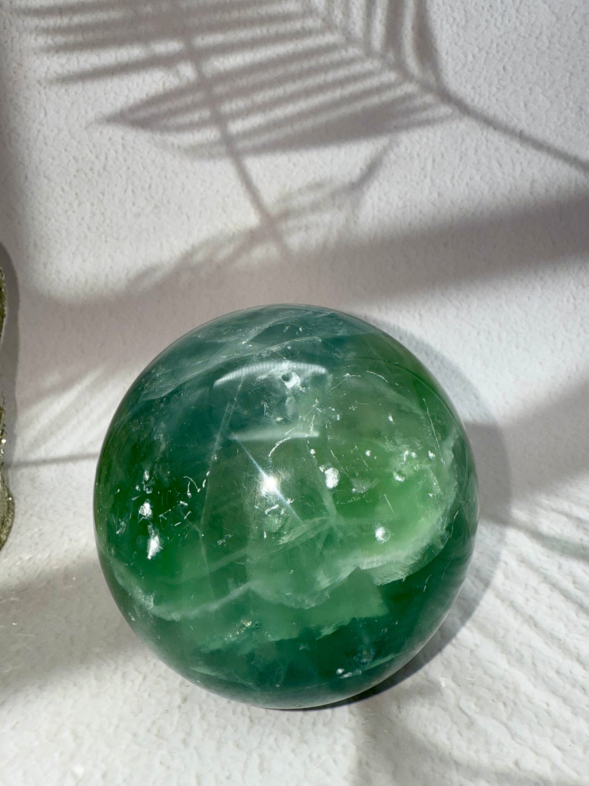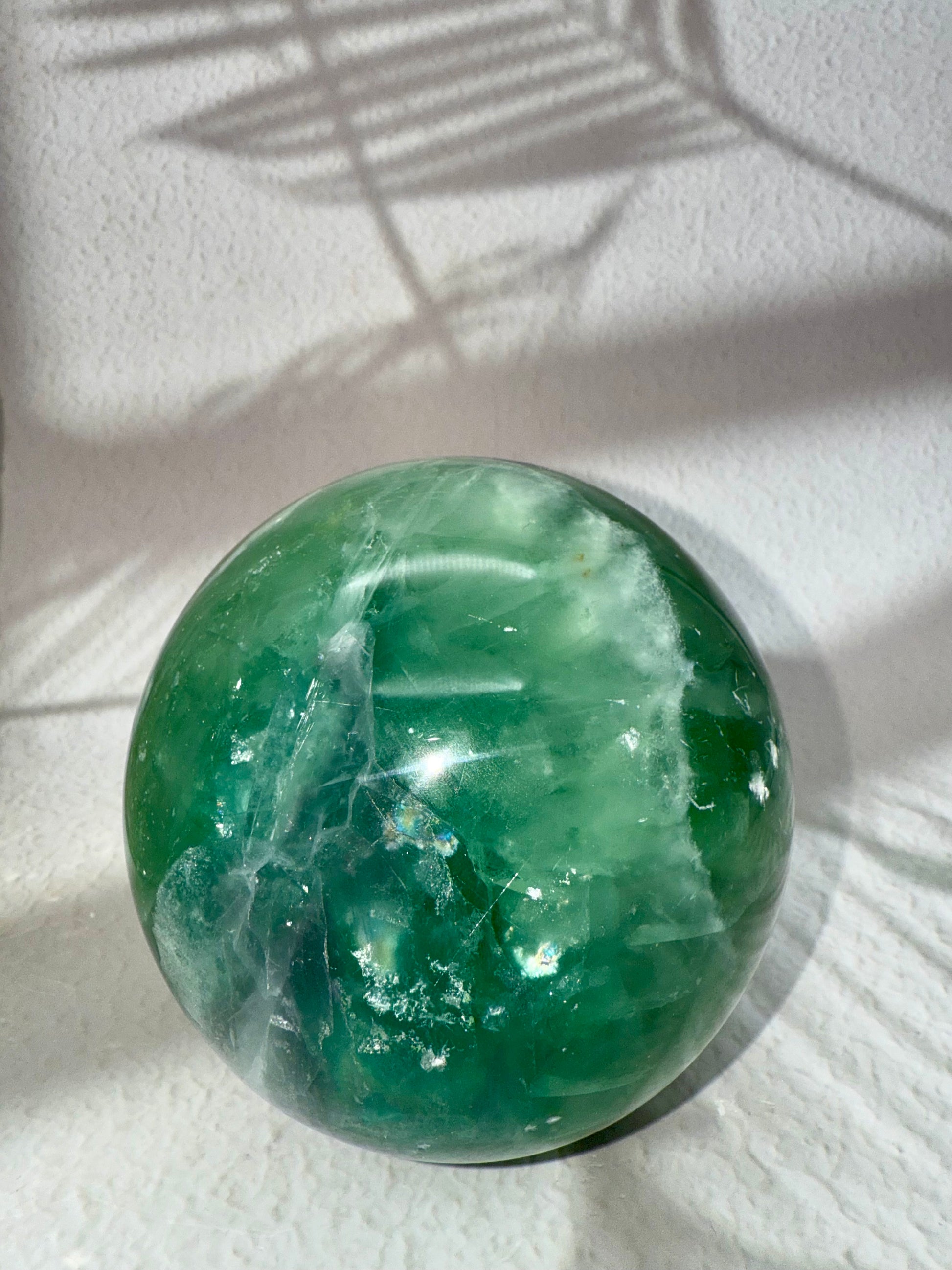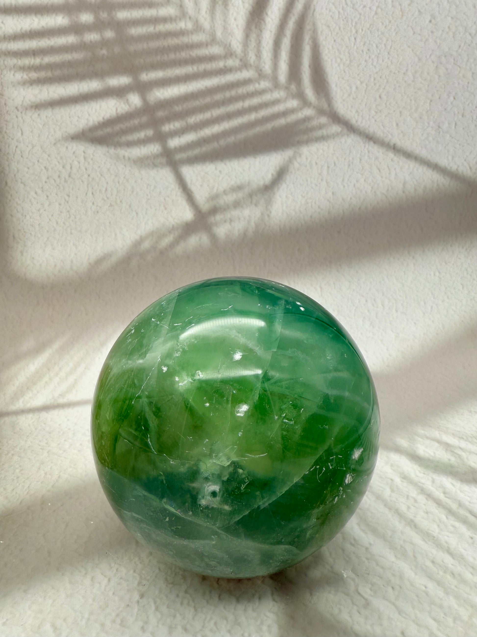 Diese große, naturbelassene und hochwertig polierte Kugel aus Fluorit begeistert durch ein faszinierendes Farbspiel in satten Grüntönen, tiefem Violett und beruhigendem Blau, ein harmonisches Zusammenspiel, das sowohl optisch als auch energetisch pure Magie ausstrahlt.