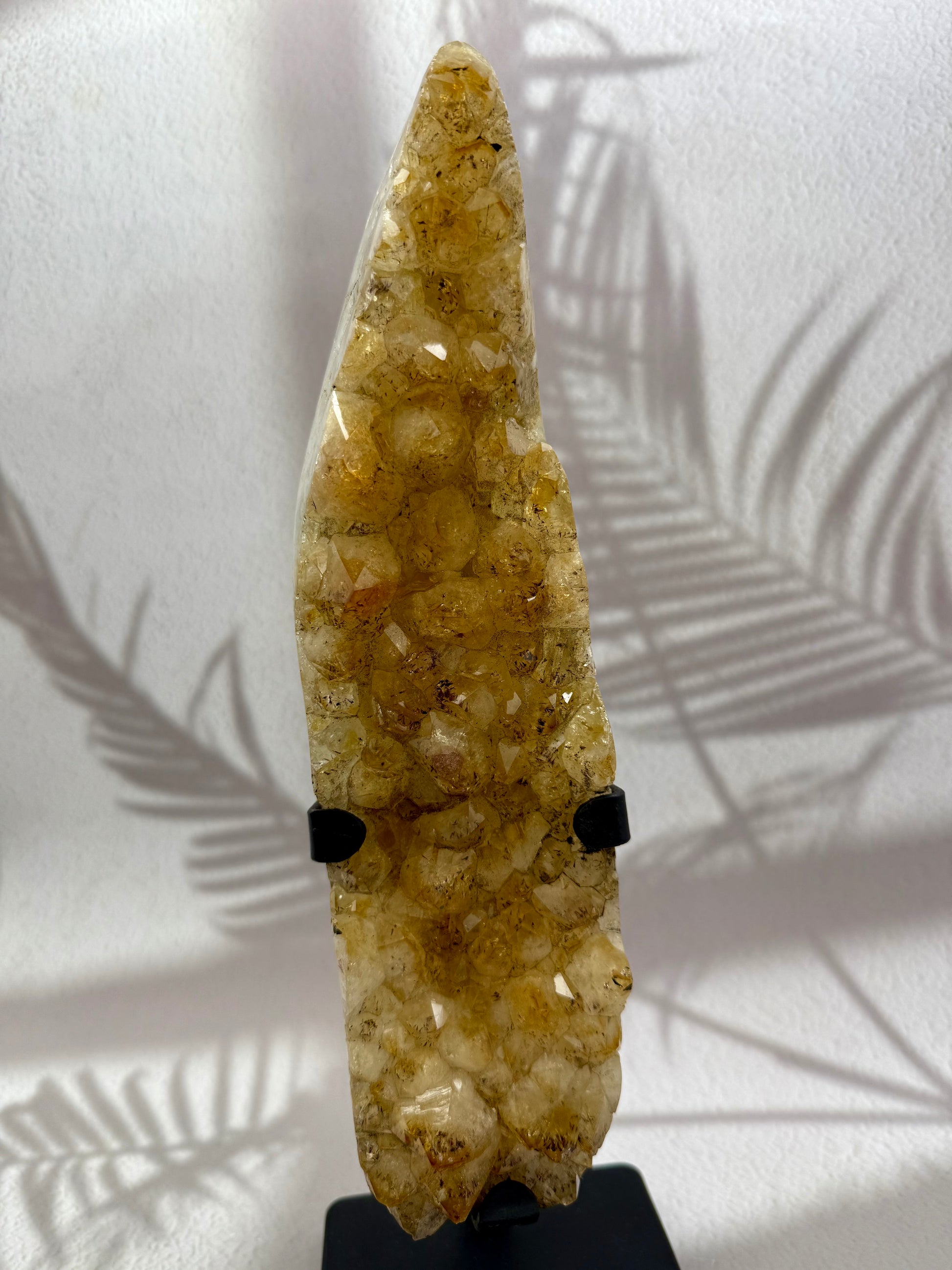 Dieser gebrannte Citrin auf einem eleganten Metallständer vereint warme Sonnenkraft mit stilvoller Präsentation. Die leuchtend goldgelben Kristalle funkeln im Licht und ziehen die Blicke auf sich. Auf dem Ständer präsentiert, wird der Citrin zu einem dekorativen Highlight und zugleich zu einem kraftvollen Energiespender in deinem Raum.