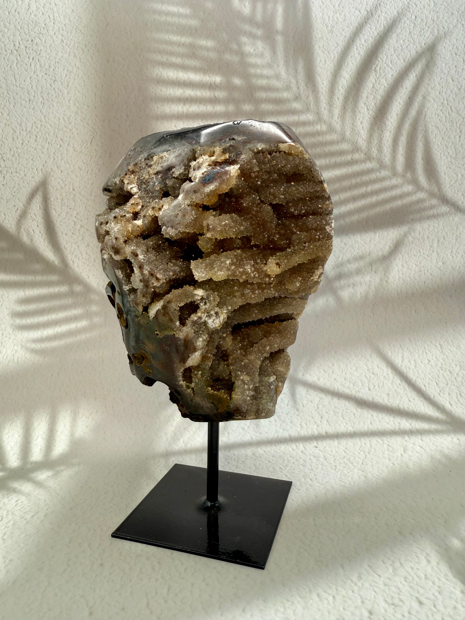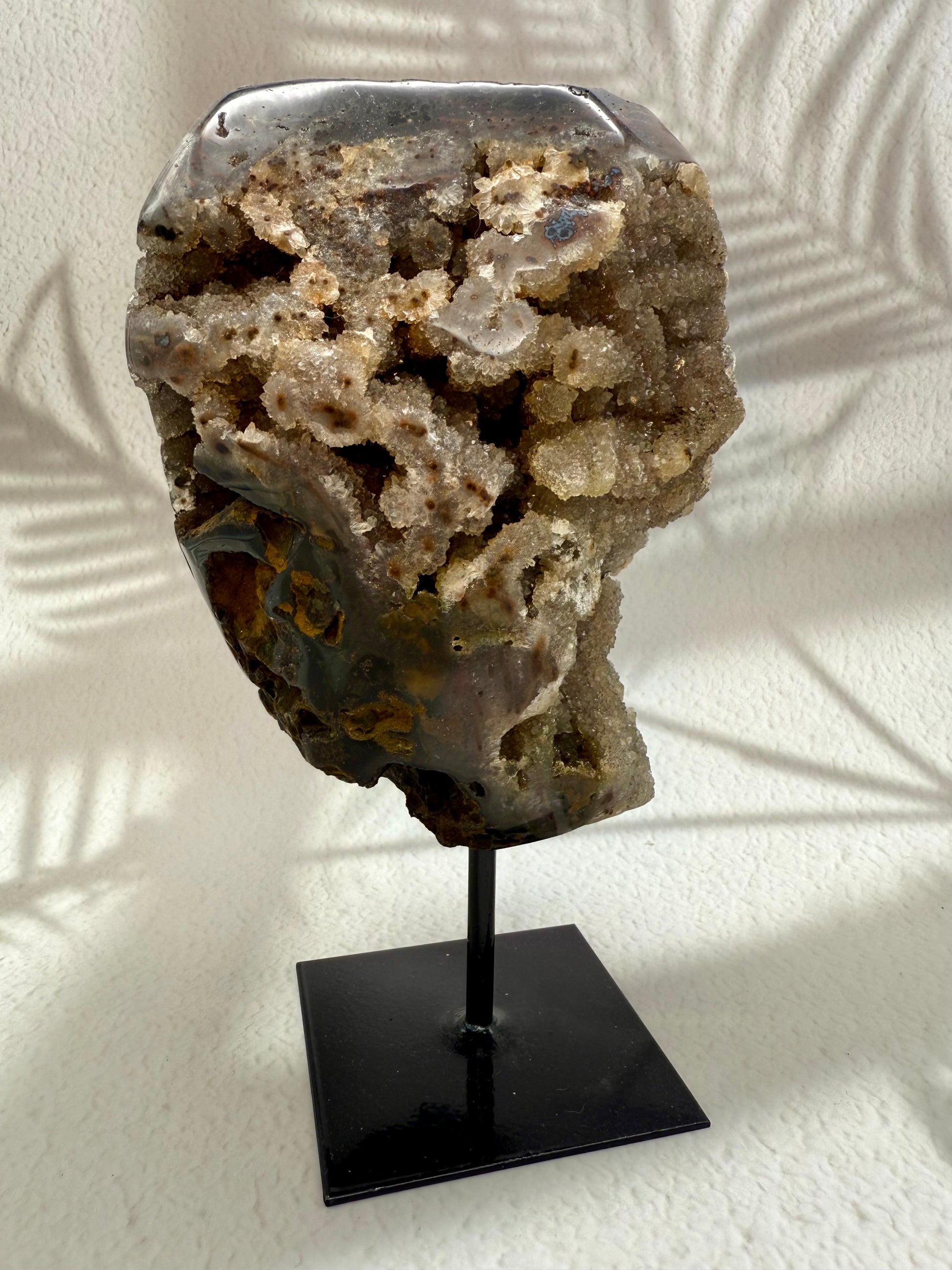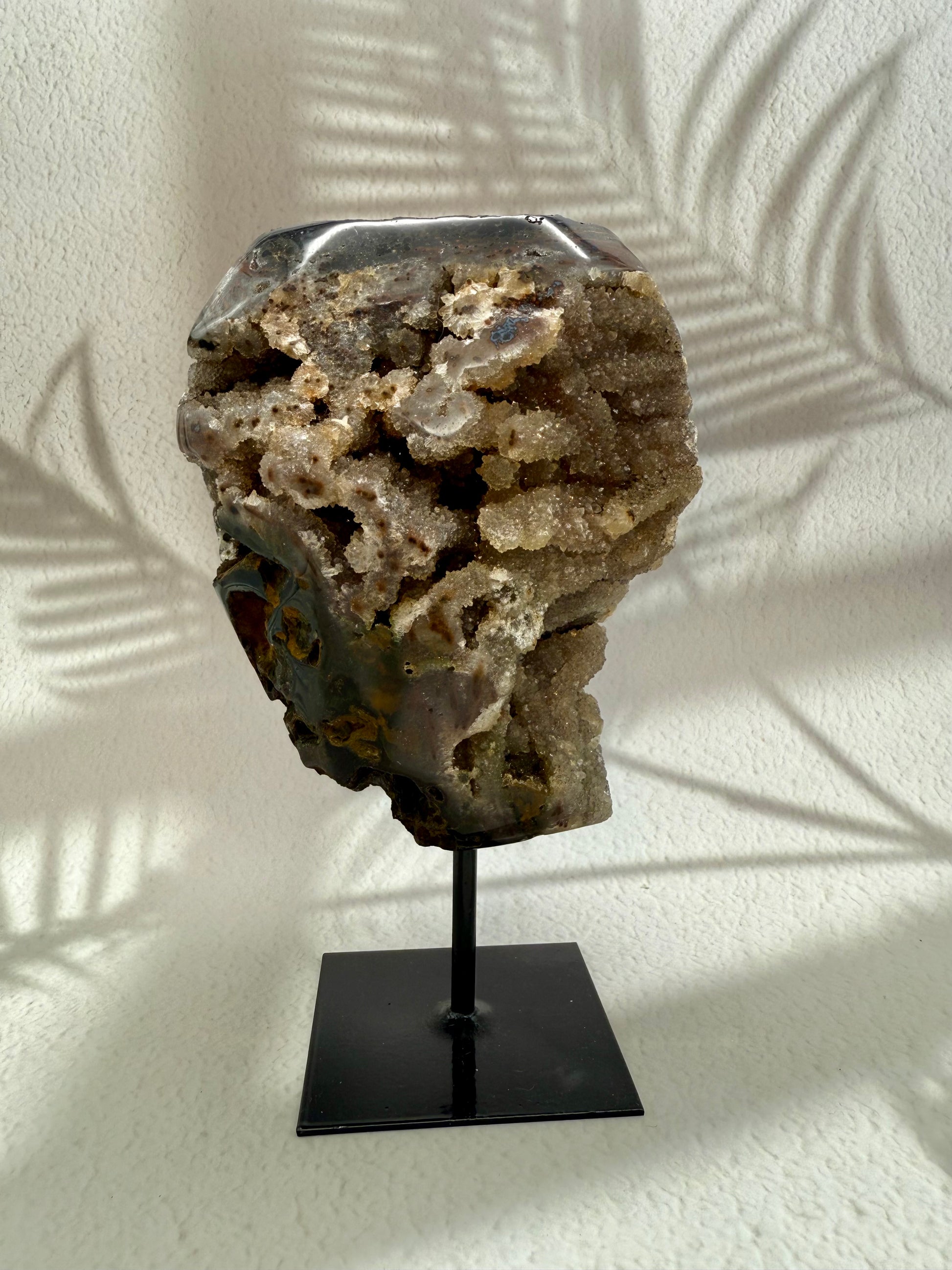 Dieser außergewöhnliche Glitzerachat auf einem edlen Metallständer vereint natürliche Erdung mit faszinierendem Glanz. Die funkelnden Kristallflächen schimmern im Licht und ziehen alle Blicke auf sich. Durch die stilvolle Präsentation auf dem Ständer wird der Achat nicht nur zu einem dekorativen Highlight, sondern auch zu einem wirkungsvollen Energiespender in deinem Zuhause oder Arbeitsraum.
