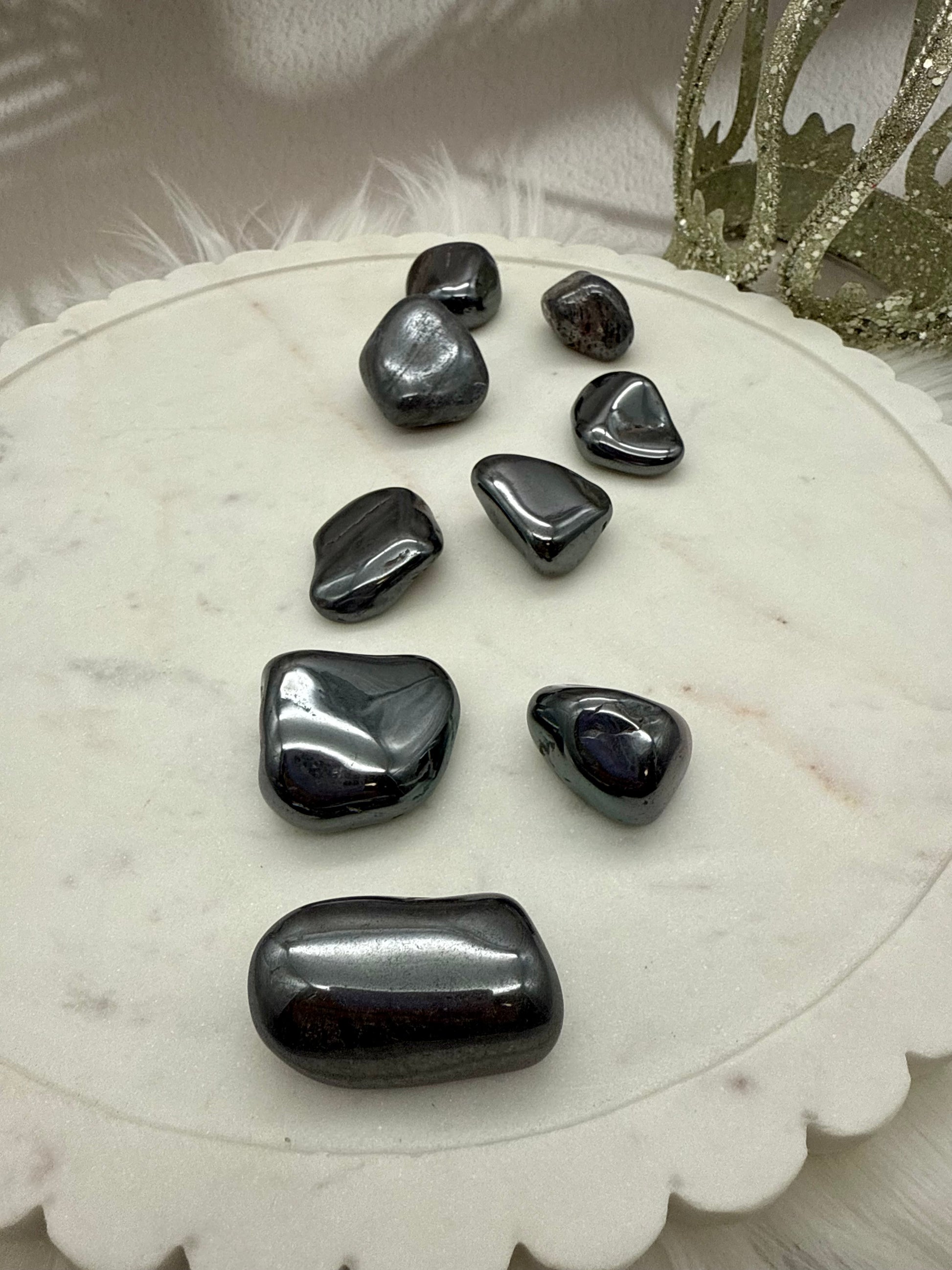 - Als Handschmeichler: Durch seine glatte Oberfläche liegt der Hämatit angenehm in der Hand und eignet sich ideal zum Mitführen in der Hosentasche oder als Begleiter in stressigen Momenten.