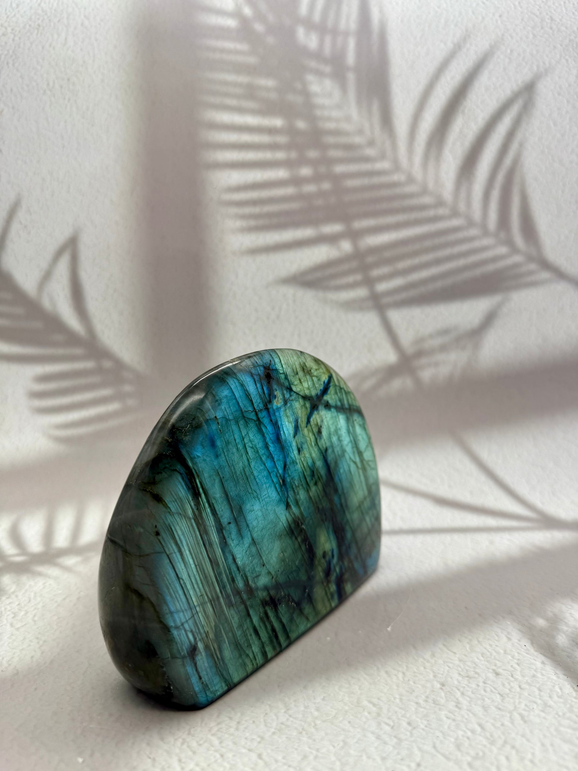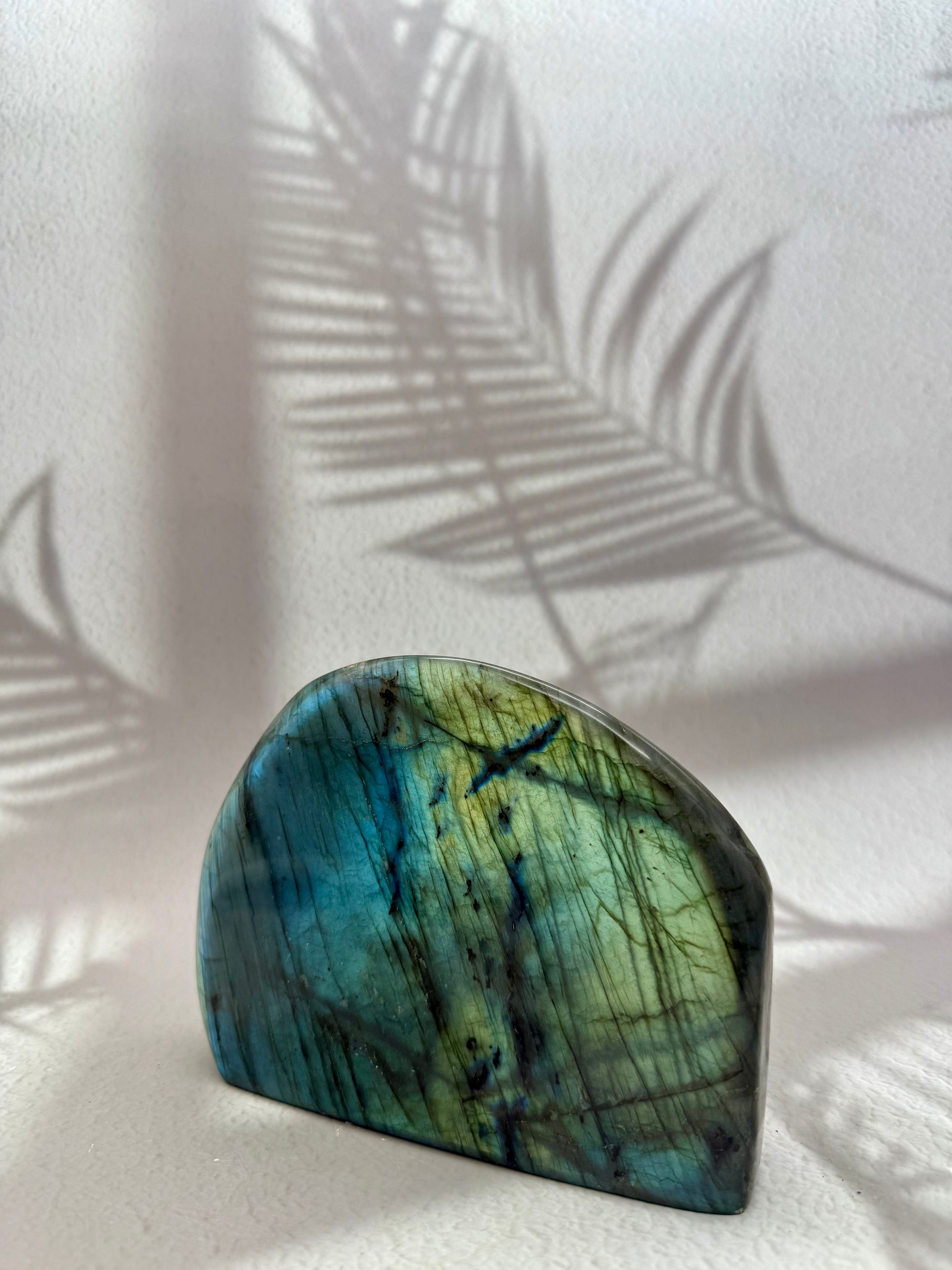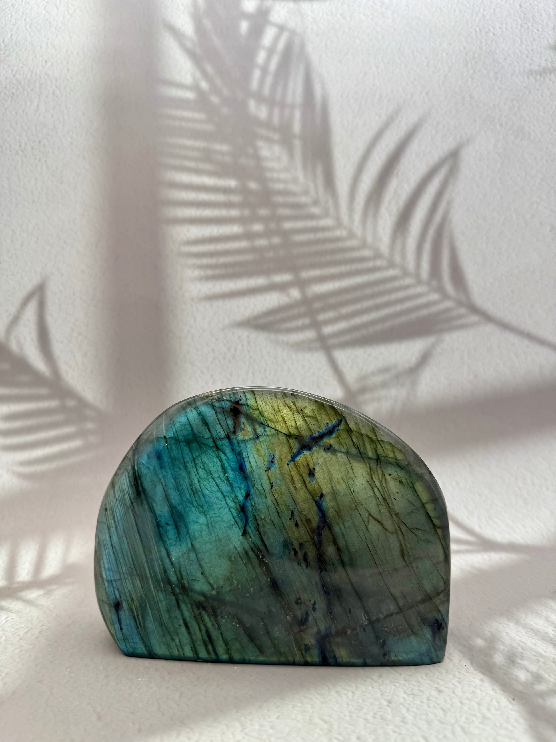 Labradorit gilt als Stein der Intuition, Schutzenergie und Transformation. In Freiform entfaltet er seine harmonische Wirkung besonders schön – ideal als Dekoration, Meditationsbegleiter oder Geschenk.