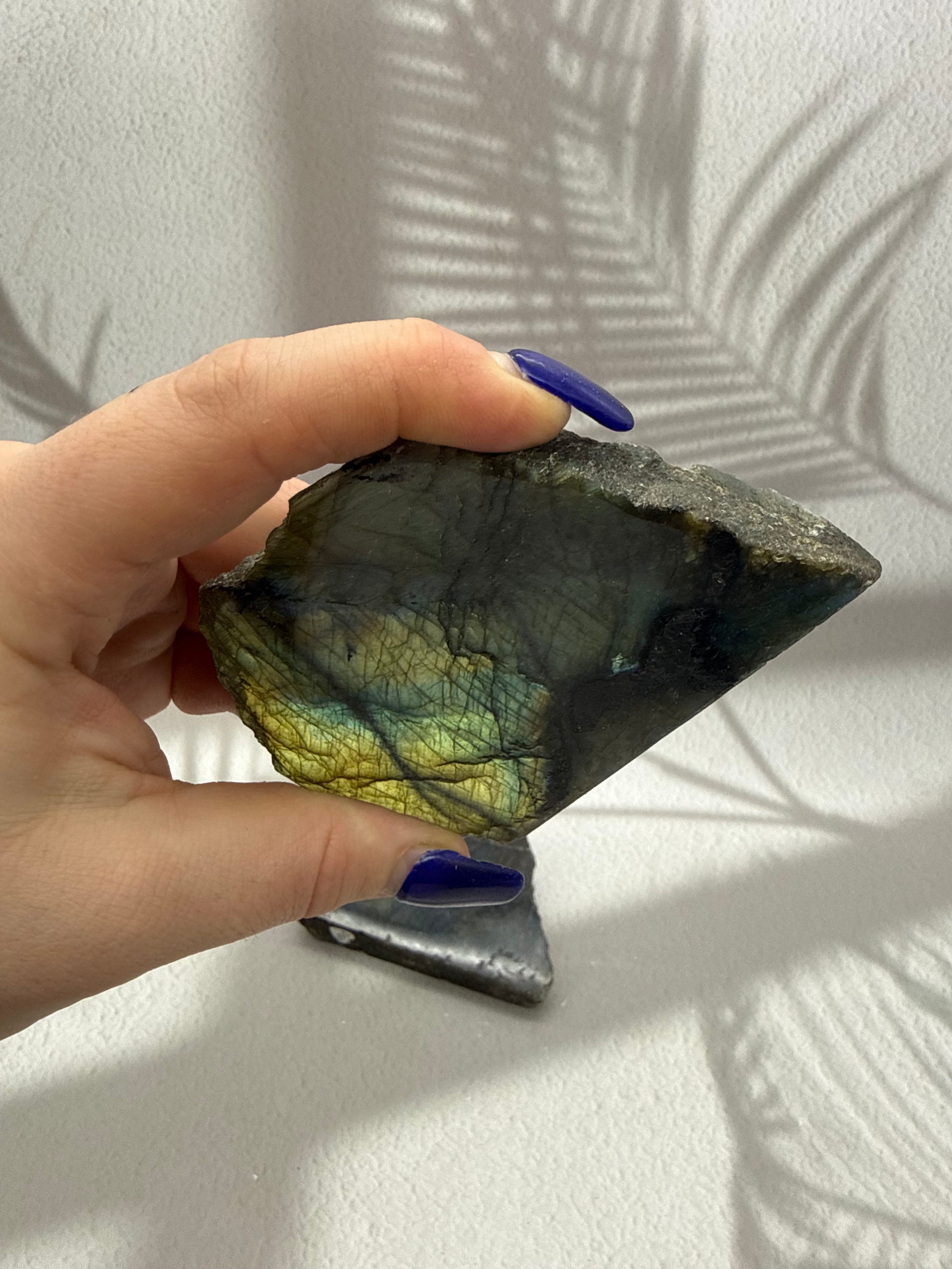 Diese besonderen Labradorit Stücke vereinen zwei Ausdrucksformen eines einzigen Natursteins: oben fein poliert, unten roh belassen. Die polierte Oberfläche bringt das faszinierende Farbspiel des Labradorits besonders intensiv zur Geltung – mit schimmernden Blau-, Türkis- und Lilatönen, die je nach Lichteinfall lebendig erscheinen. Der rohe Unterteil bewahrt die ursprüngliche Naturstruktur des Steins und verleiht jedem Stück eine kraftvolle, erdige Basis.