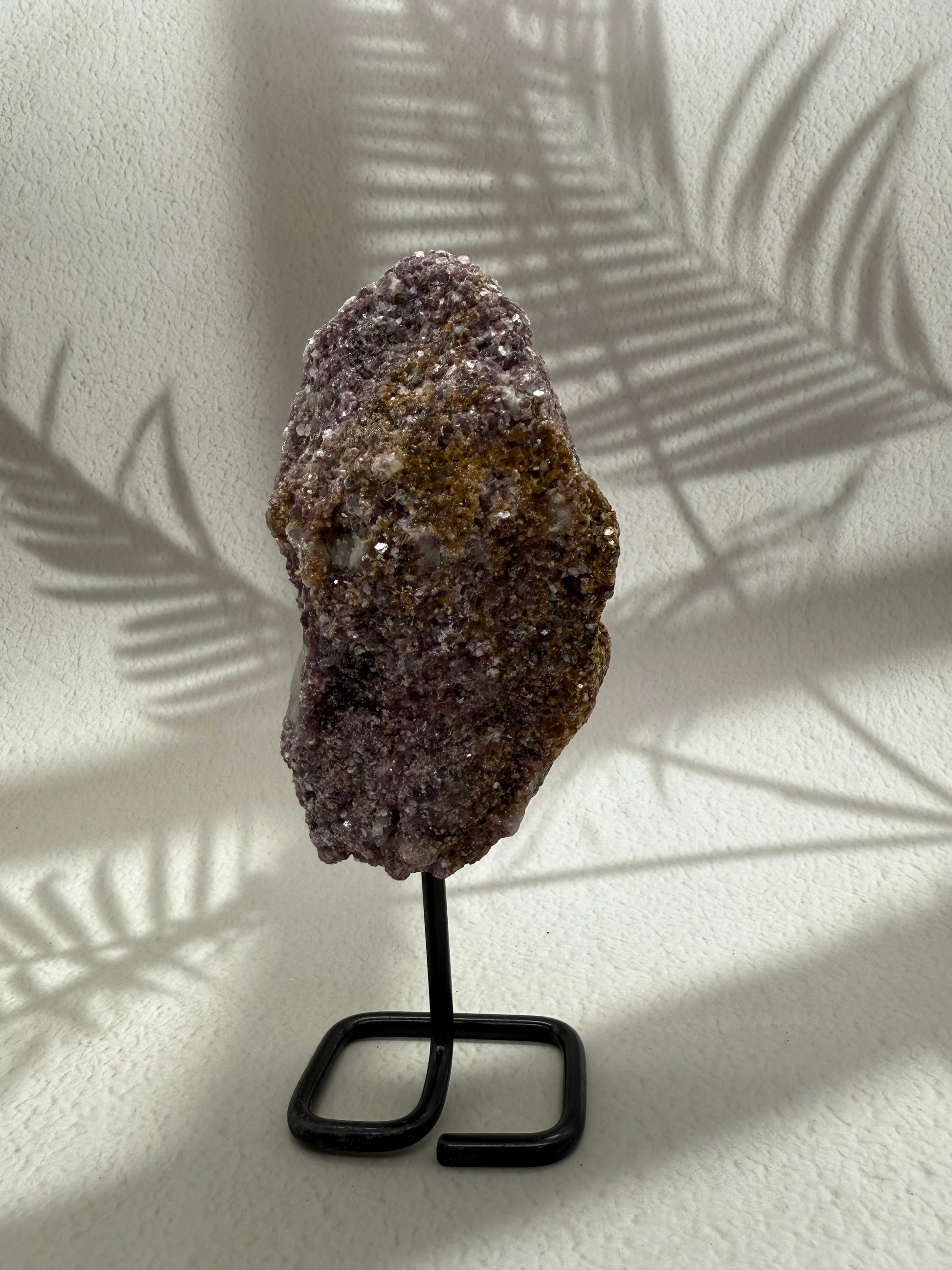 Dieser rohe Lepidolith auf einem eleganten Metallständer begeistert mit seiner einzigartigen, schimmernden Struktur in zarten Lila- und Rosétönen. Die naturbelassene Oberfläche unterstreicht die ursprüngliche Schönheit des Steins und macht ihn zu einem faszinierenden Blickfang. Auf dem Ständer präsentiert, verbindet er dekorative Eleganz mit wohltuender, energetischer Wirkung.