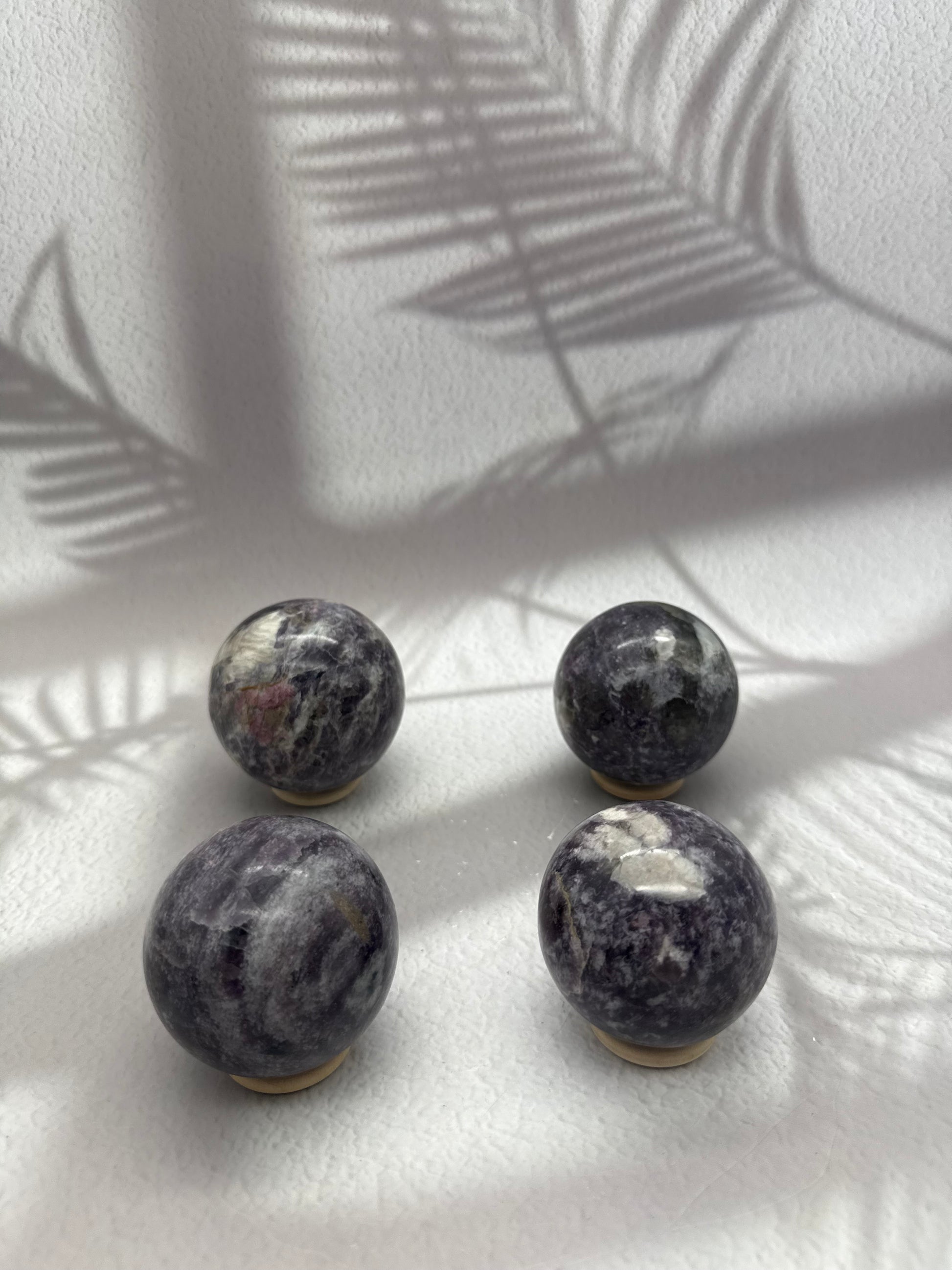 Diese vier großen Lepidolith-Kugeln beeindrucken durch ihre intensive dunkel-lila Farbgebung und die sanft schimmernden natürlichen Strukturen des Steins. Die perfekt polierte, runde Form macht jede Kugel zu einem kraftvollen Blickfang für Wohnraum, Meditationsplatz oder Arbeitsplatz und lädt zum Halten und Fühlen ein.