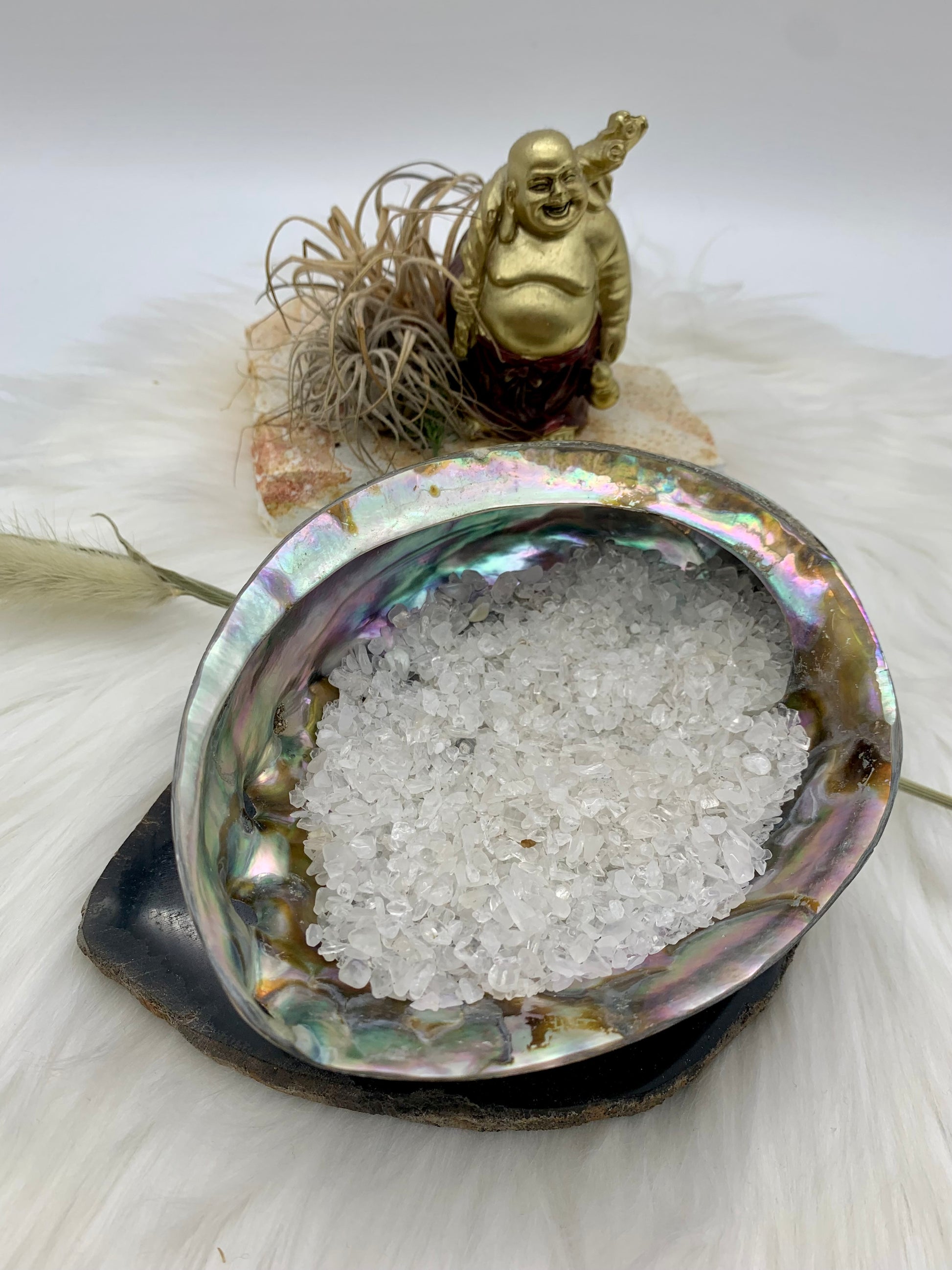 Legen Sie die Steine des Entlade-/Ladesets in eine Schüssel oder zum Beispiel in eine Abelone-Muschel.