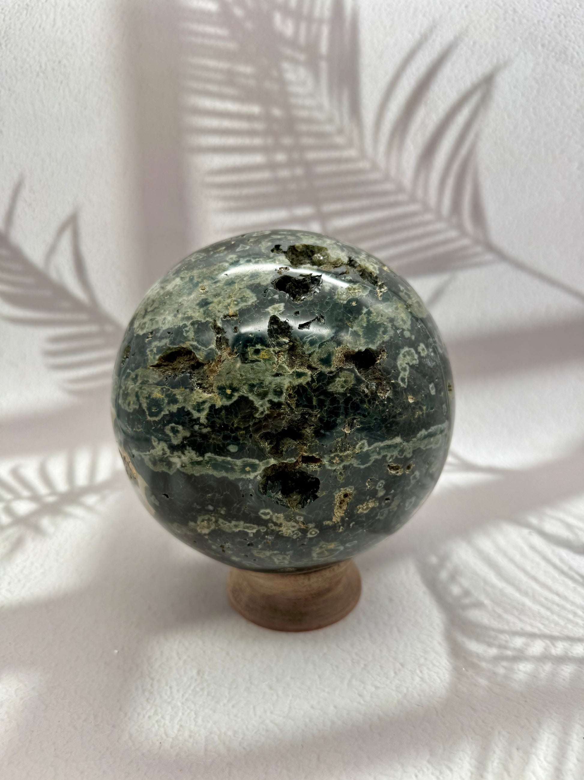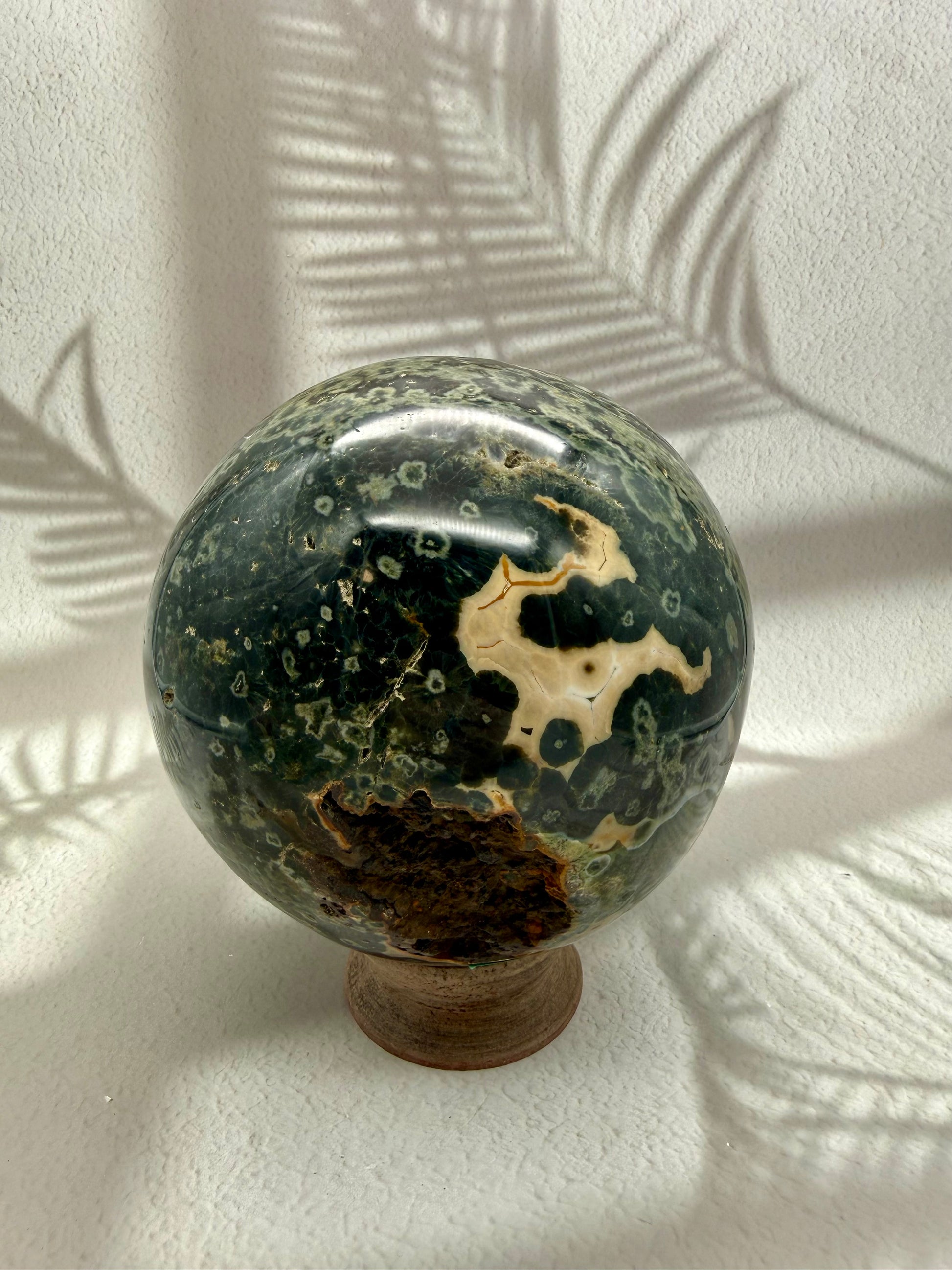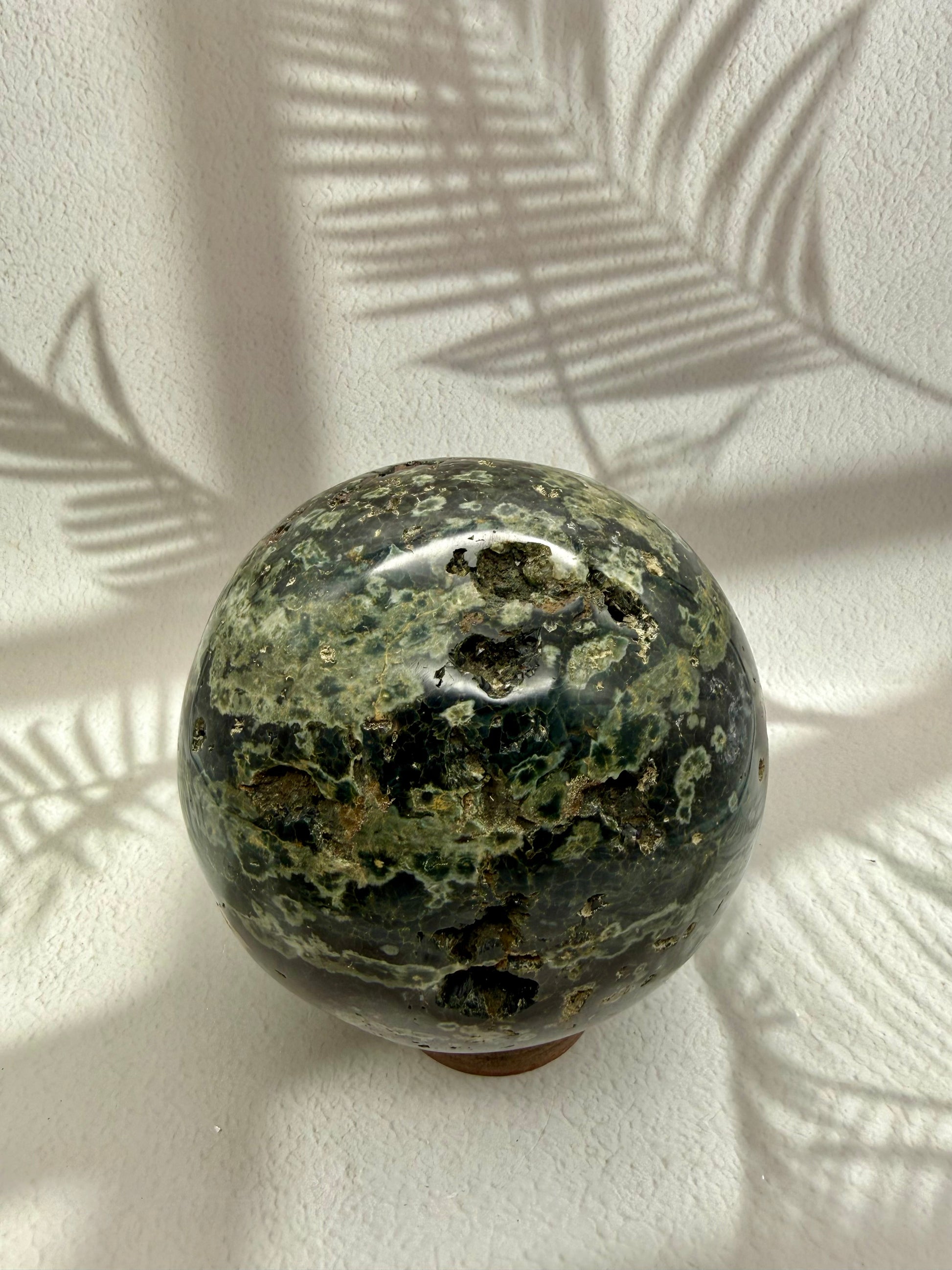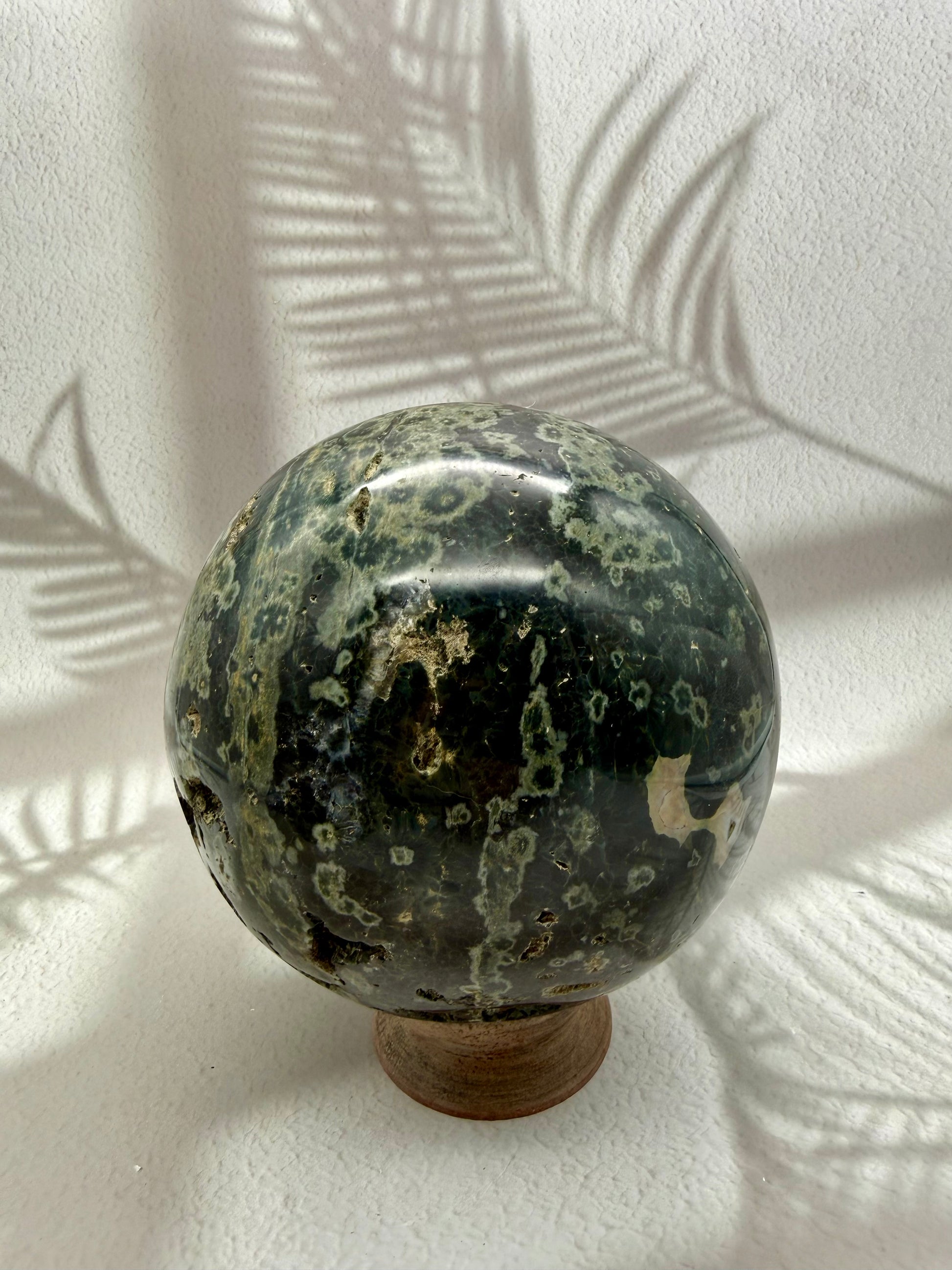 Diese außergewöhnliche Ocean Jaspis Kugel in tiefem Dunkelgrün ist eine echte Rarität und ein absolutes Sammlerstück. Ihre intensive Farbgebung, die natürlichen Musterungen und die kraftvolle Kugelform machen sie zu einem hochenergetischen Unikat mit starker Ausstrahlung und seltener Präsenz.
