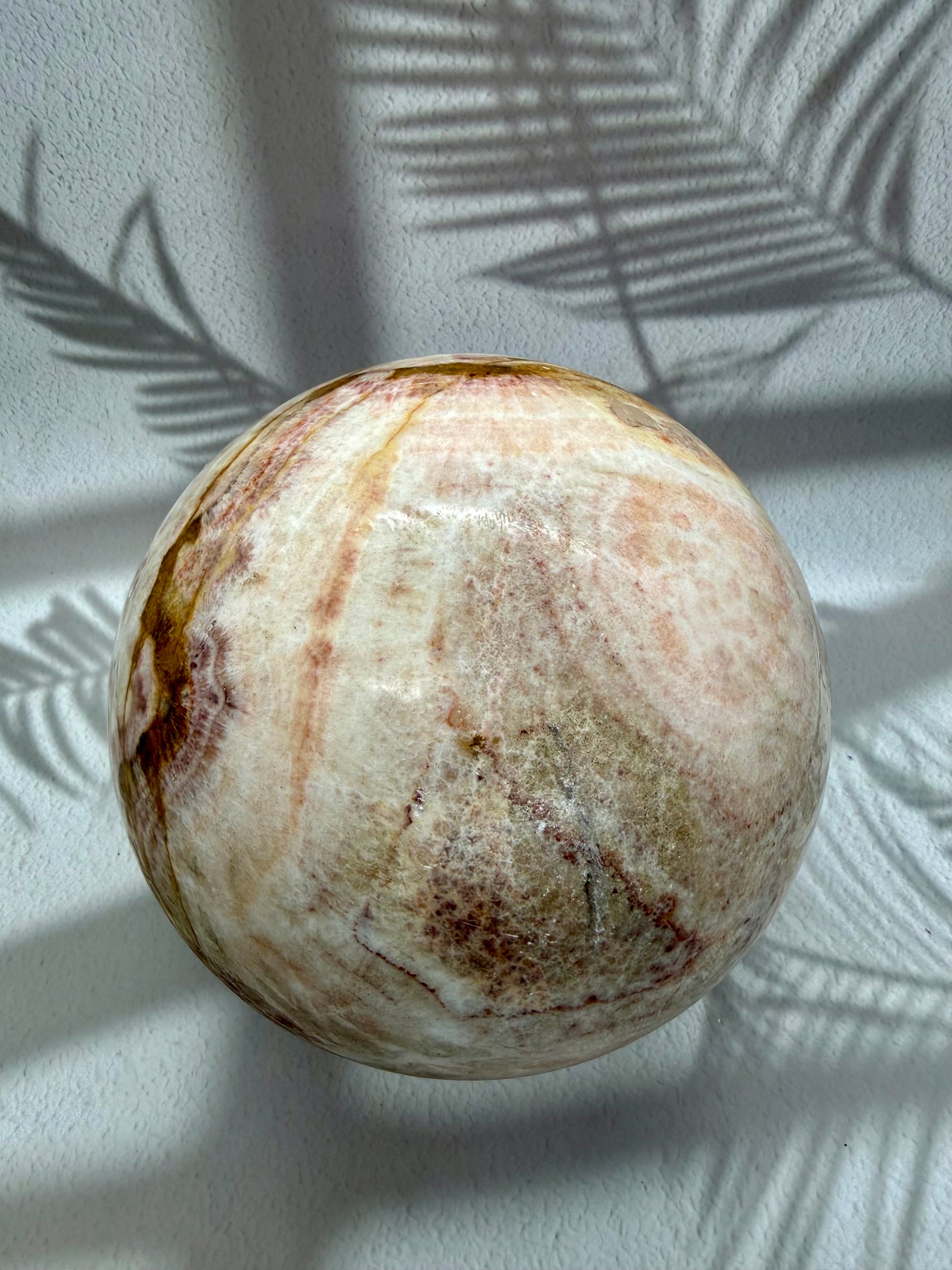 Diese monumentale Onyx Calcit Kugel ist ein absolutes Statement-Piece. Mit einem Gewicht von 14,2 kg und einem Durchmesser von 24 cm strahlt sie pure Präsenz, Kraft und Ruhe aus. Die natürlichen Schichtungen in warmen Creme-, Honig- und Erdtönen verleihen ihr eine edle, hochwertige Optik und eine außergewöhnlich harmonische Ausstrahlung.