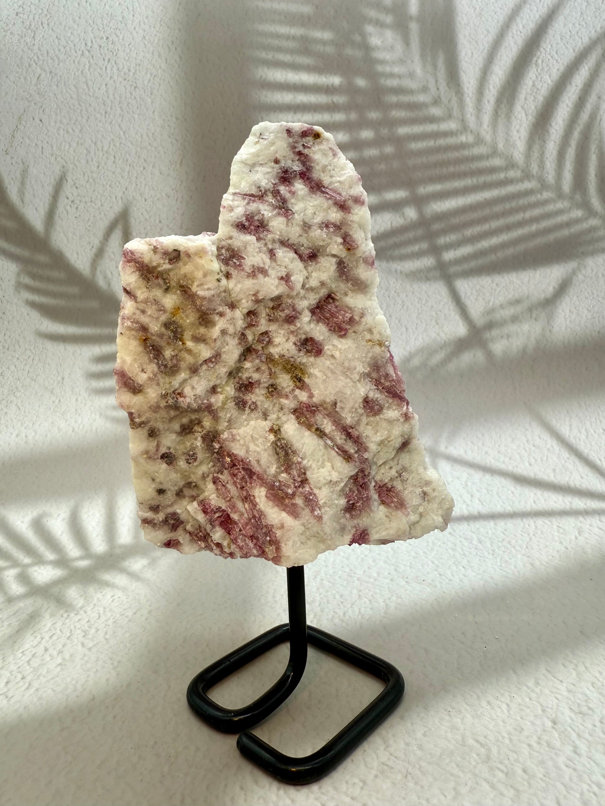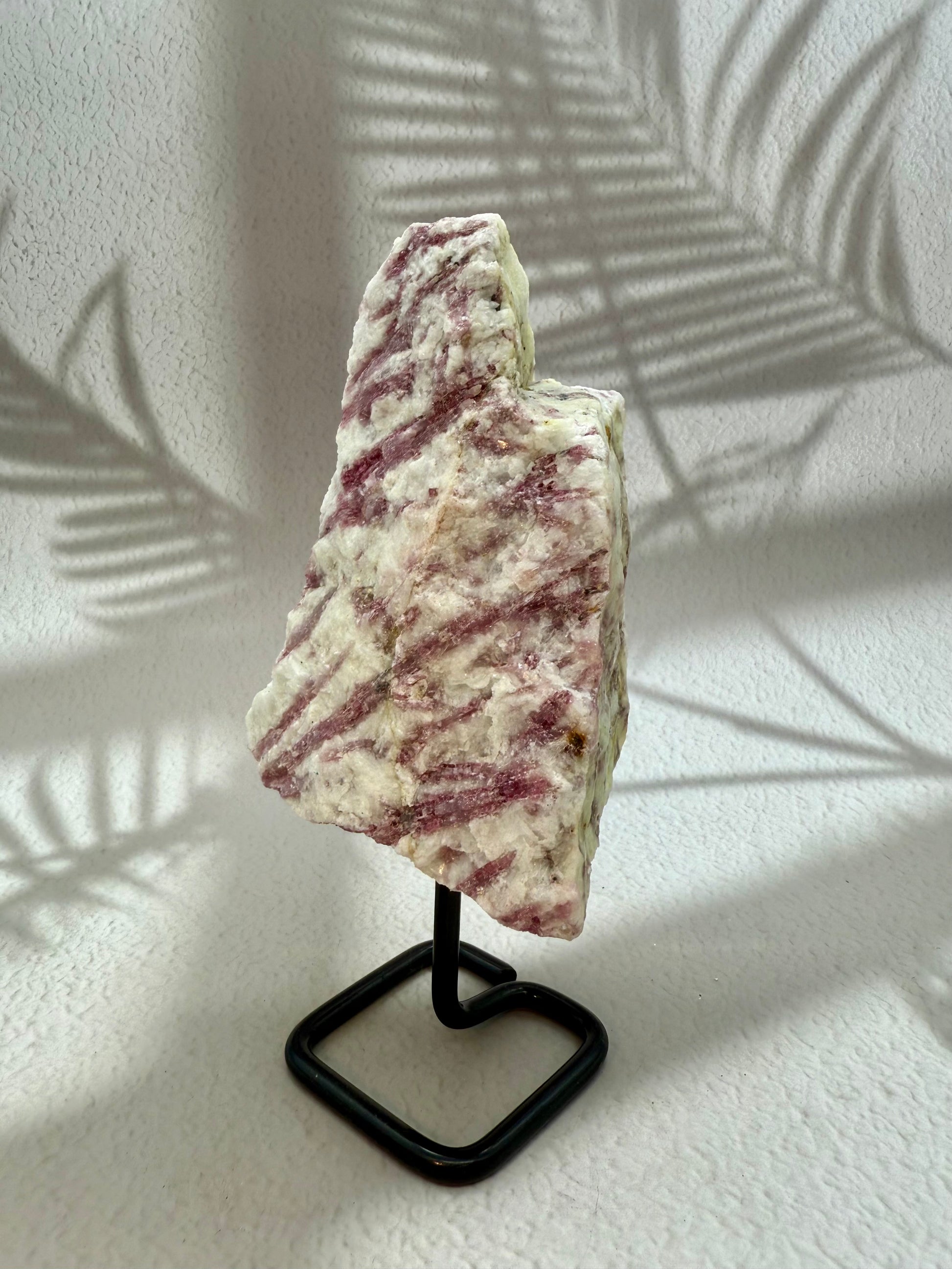 Dieser edle pinke Turmalin auf einem stabilen Metallständer vereint natürliche Schönheit mit kraftvoller Energie. Seine intensive rosa bis pinke Farbgebung strahlt Wärme, Liebe und Vitalität aus und macht ihn zu einem faszinierenden Blickfang in jedem Raum. Auf dem Ständer präsentiert, kommt die Eleganz des Steins noch stärker zur Geltung – ein dekoratives Highlight mit tiefgehender Bedeutung.