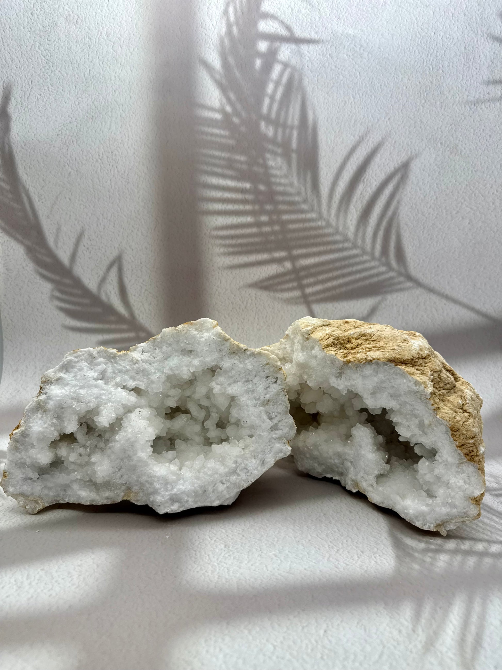 Quarz gilt als Stein der Klarheit, Energie und Reinigung. In Geodenform bündelt er seine Wirkung im Inneren und entfaltet beim Öffnen eine besonders strahlende Kraft. Als Paar stehen die Geoden für Harmonie, Ausgleich und Verbindung – ideal für Wohnräume, spirituelle Orte oder als Geschenk mit besonderer Symbolik.