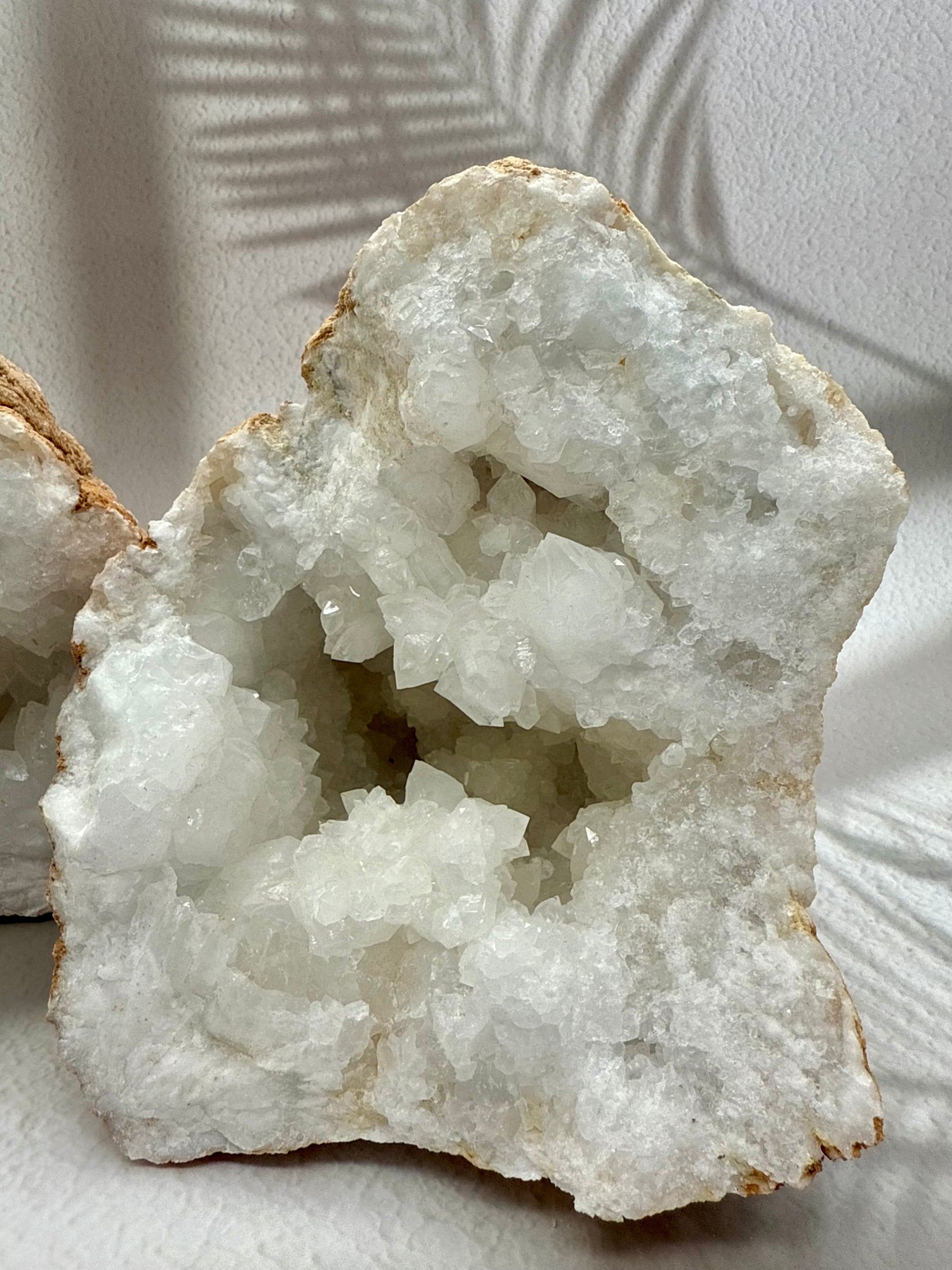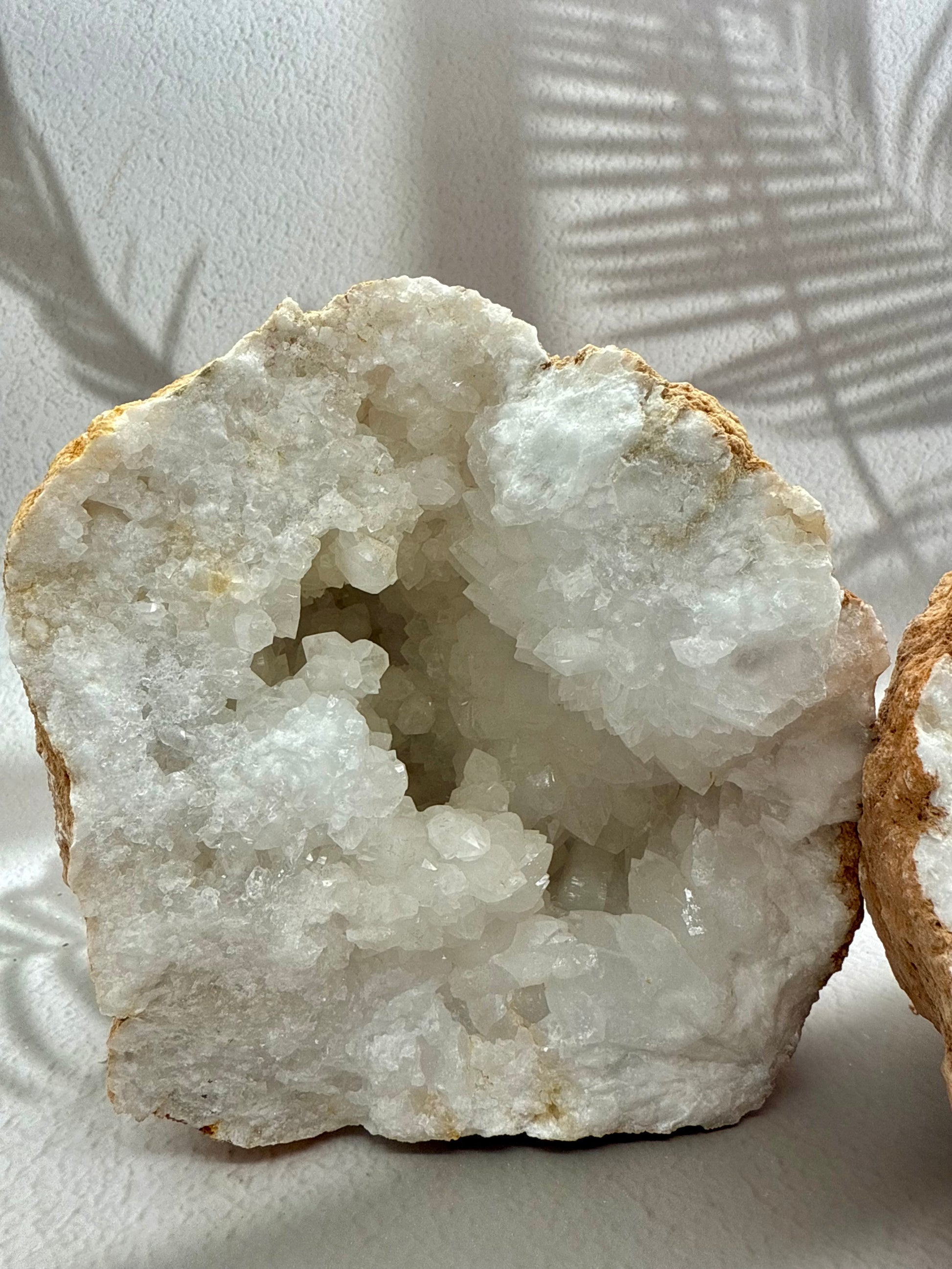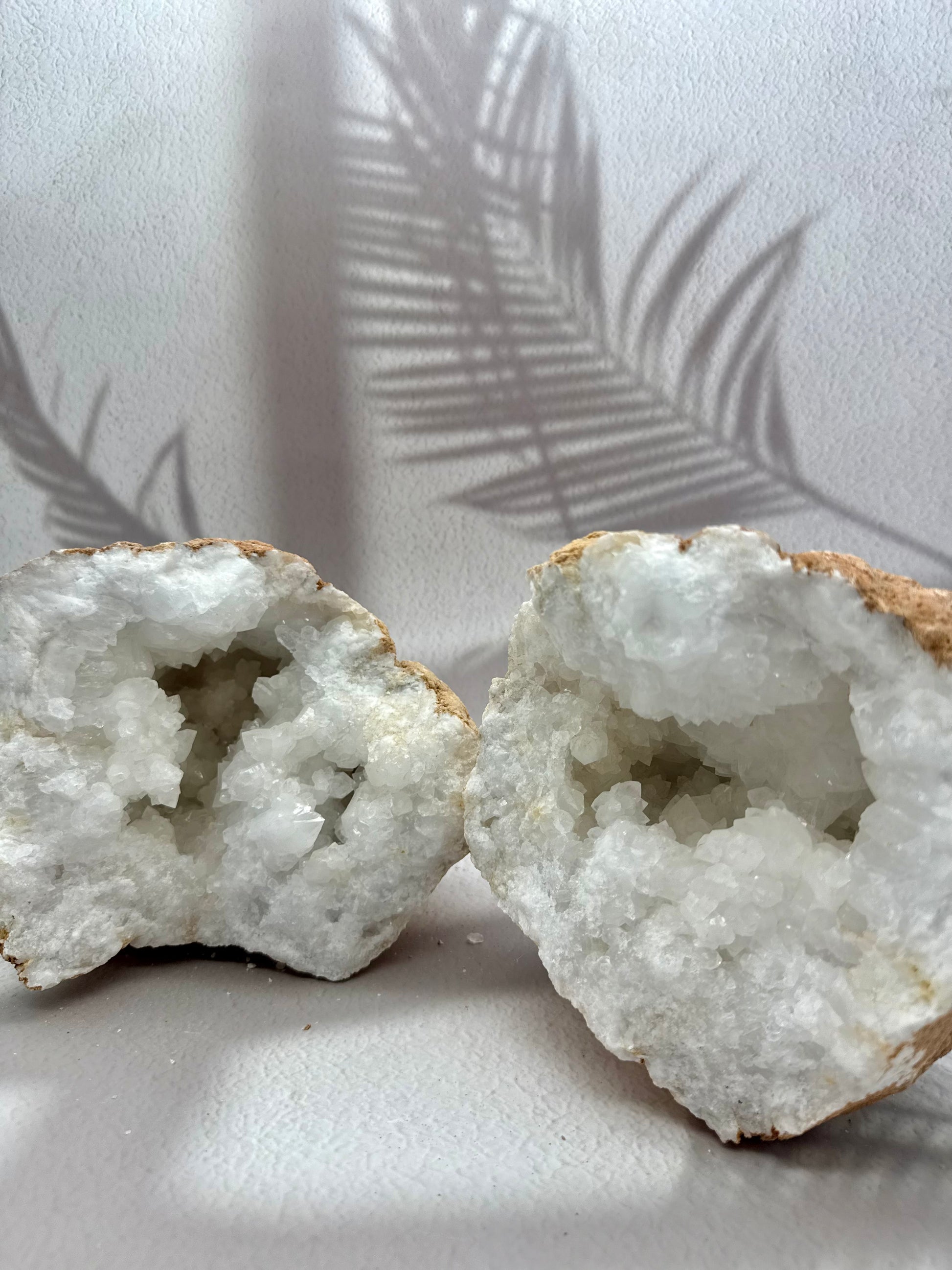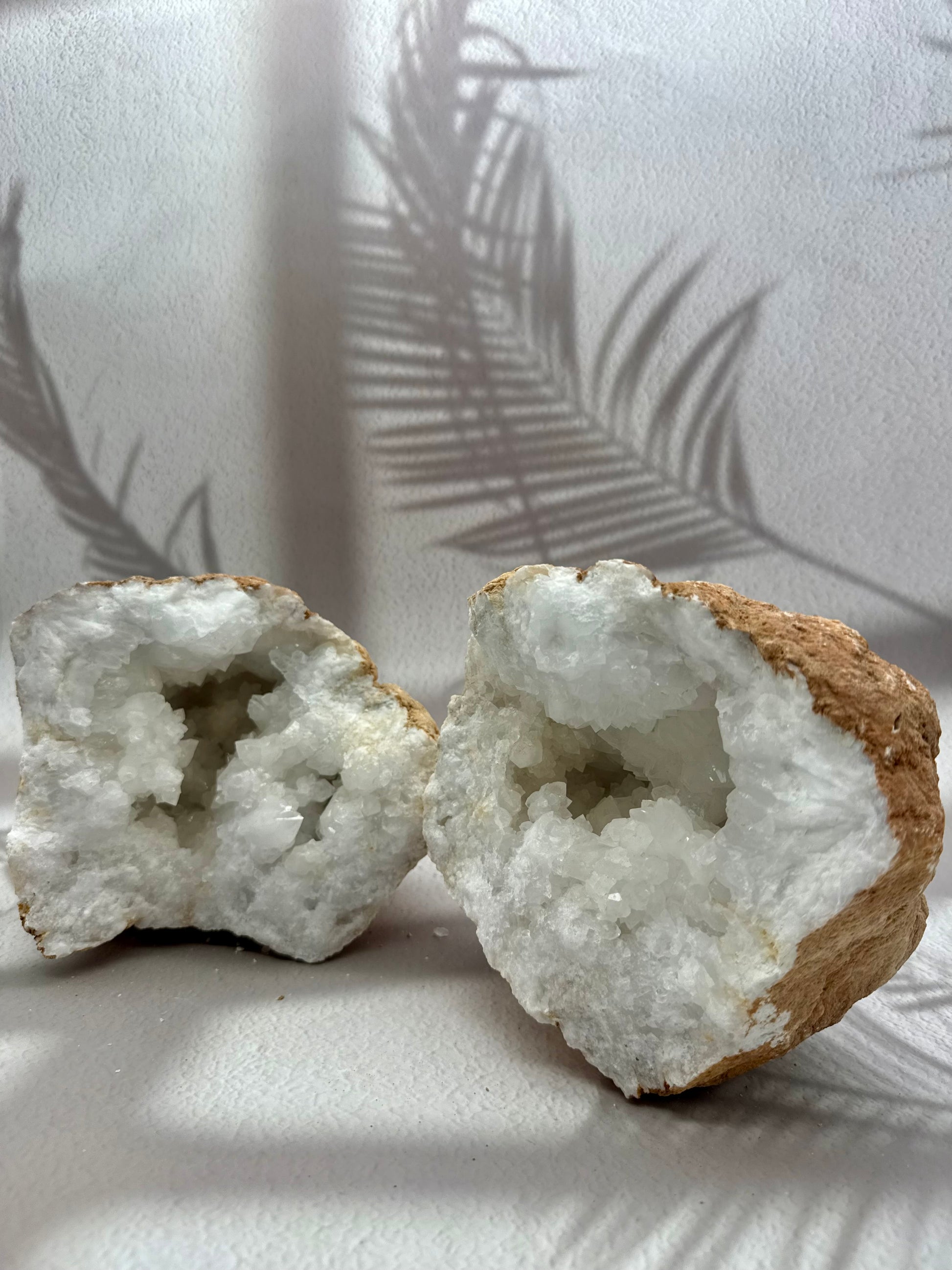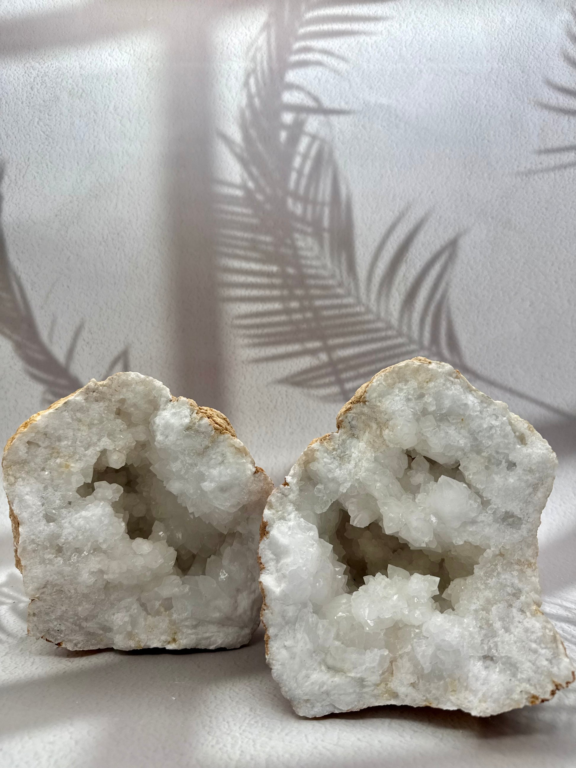 Quarz gilt als Stein der Klarheit, Energie und Reinigung. In Geodenform bündelt er seine Wirkung im Inneren und entfaltet beim Öffnen eine besonders strahlende Kraft. Als Paar stehen die Geoden für Harmonie, Ausgleich und Verbindung – ideal für Wohnräume, spirituelle Orte oder als Geschenk mit besonderer Symbolik.