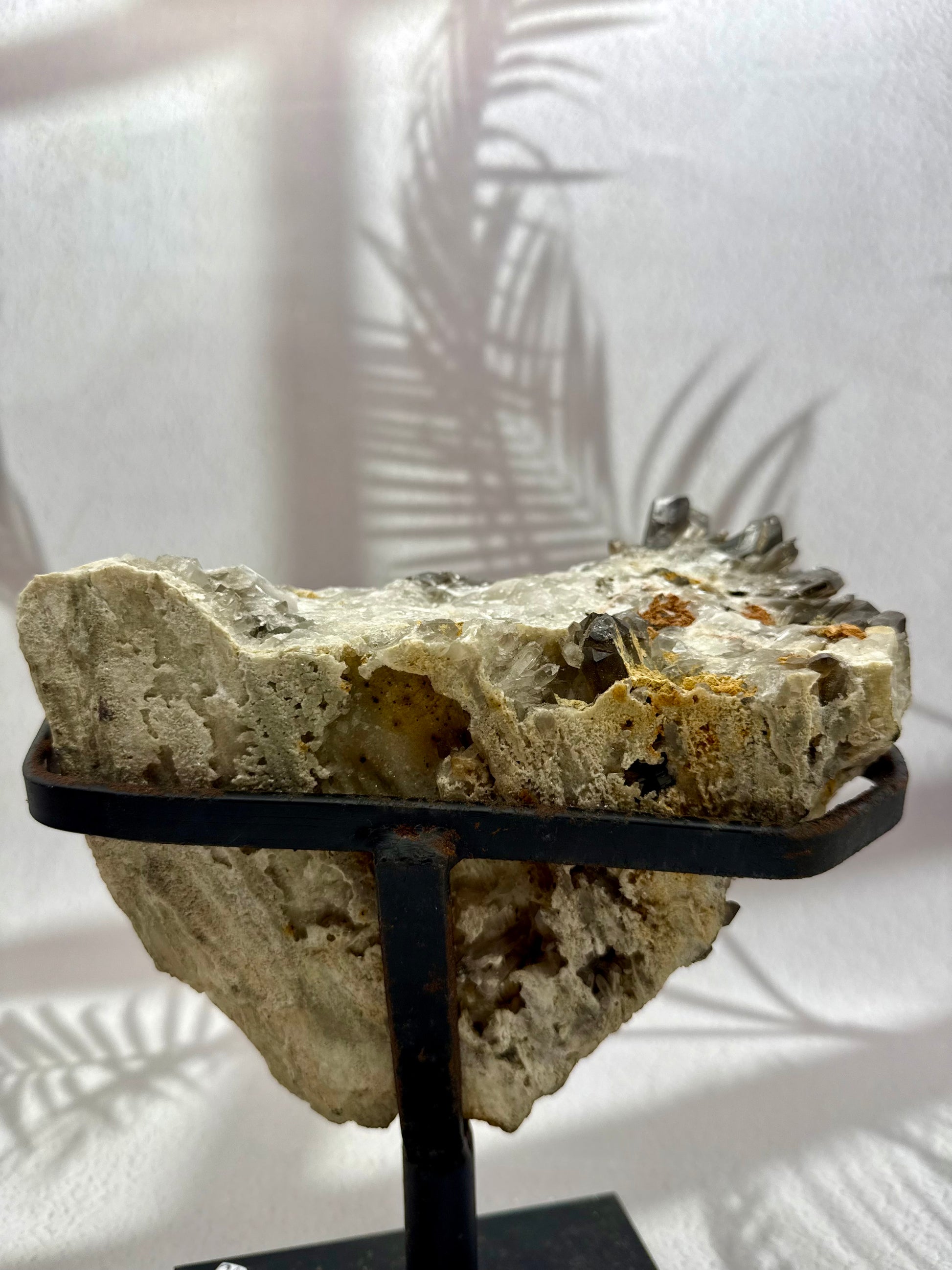 Diese Rauchquarzdruse beeindruckt durch ihre tiefdunklen, funkelnden Kristallspitzen, die in unterschiedlichen Größen angeordnet sind und dem Stück eine lebendige, natürliche Struktur verleihen. Auf einem stabilen Metallständer präsentiert, wird die Druse zu einem eleganten Blickfang, der jeden Raum auf subtile Weise bereichert.