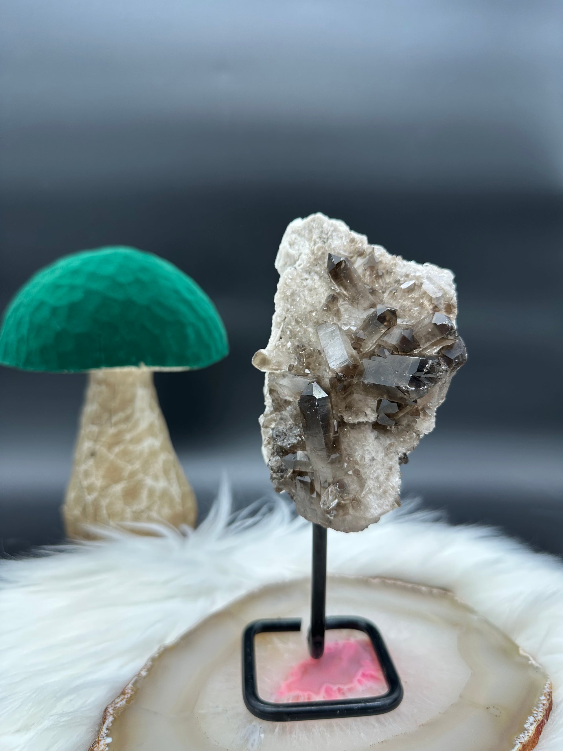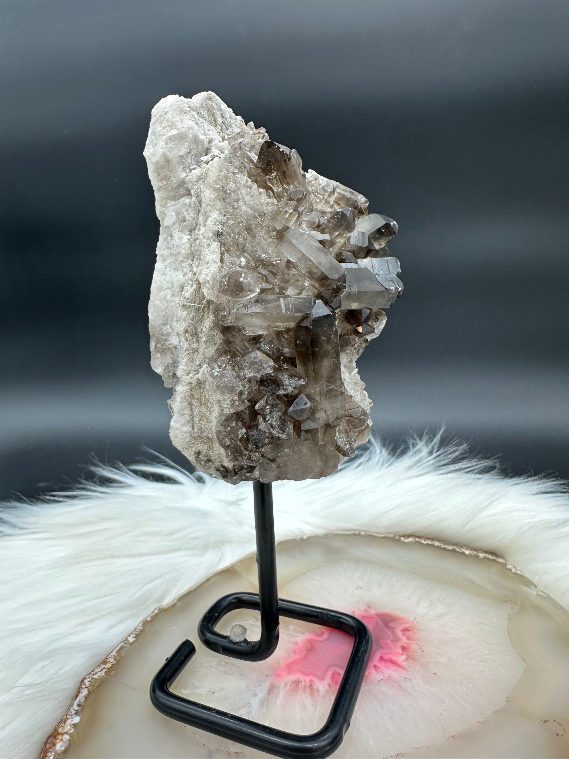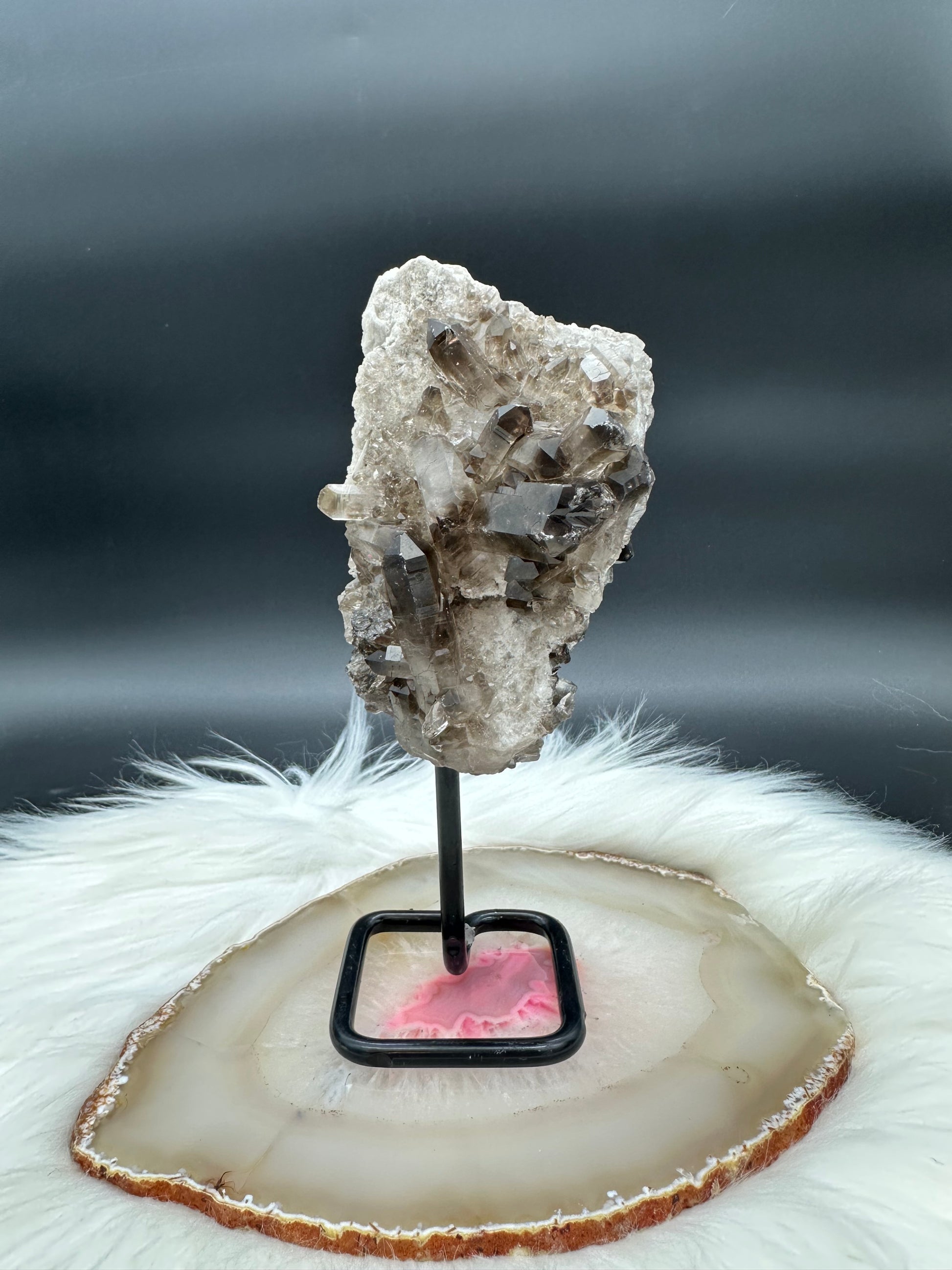 - Naturbelassener Rauchquarz auf schwarzem Metallständer