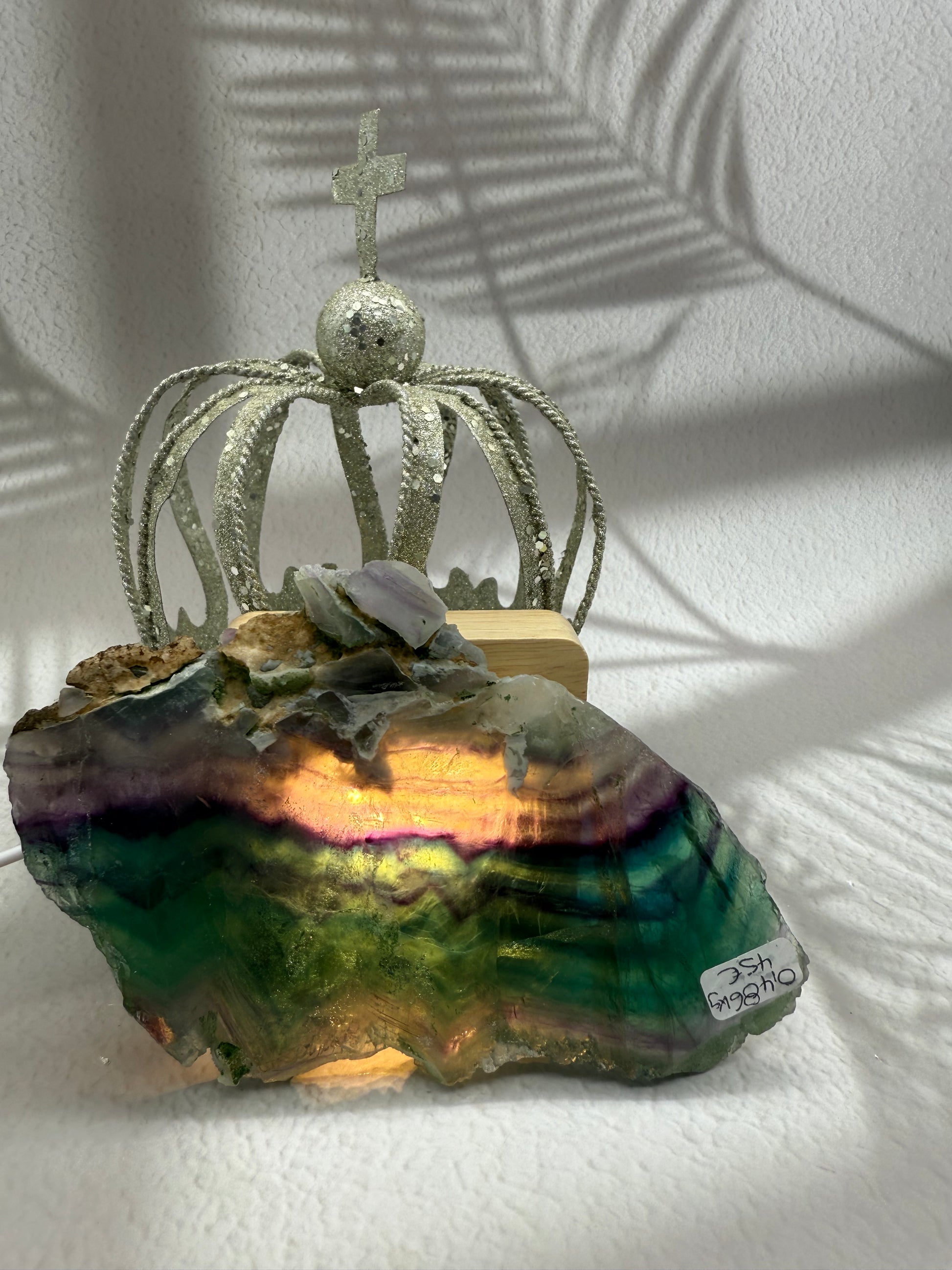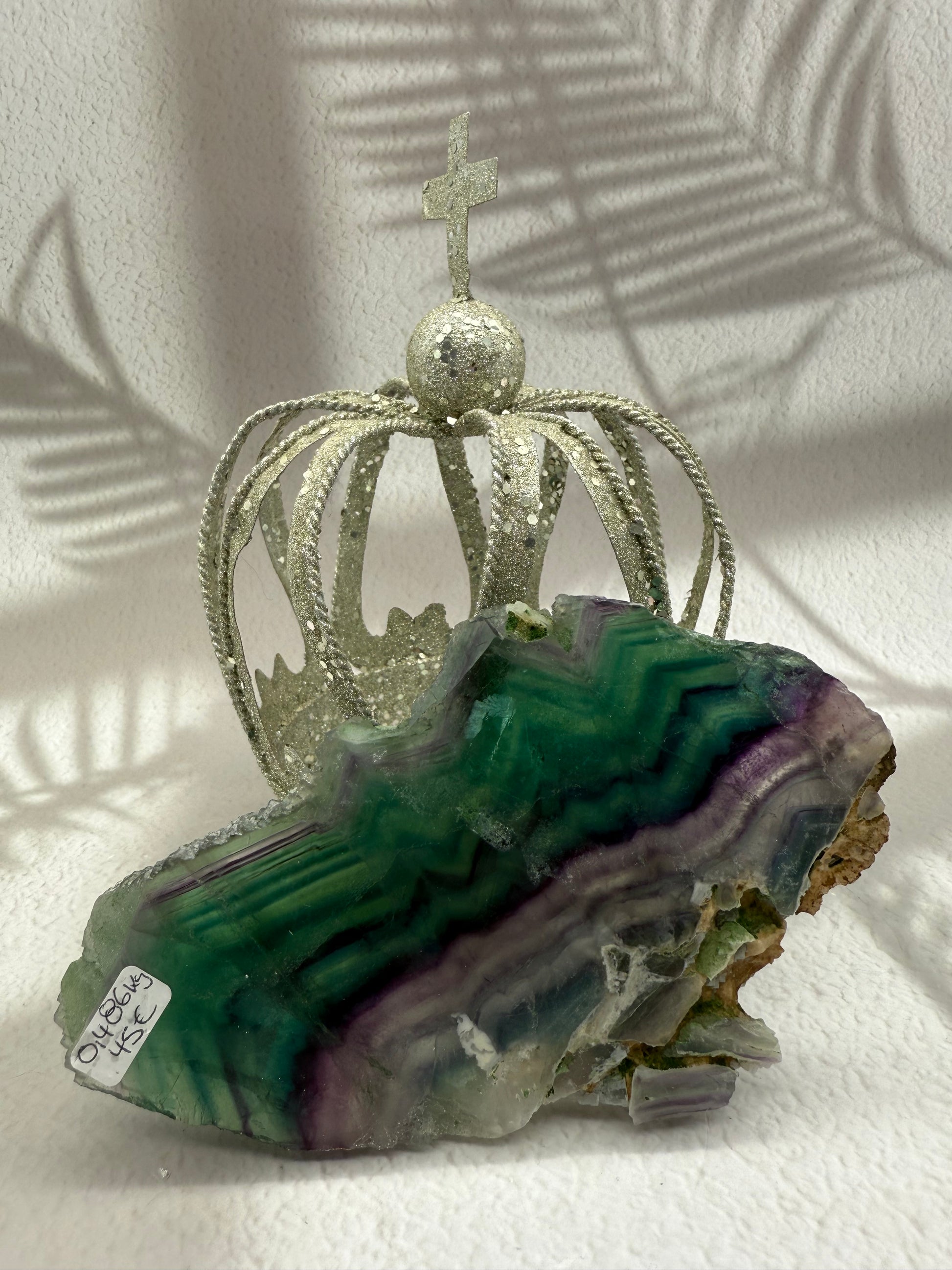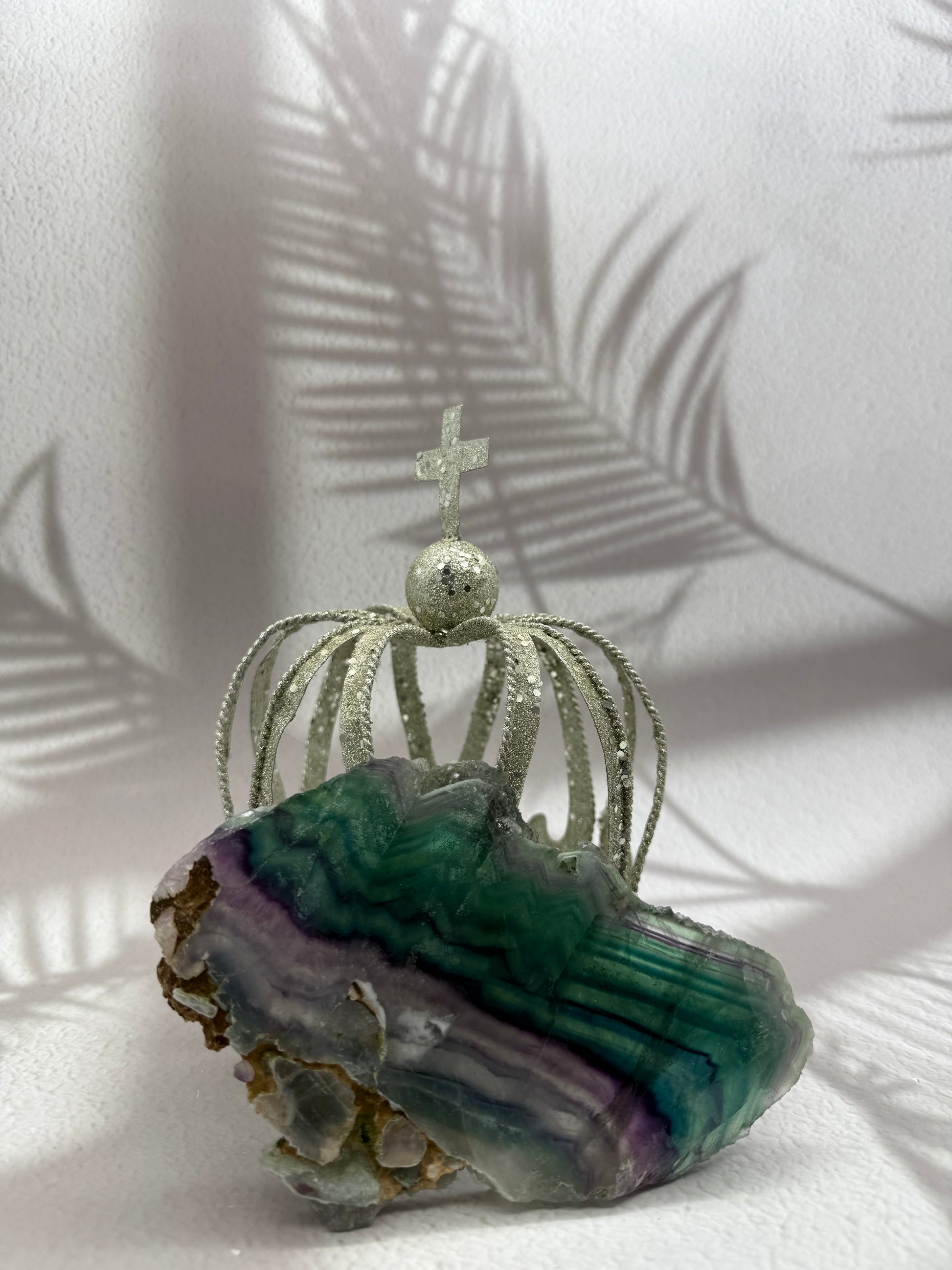 Diese wunderschöne Regenbogen-Fluorit-Scheibe begeistert mit ihren intensiven Schichtungen in Grün-, Violett- und Blautönen. Die polierte Oberfläche bringt die Farben besonders klar zur Geltung und macht die Platte zu einem dekorativen Highlight voller Eleganz und Energie. Ob als Schmuckstück für den Raum, als Unterlage für Kristalle oder als Meditationshilfe – sie verbindet Schönheit mit spiritueller Tiefe.