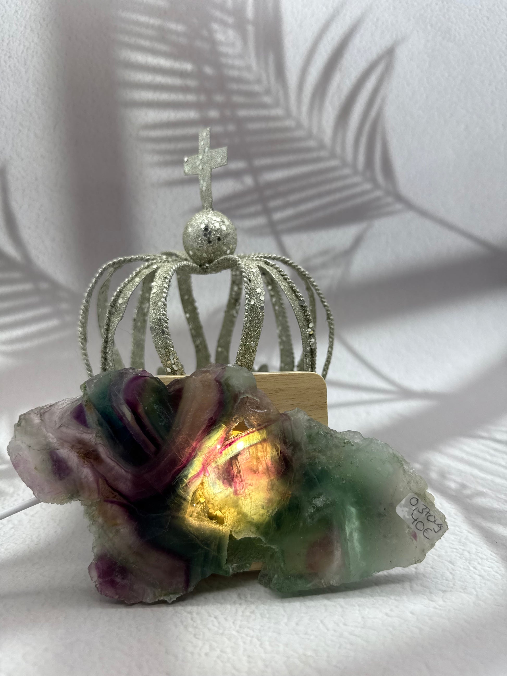 Hinweis: Jede Regenbogen-Fluorit-Scheibe ist ein einzigartiges Naturprodukt – Farben, Schichtungen und Muster variieren und machen jedes Stück zu einem unverwechselbaren Unikat.