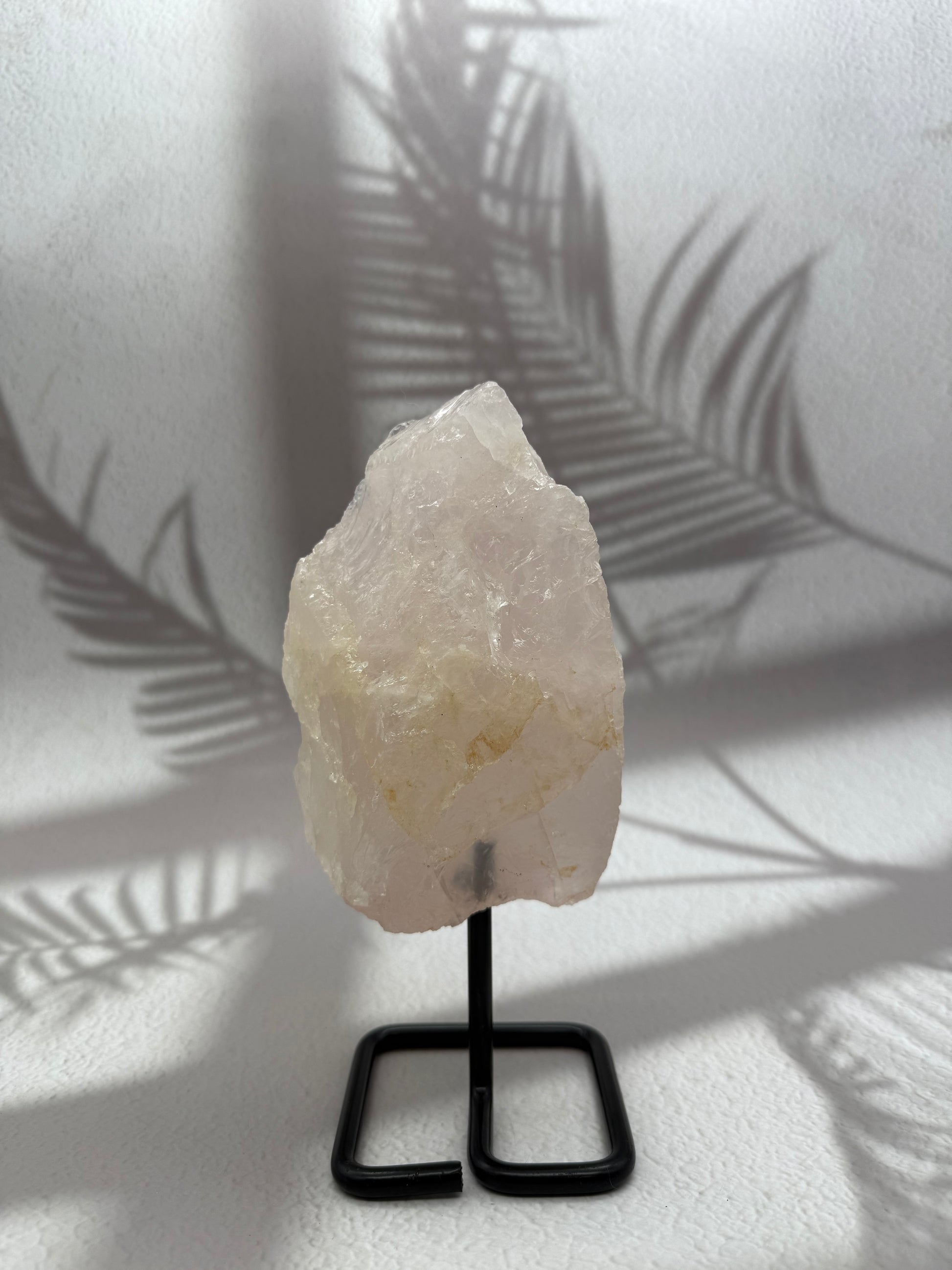 Dieser rohe Rosenquarz auf einem eleganten Metallständer verbindet die zarte, rosafarbene Ausstrahlung des Steins mit einer stilvollen Präsentation. Die naturbelassenen Bruchkanten verleihen ihm einen ursprünglichen Charakter, während die sanften Rosétöne Wärme und Geborgenheit ausstrahlen. Auf dem Ständer kommt die Schönheit des Rosenquarzes besonders gut zur Geltung – ein dekoratives Highlight mit liebevoller Energie.