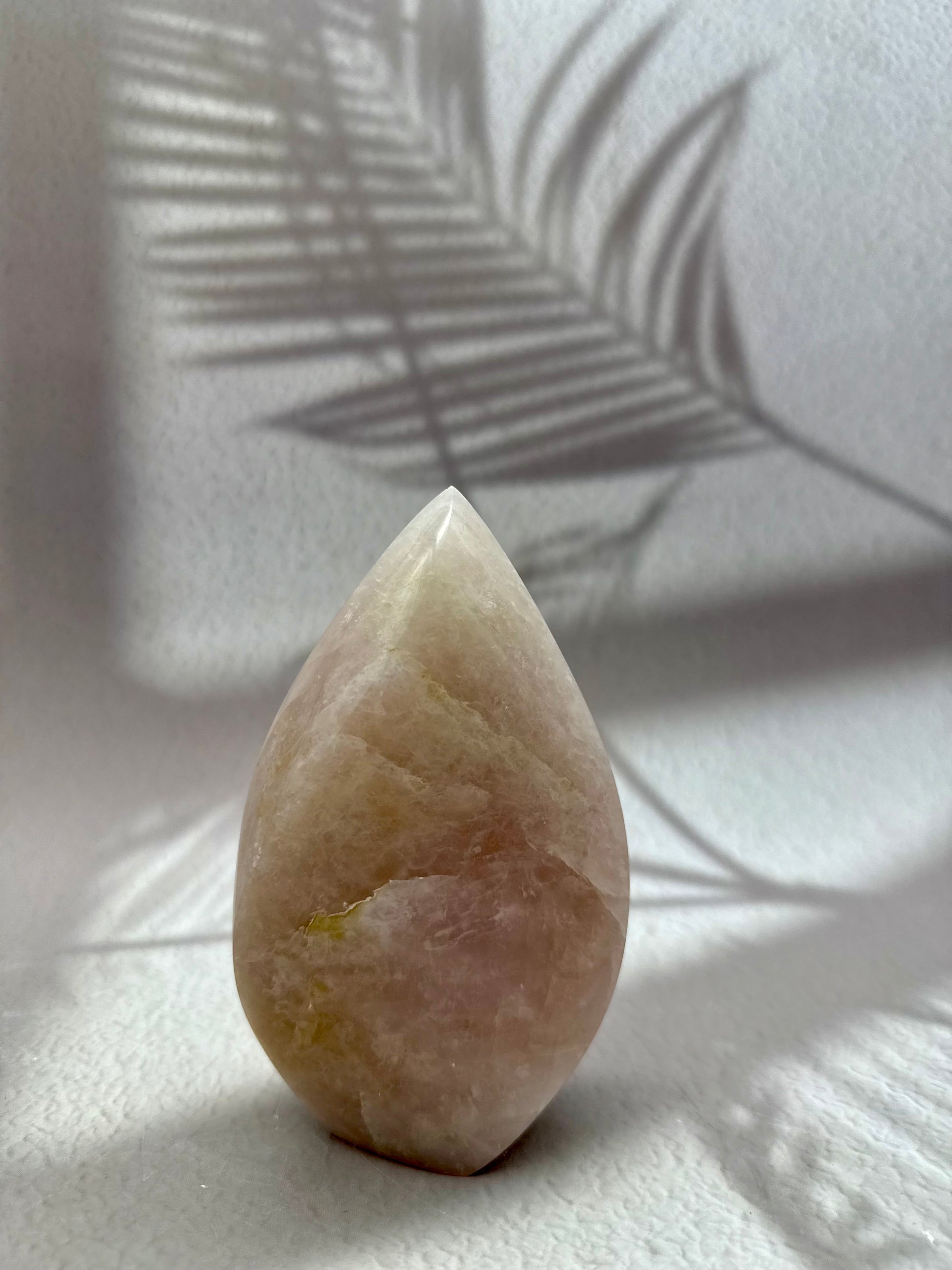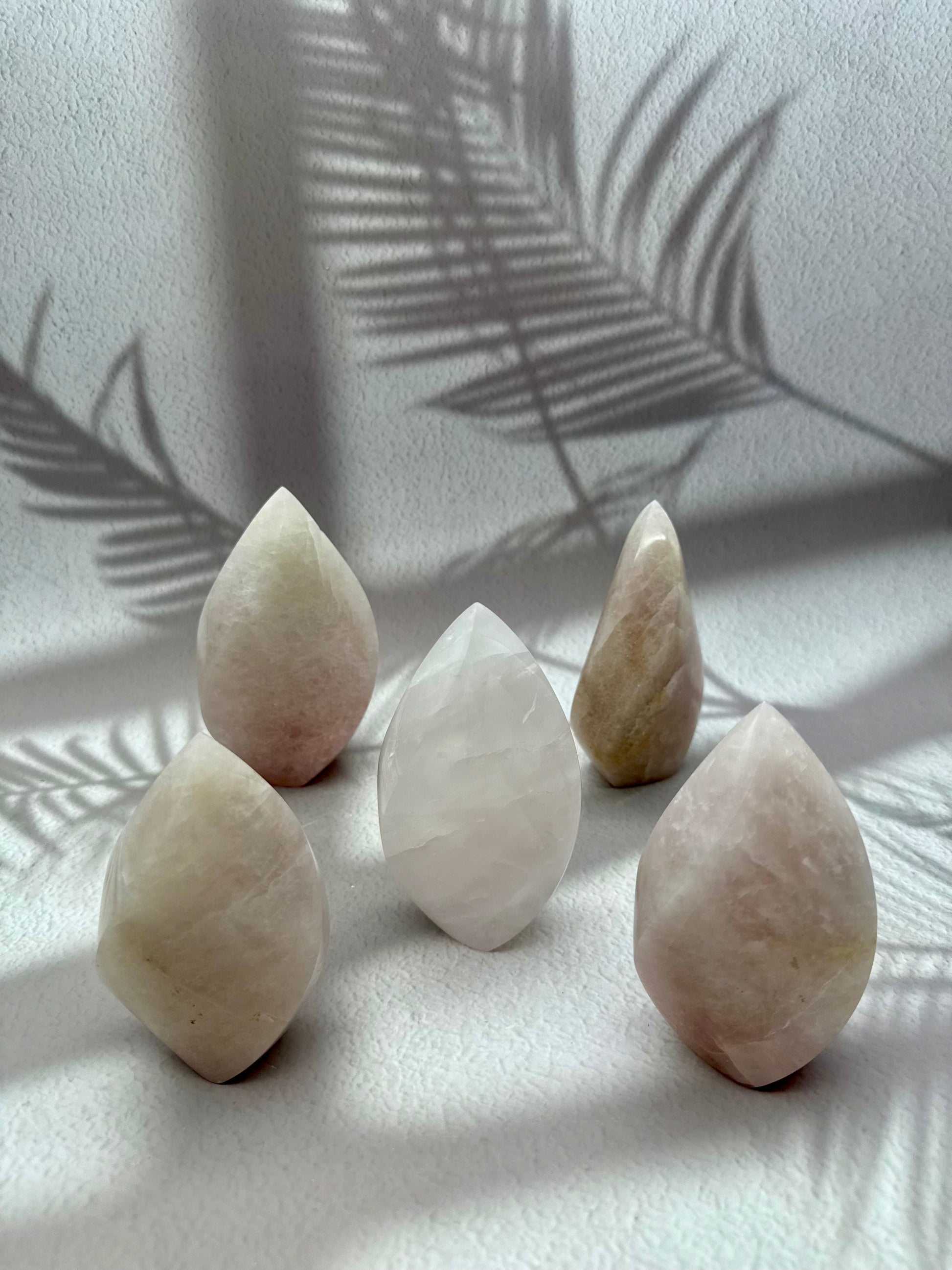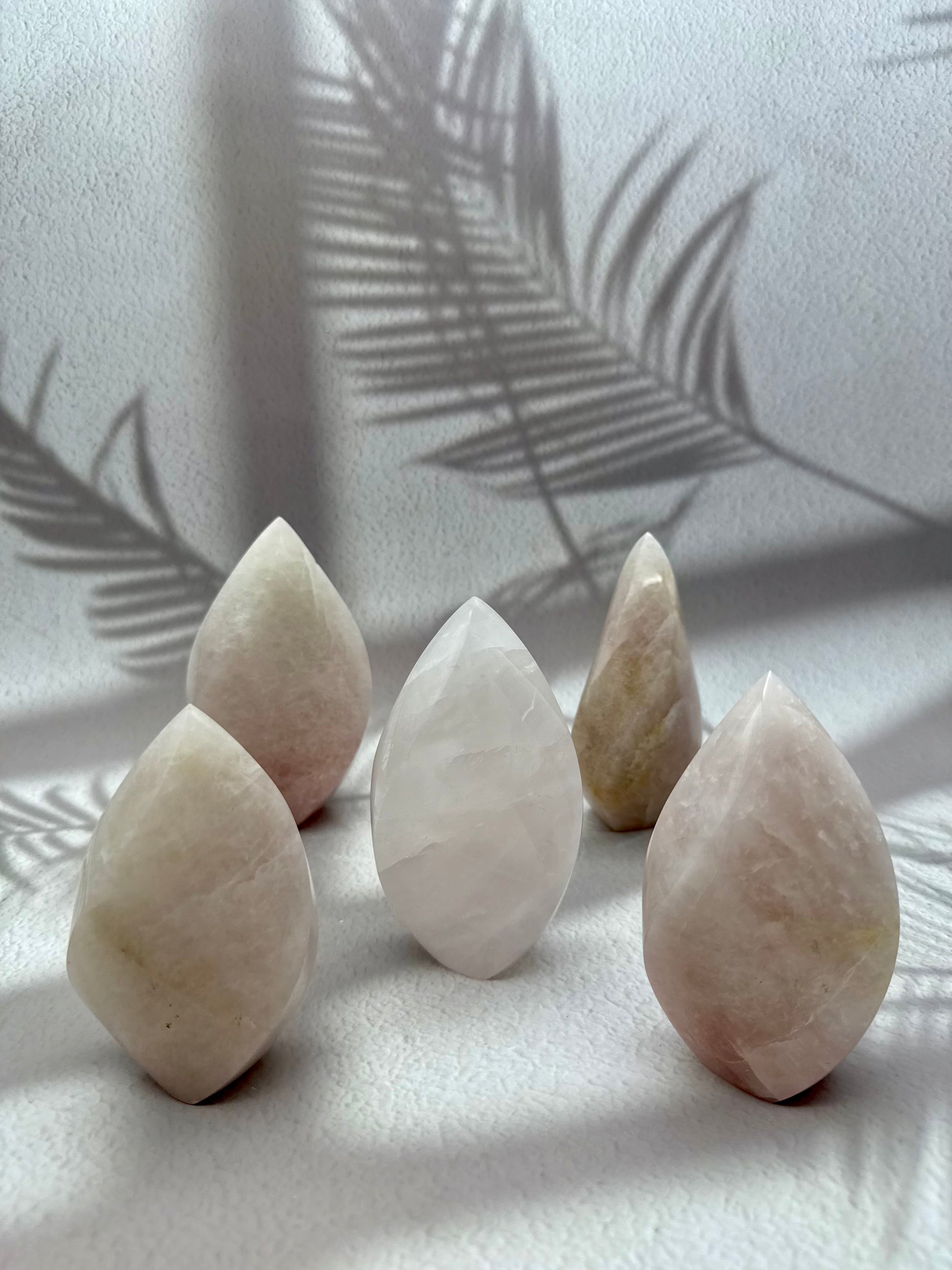Diese handgefertigten Rosenquarz-Flammen verzaubern mit ihrem zarten Rosaton, der glatten Oberfläche und der elegant geschwungenen Flammenform. Jede Flamme zeigt eine natürliche, weiche Struktur, die Wärme und Harmonie ausstrahlt – ein echter Blickfang in jedem Raum.