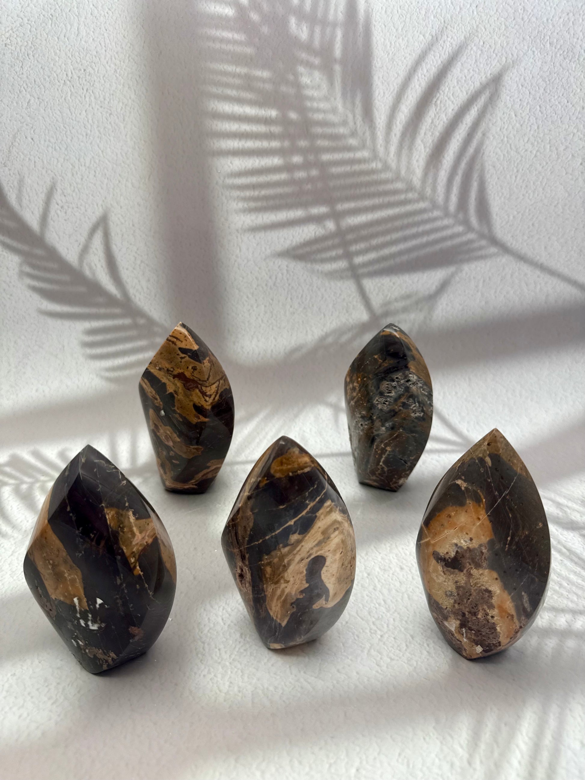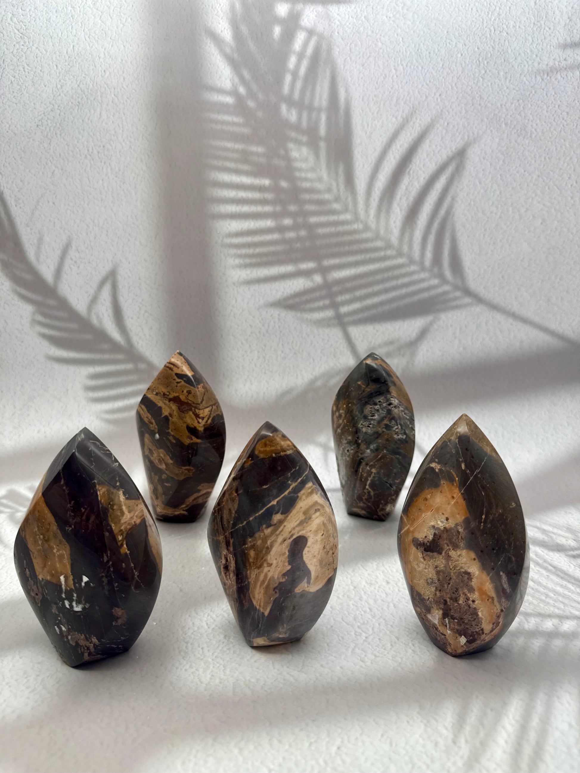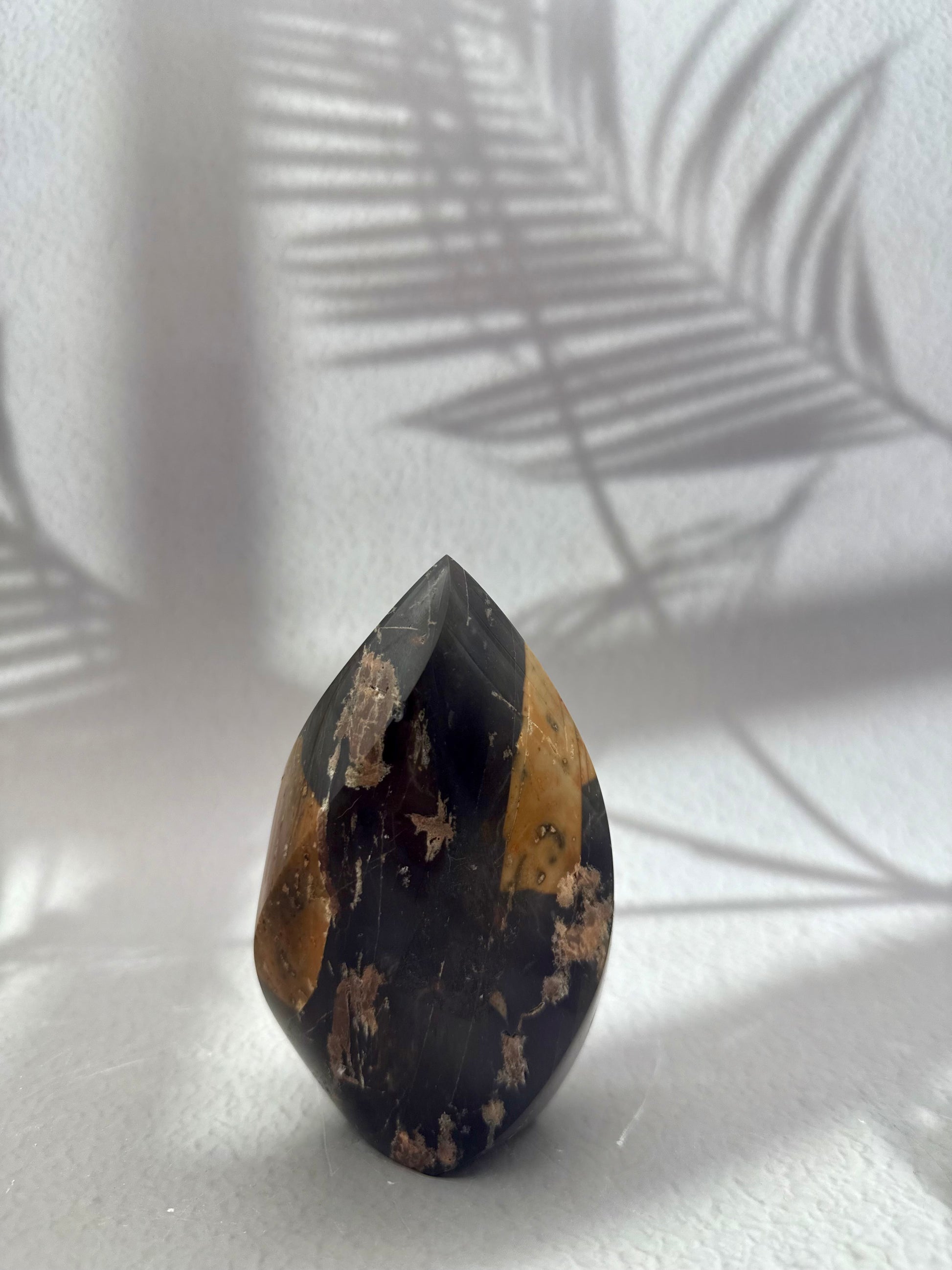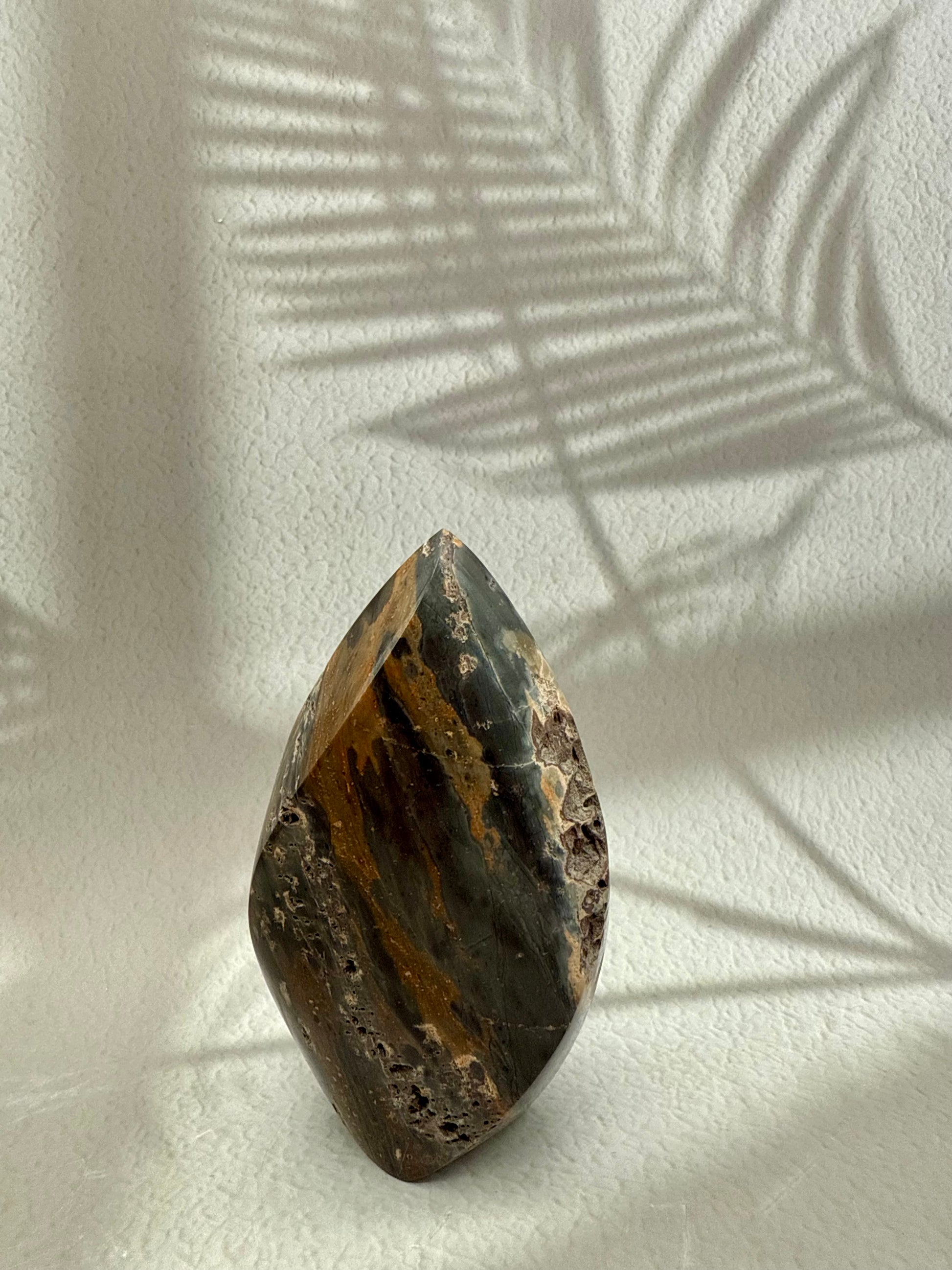 Schokoladen-Jaspis gilt als Stein der Stabilität, Erdung und inneren Ruhe. In Flammenform symbolisiert er Kraft, Zentrierung und einen warmen Energiefluss – ideal für Wohnräume, Arbeitsplätze oder Meditationsbereiche.