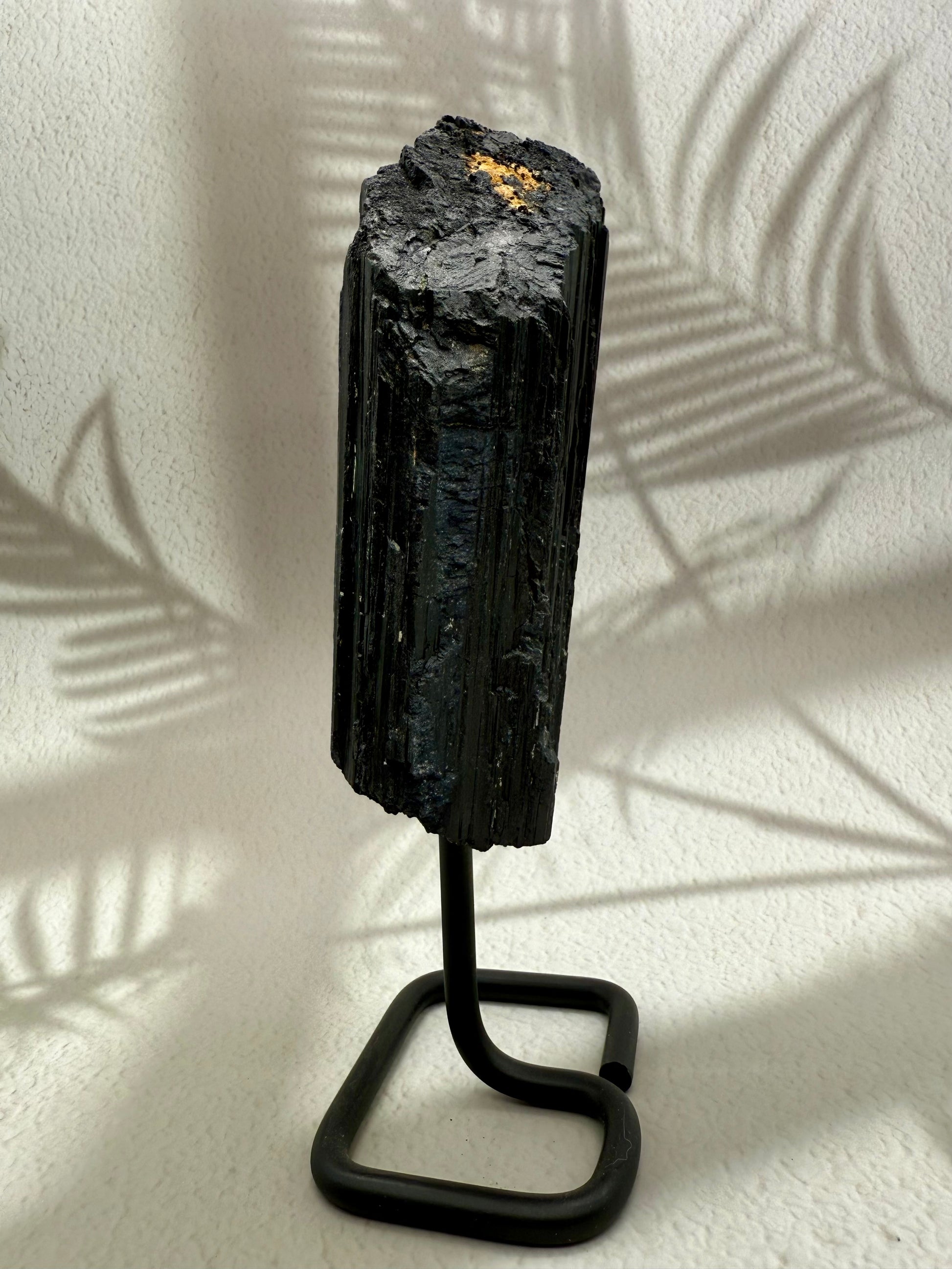 Dieser eindrucksvolle schwarze Turmalin auf einem stabilen Metallständer vereint natürliche Stärke mit eleganter Präsentation. Die tiefschwarze Oberfläche strahlt Ruhe, Stabilität und Kraft aus und macht den Turmalin zu einem besonderen Blickfang in jedem Raum. Auf dem Ständer präsentiert, entfaltet er seine Wirkung noch intensiver und wird zu einem dekorativen Highlight mit tiefer Bedeutung.