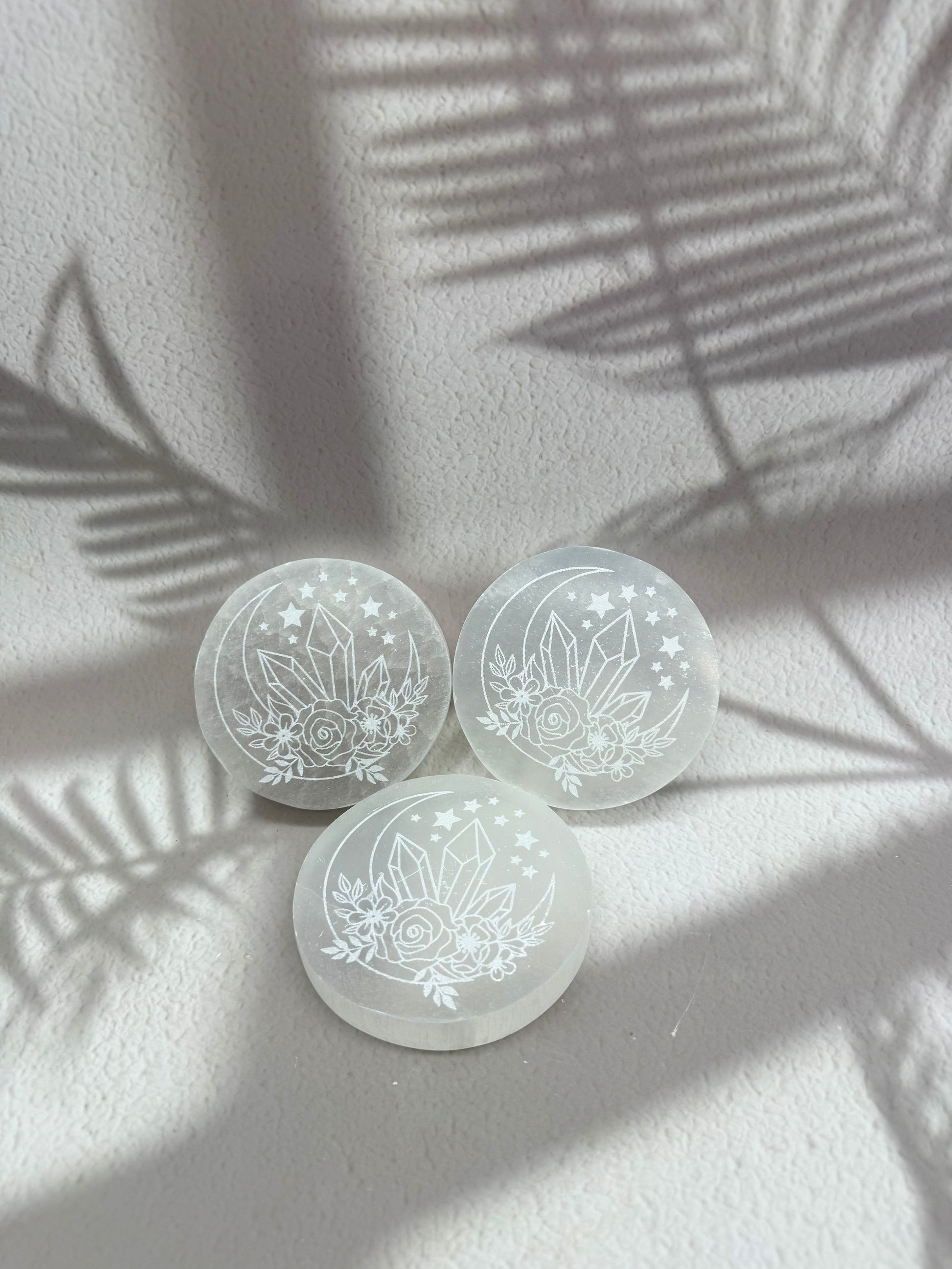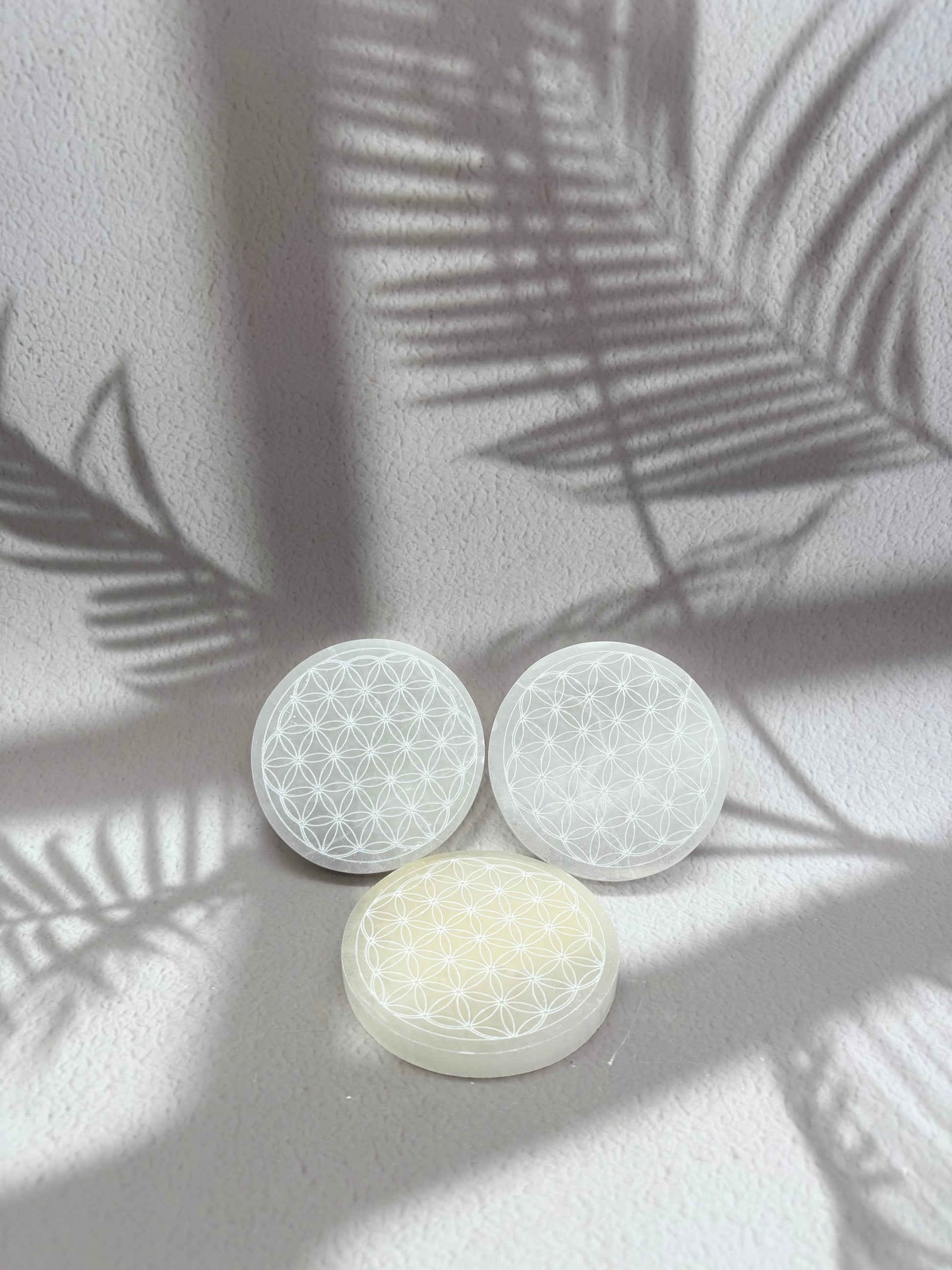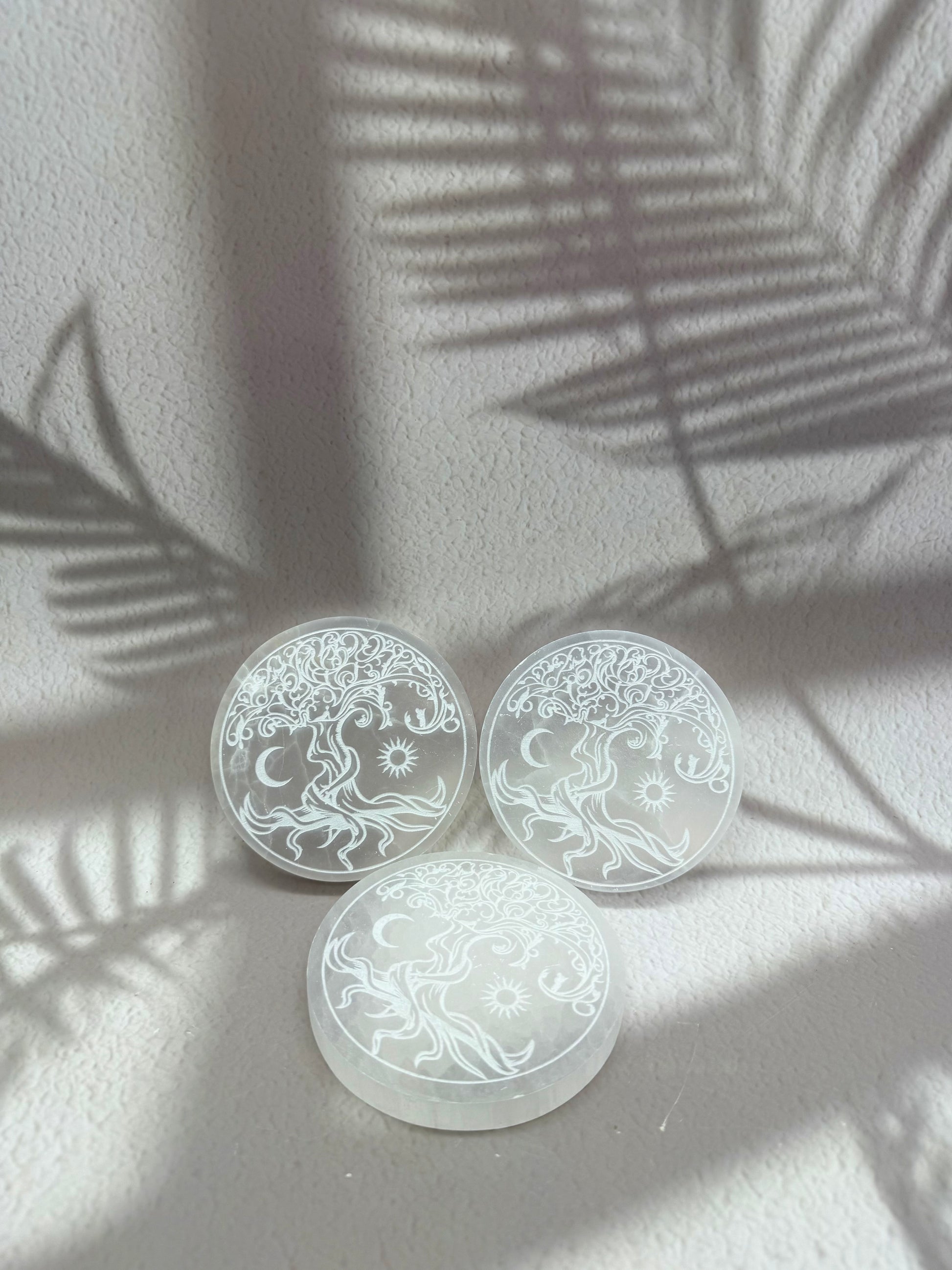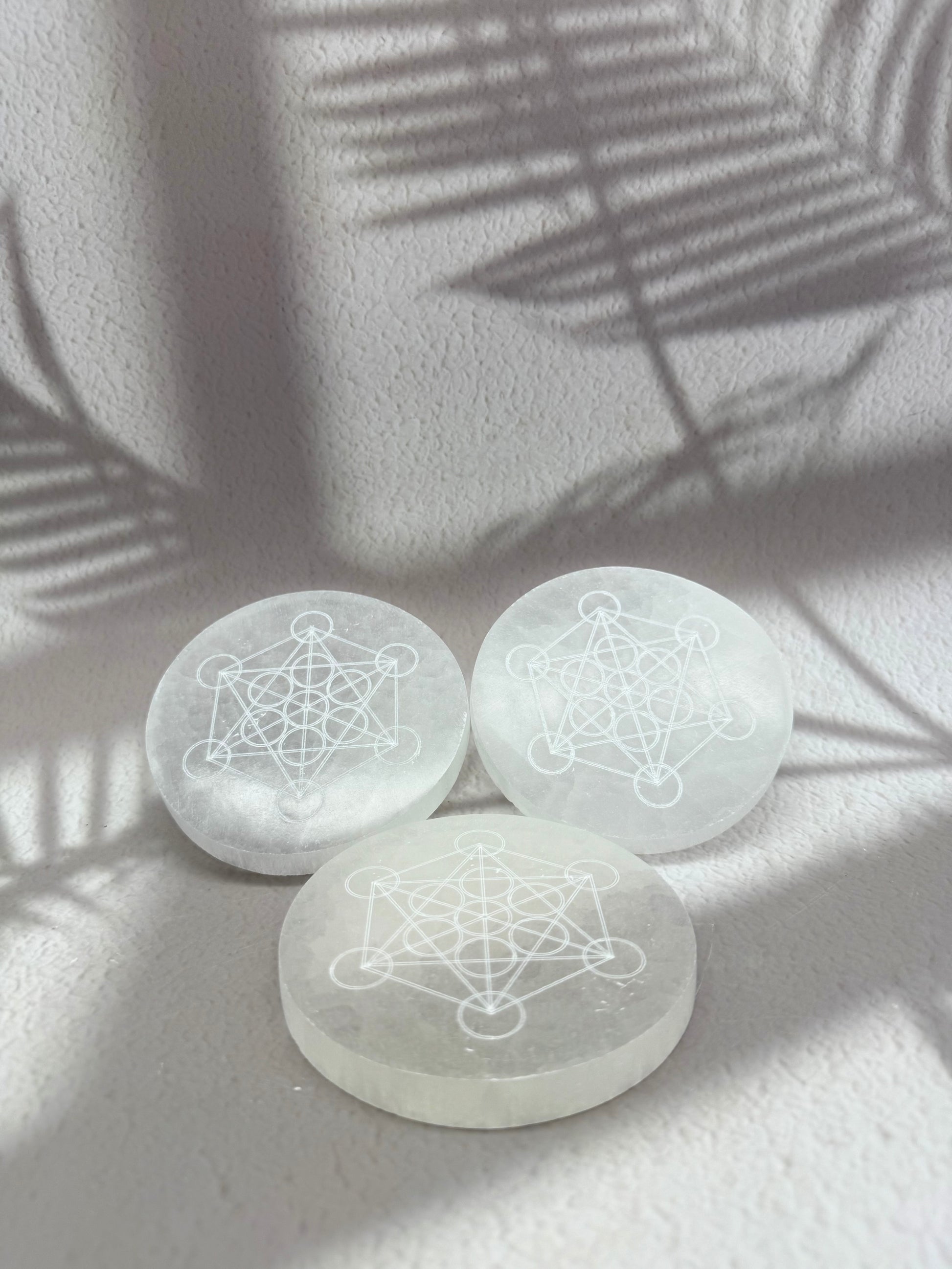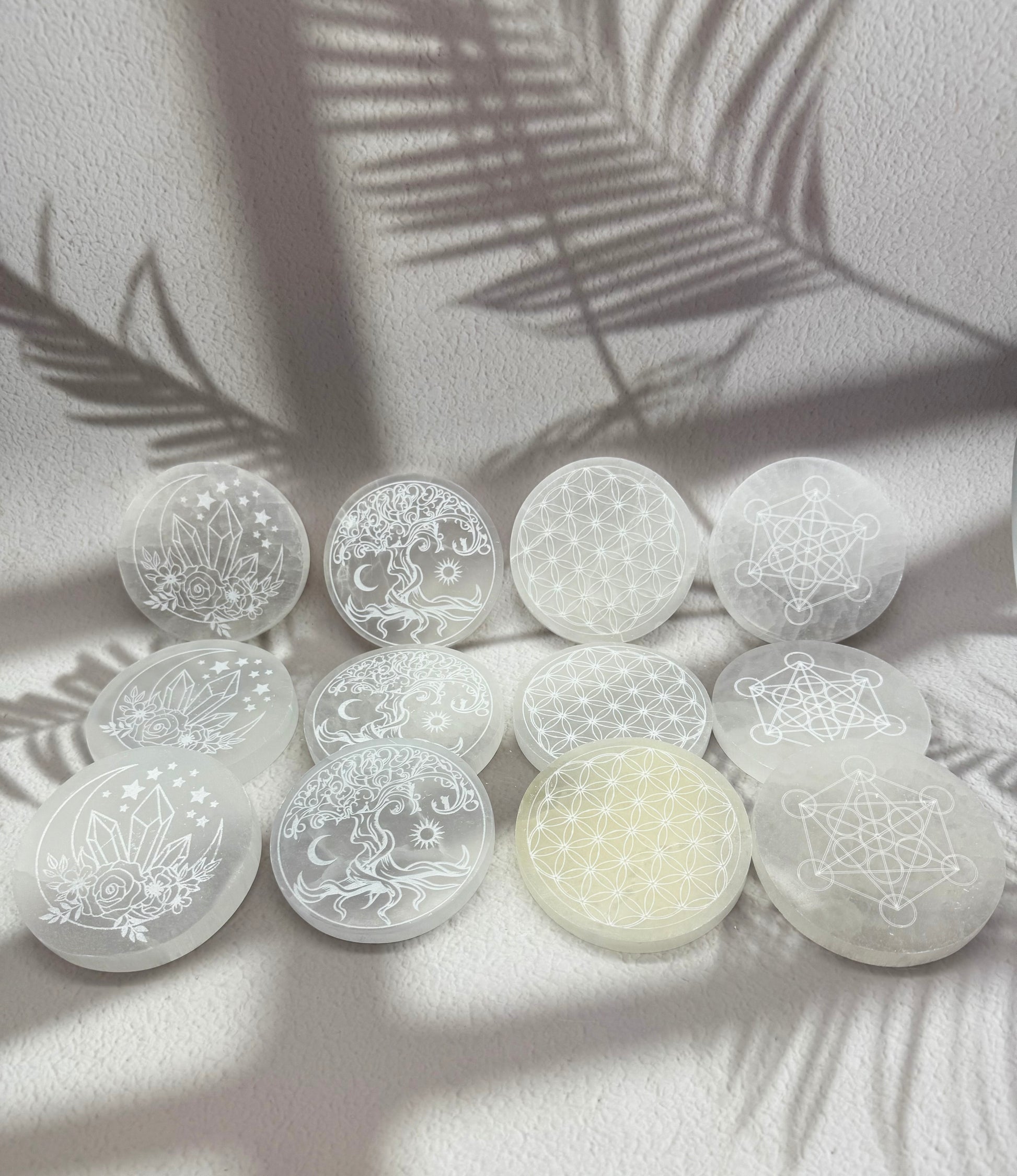 Selenit-Ladeplatte mit verschiedenen Motiven – Reinigung, Aufladung & klare Energie