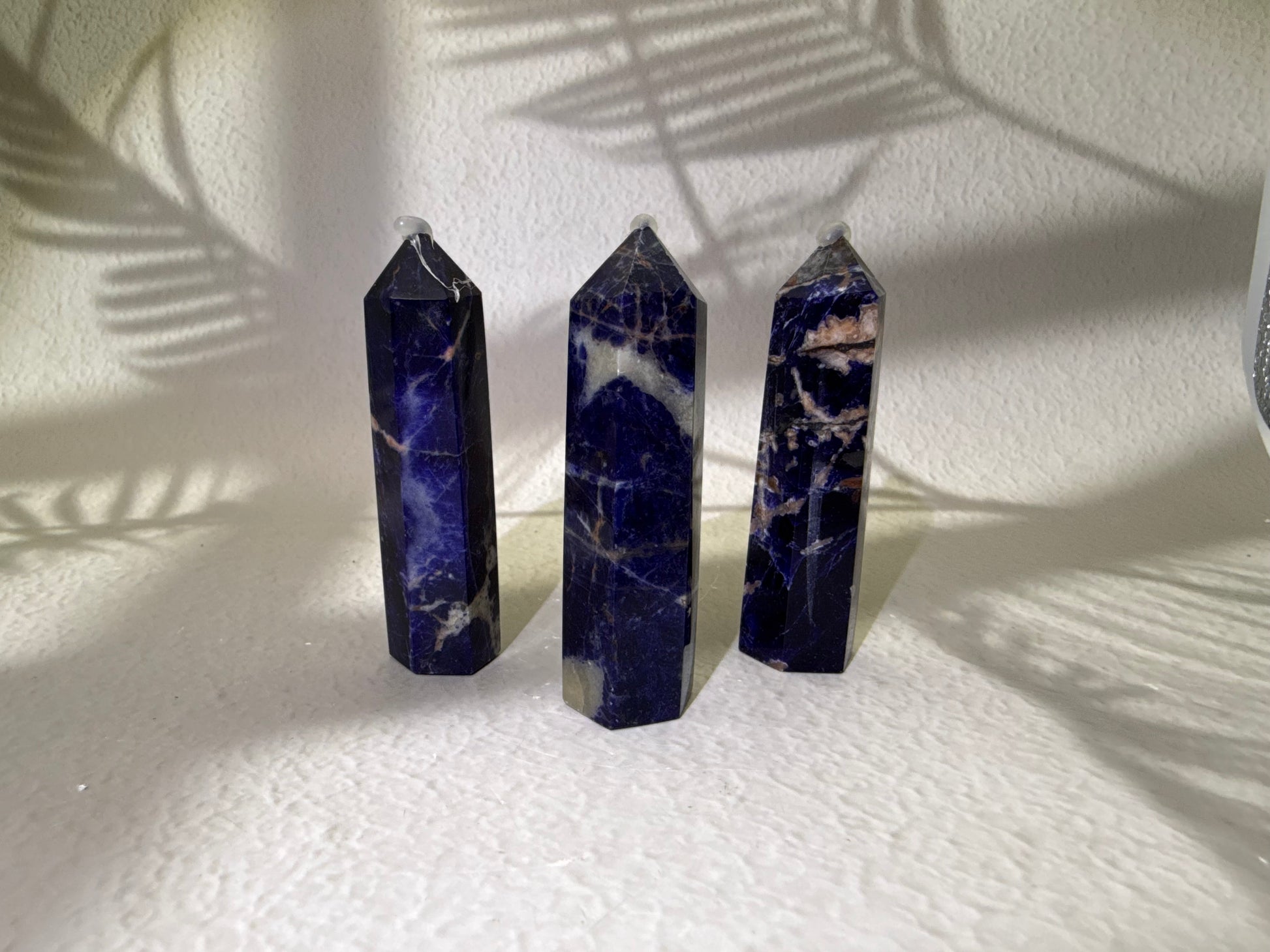 Diese drei Sodalith-Türme bestechen durch ihre tiefblaue Farbgebung, durchzogen von zarten weißen Adern, die jedem Stück seine charakteristische Struktur verleihen. Die Turmform bringt die natürliche Schönheit des Steins besonders schön zur Geltung und macht die Figuren zu eleganten Blickfängen für Wohnraum, Arbeitsplatz oder Meditationsplatz.