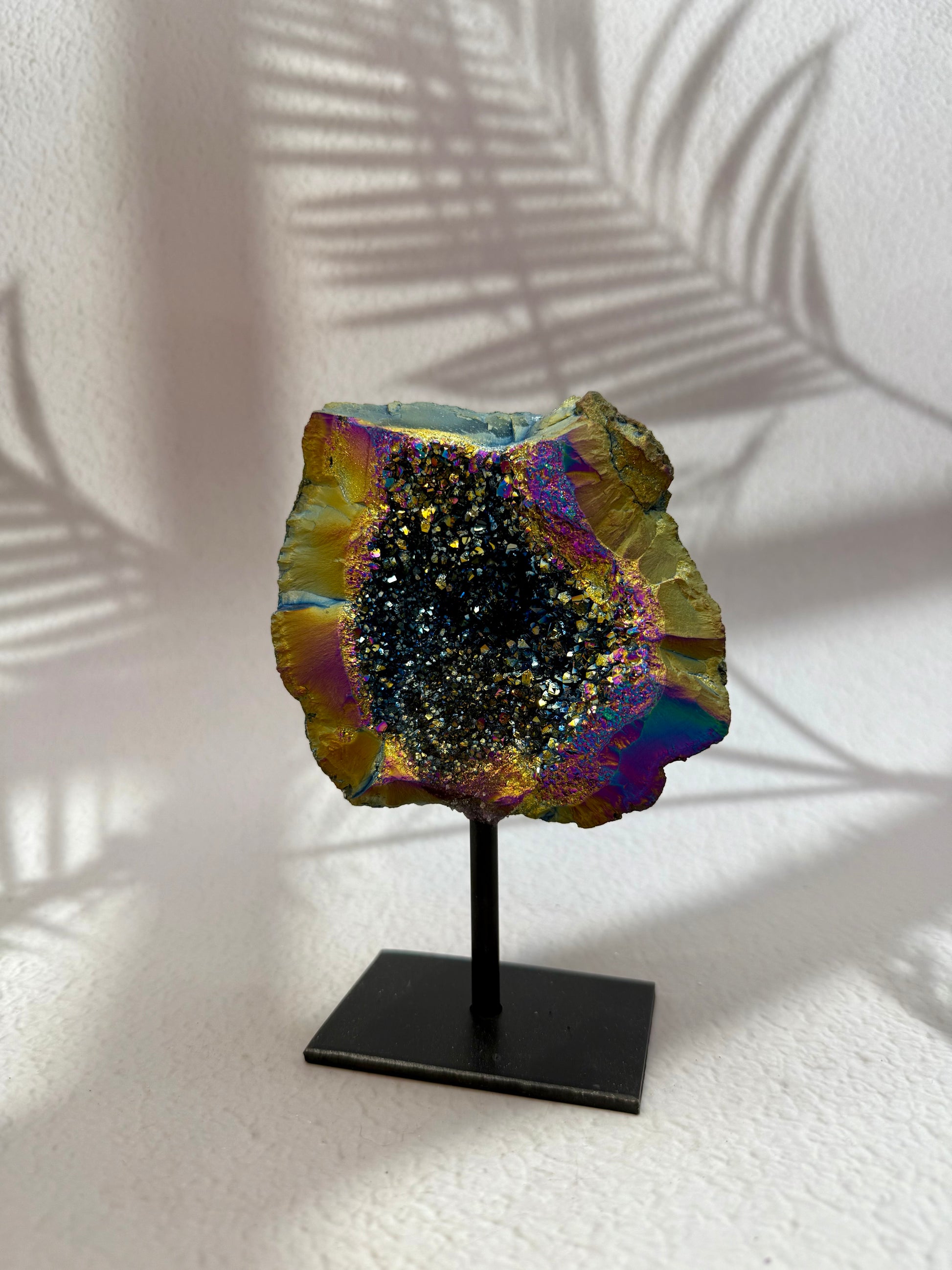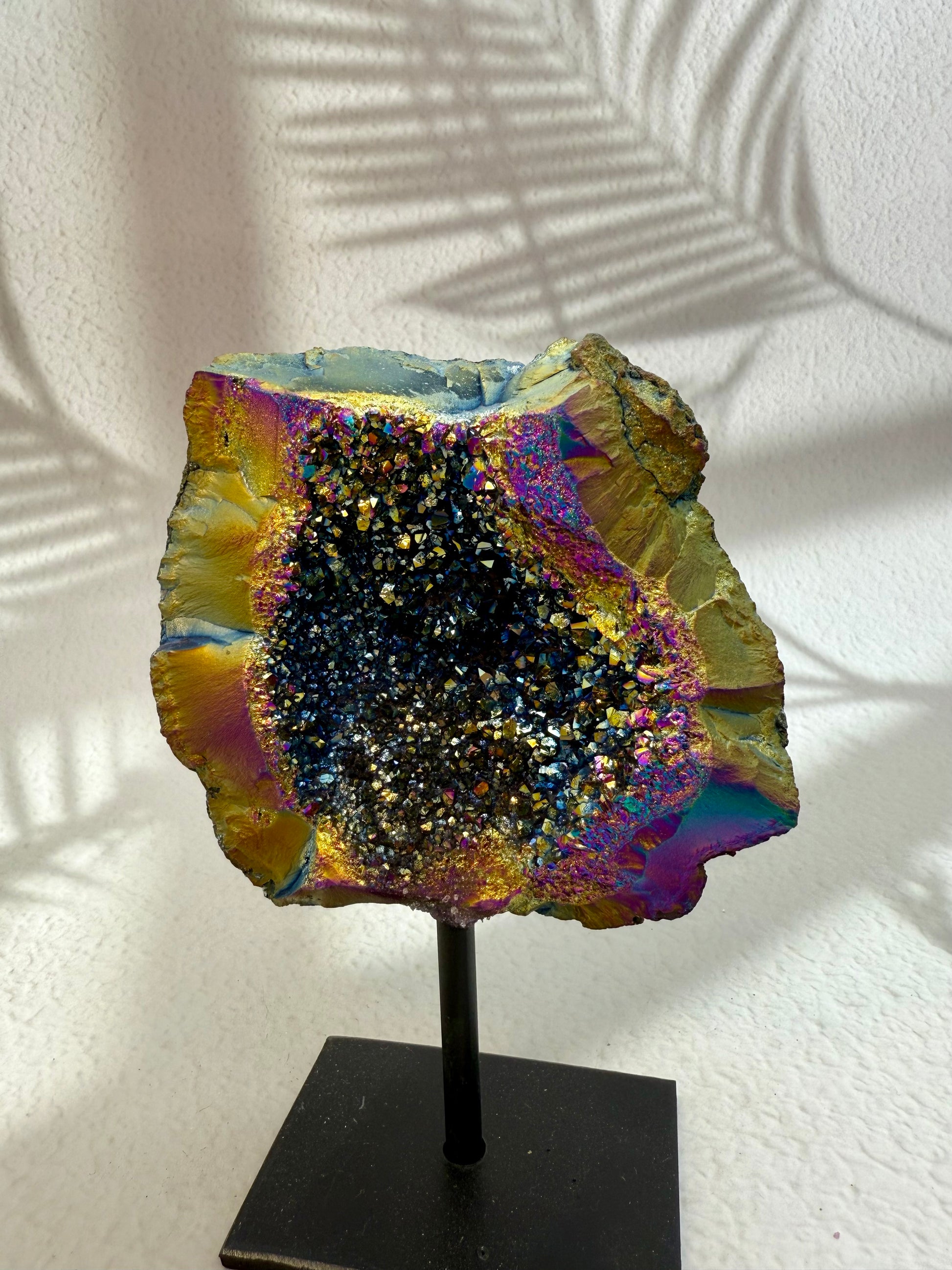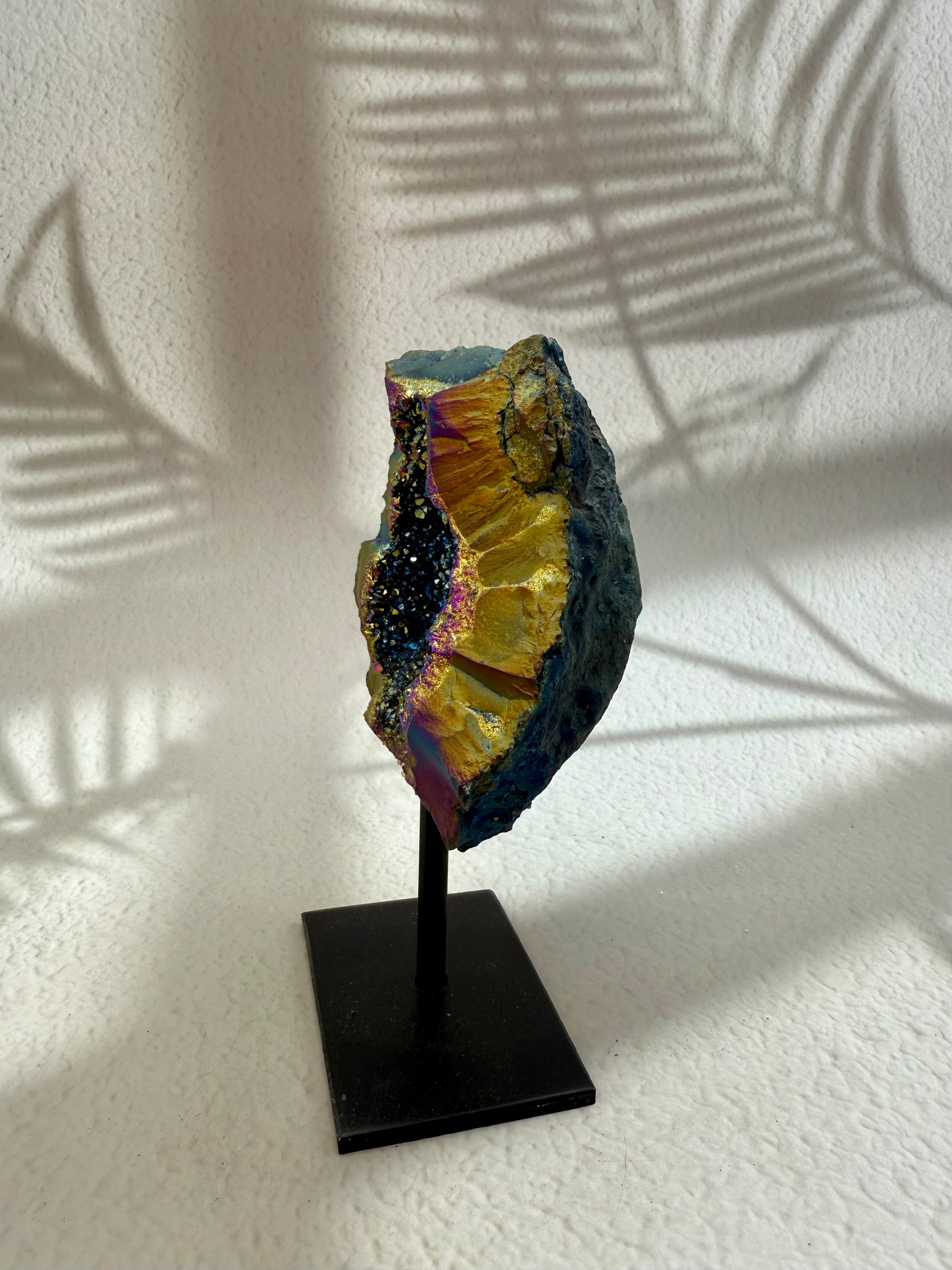 Dieser strahlende Titaniumquarz auf einem eleganten Metallständer vereint natürliche Kristallkraft mit stilvoller Präsentation. Die funkelnden Oberflächen in Blau-, Violett- und Regenbogentönen ziehen alle Blicke auf sich und machen den Quarz zu einem beeindruckenden Blickfang. Auf dem Ständer präsentiert, wird er zu einem dekorativen Highlight und zugleich zu einem kraftvollen Energiespender für dein Zuhause oder deinen Arbeitsplatz.