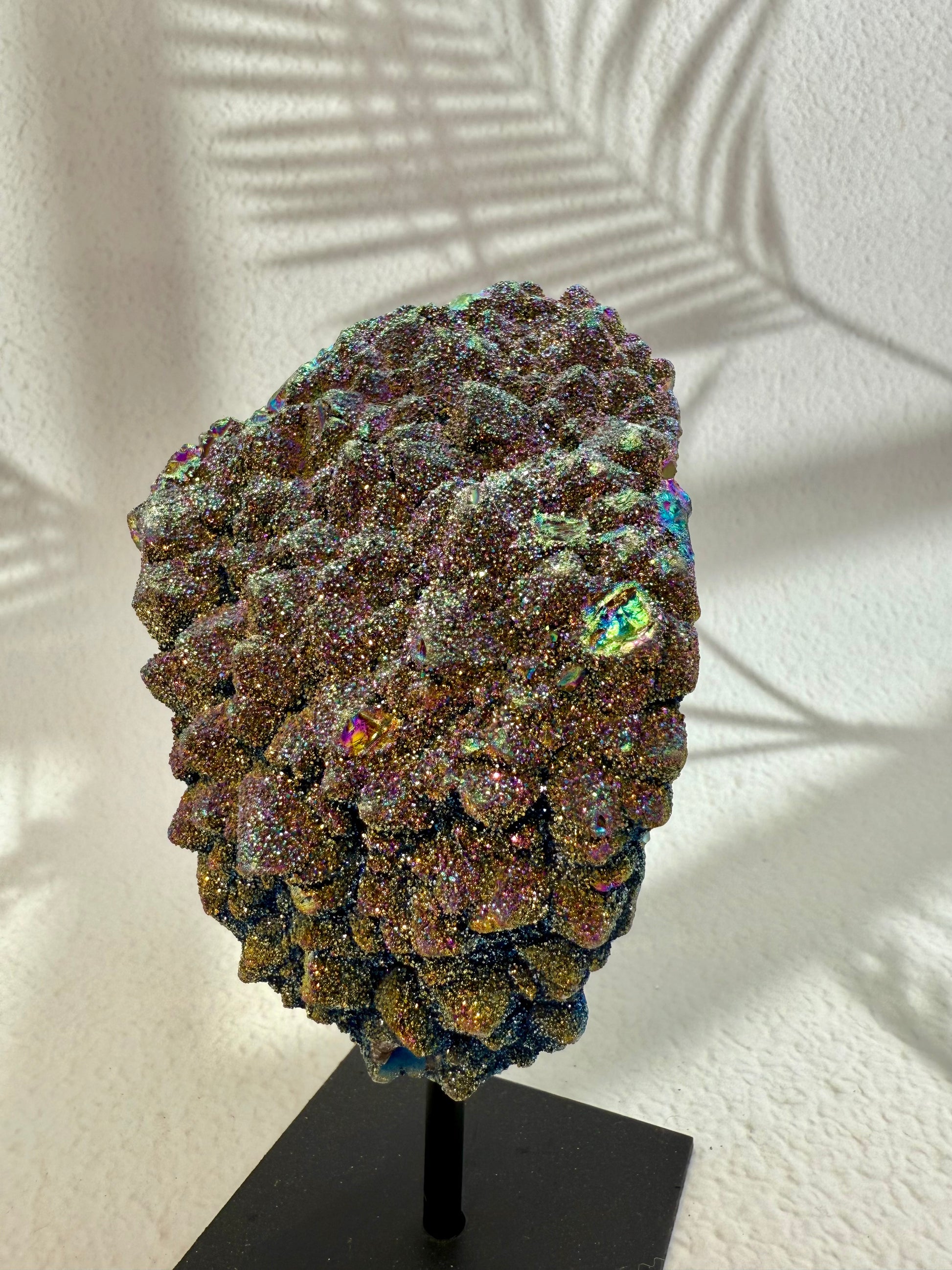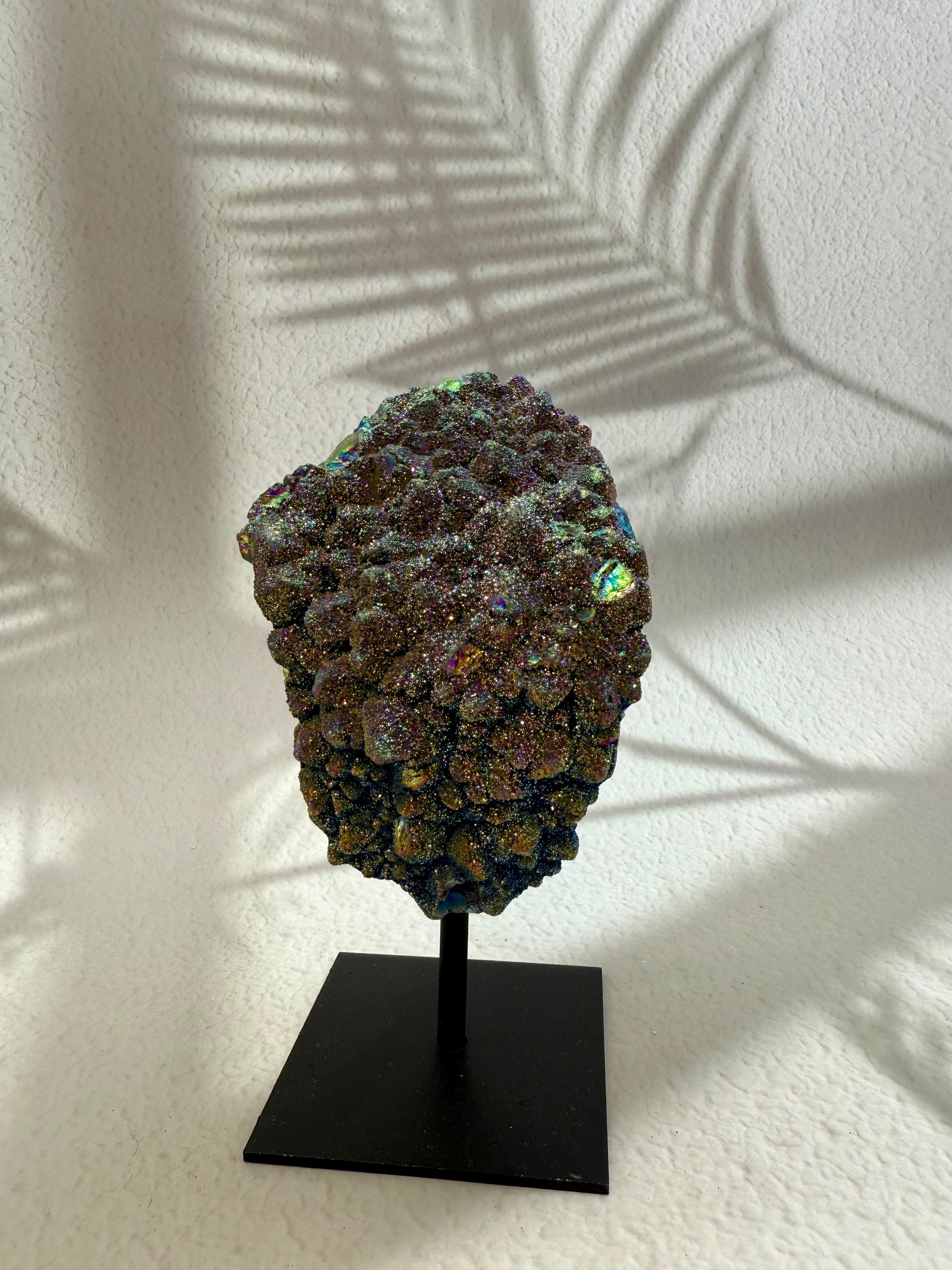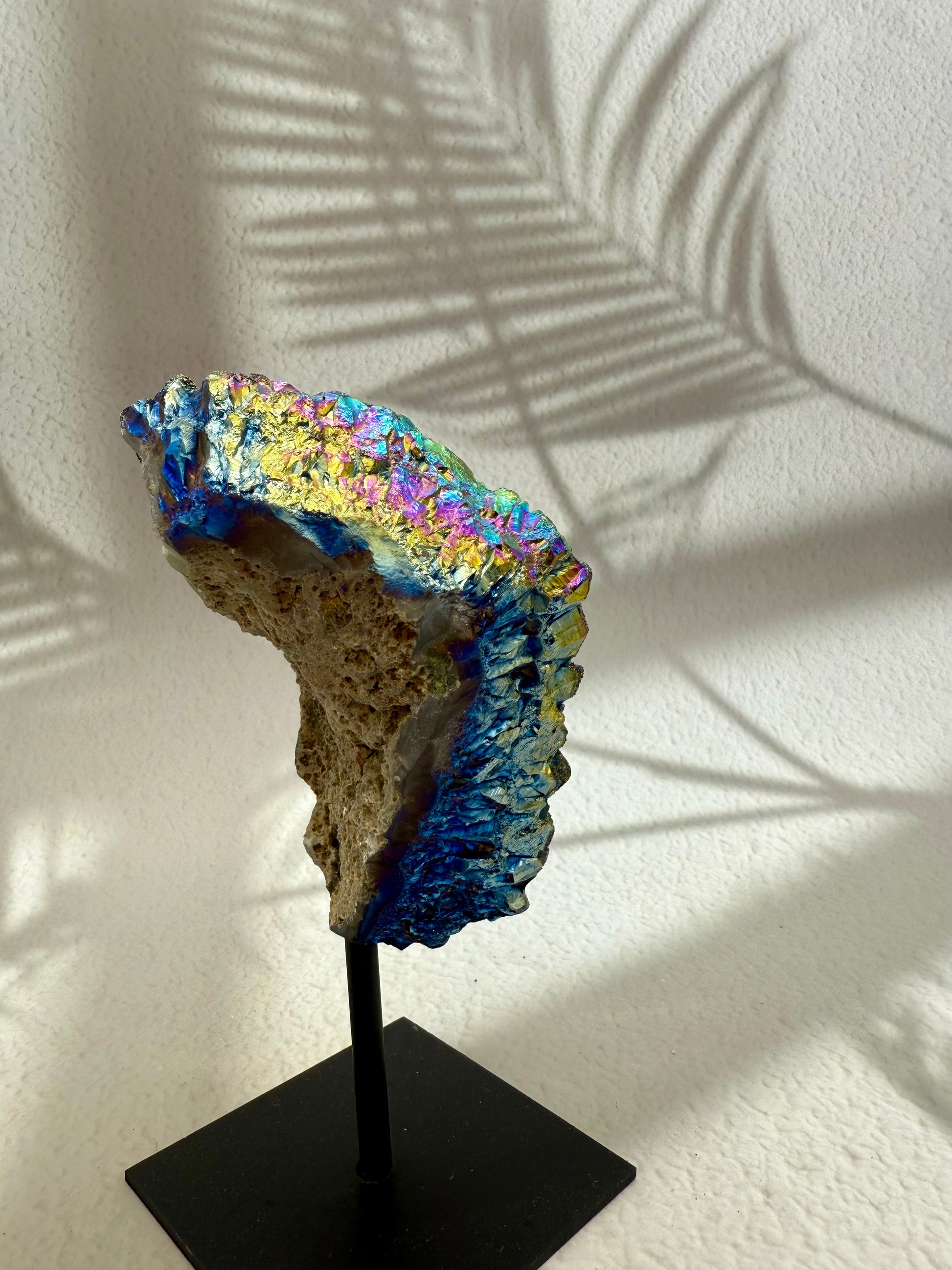 Dieser strahlende Titaniumquarz auf einem eleganten Metallständer vereint natürliche Kristallkraft mit stilvoller Präsentation. Die funkelnden Oberflächen in Blau-, Violett- und Regenbogentönen ziehen alle Blicke auf sich und machen den Quarz zu einem beeindruckenden Blickfang. Auf dem Ständer präsentiert, wird er zu einem dekorativen Highlight und zugleich zu einem kraftvollen Energiespender für dein Zuhause oder deinen Arbeitsplatz.